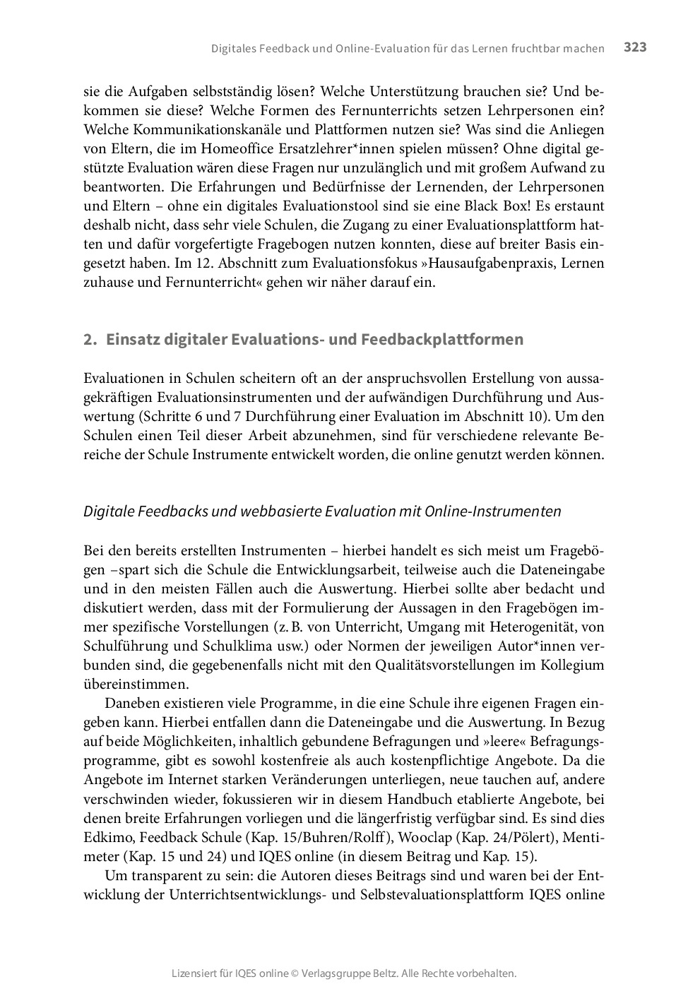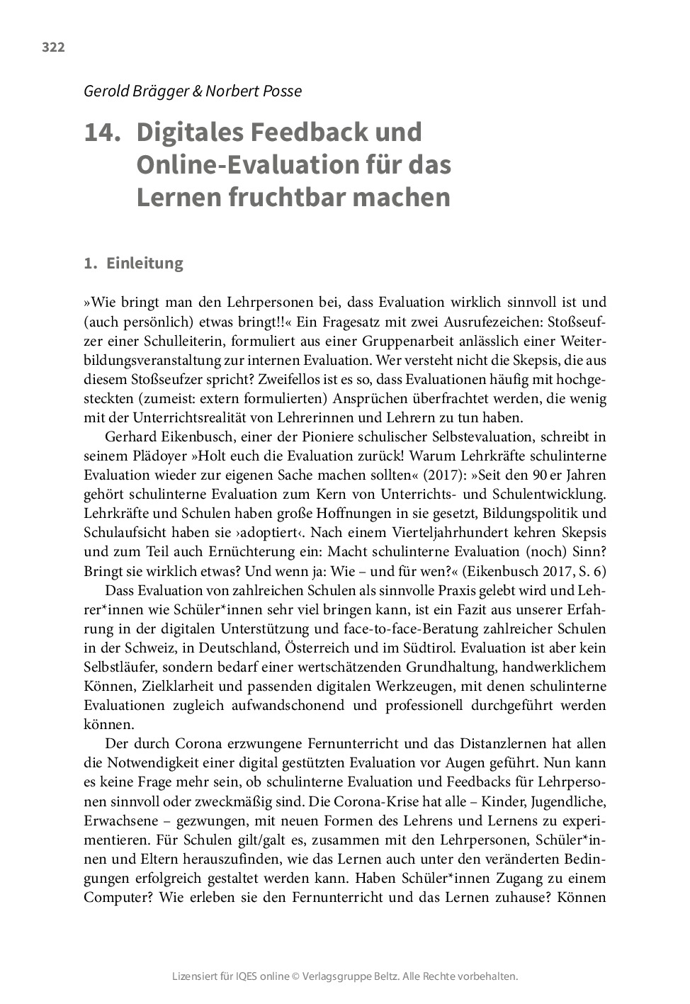 Was sind ermutigende Ansätze, wie Feedback und Selbstevaluation für das Lernen der Schüler:innen, für die Zusammenarbeit in Unterrichtsteams und damit für das Lernen der Schule fruchtbar gemacht werden können? Was muss eine Evaluations- und Feedbackplattform bieten, damit sie Schulleitende und Lehrpersonen bei der Schul- und Unterrichtsentwicklung, bei der Reflexion der eigenen Praxis, bei der Beteiligung der Schulpartner oder bei der Rechenschaftslegung wirksam unterstützen kann? Und wie können personenbezogene Feedbacks und schulinterne Evaluationen mit digitalen Tools erfolgreich gestaltet werden? Der Beitrag von zwei Pionieren einer digital gestützten schulischen Evaluationskultur zeigt bewährte Handlungsperspektiven auf.