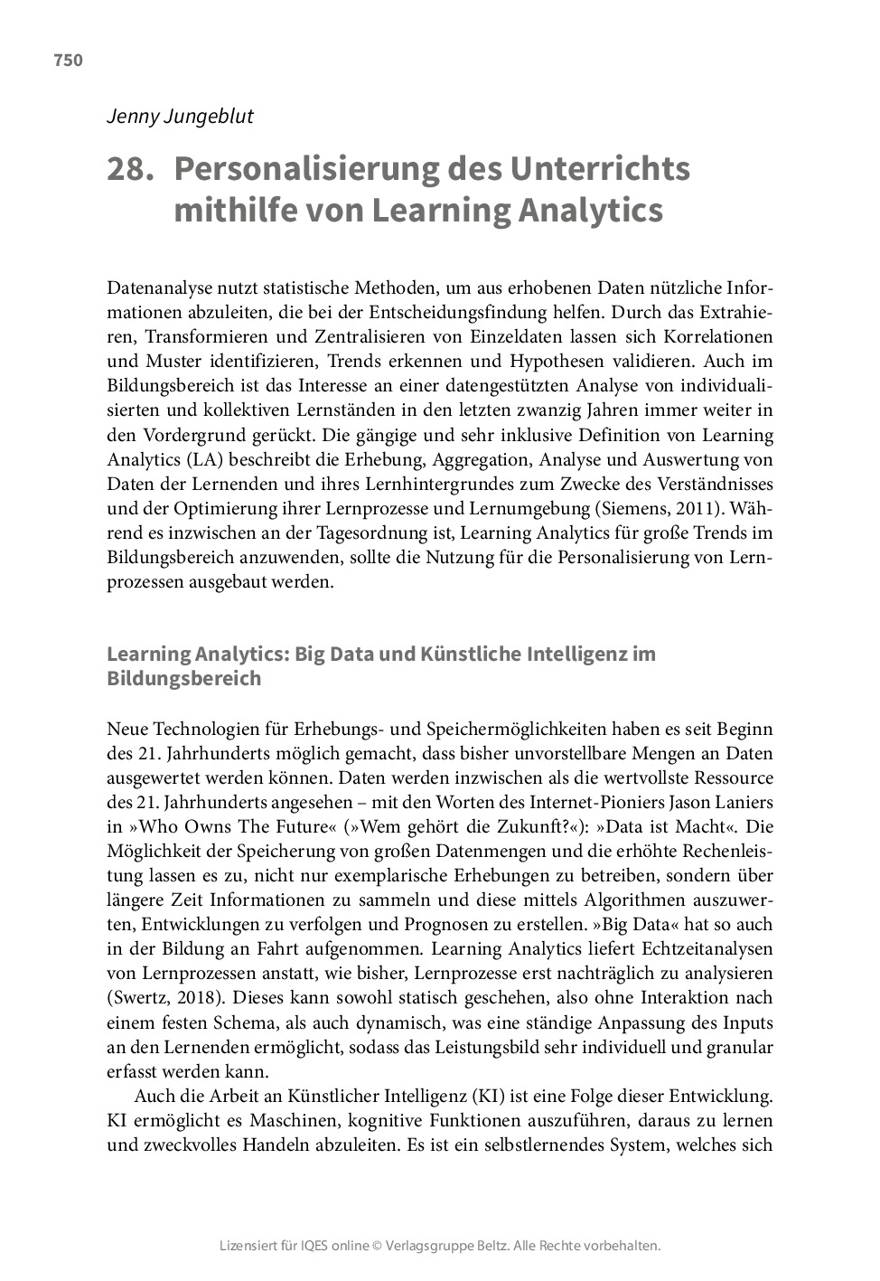 Eines der aktuell umfangreichsten Handbücher zur Unterrichts- und Schulentwicklung in der digitalen Welt wird von Gerold Brägger und Hans Gunter Rolff unter dem Titel Handbuch Lernen mit digitalen Medien herausgegeben. In insgesamt 36 Beiträgen bietet der Band auf 973 Textseiten vielfältige Antworten auf die Frage, wie die Gestaltung von Unterricht mit digitalen Medien erfolgen kann. Das Handbuch vereint dafür u. a. Perspektiven der praktischen und wissenschaftlichen Schulentwicklung, der Medienpädagogik und der Bildungswissenschaften. Durch die Aufteilung der Beiträge in sechs Themenblöcke wird eine nachvollziehbare Struktur geboten. Zu Beginn des Buches werden grundlegende Fragen des Lernens in Zeiten der Digitalisierung (Teil 1) thematisiert, beispielsweise zu den sich wandelnden Rahmenbedingungen der Kindheit und der Schulentwicklung im Kontext der Digitalisierung. Die weiteren Teile des Buches widmen sich pädagogischen Konzepten zur Entwicklung einer kompetenzorientierten und mediengestützten Lernkultur (Teil 2), dem personalisierten Lernen und den Potenzialen von Learning Analytics, das heißt der Nutzung von Daten zur Unterstützung der Lernenden (Teil 3), dem Einsatz digitaler Medien in Schule und Unterricht (Teil 4) sowie der Gestaltung kompetenzorientierter Lernprozesse (Teil 5). Zum Abschluss formulieren die Herausgeber im sechsten Teil des Buches ein Fazit und verdichten die Vielzahl an Beiträgen zu 20 Leitorientierungen.