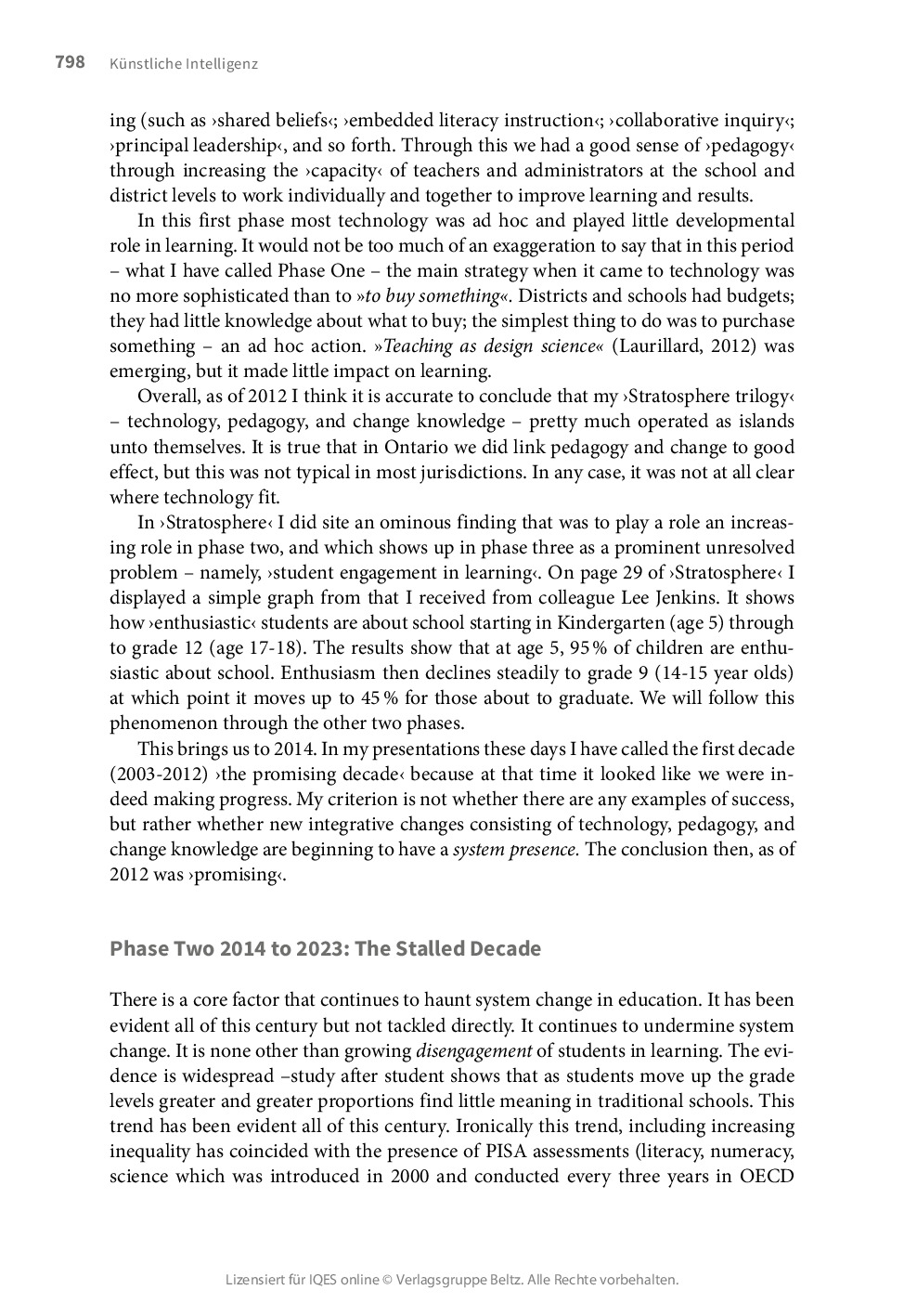 Womöglich eröffnen sich auch dankbare Felder für große Stiftungen, indem sie Pilotprojekte voranbringen können. Das Ganze spielt in einer überkomplexen Situation, die Steuerungswirkung entspricht der Trägheit eines Supertankers. Die Situation trifft alle gleich: Lehrpersonen, wenn es um ihre persönliche berufliche Entwicklung und ihren Unterricht geht, Schulleitungen und Teams sowie Bildungsträger und Politik, wenn sie weitreichende Entscheidungen zur konzeptuellen Weiterentwicklung treffen müss(t)en. Mit zu viel Ungewissheit bleibt die Entscheidungsfreudigkeit gehemmt. Wer sich einen Überblick zur aktuellen Situation machen möchte oder muss und sich ernsthaft mit dem Thema Digitalisierung in der Bildung beschäftigt, ist mit diesem reichhaltigen Handbuch gut bedient.