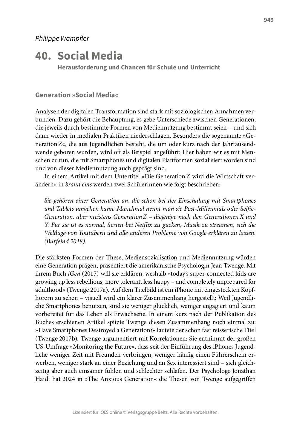 Philippe Wampfler beschreibt in seinem Beitrag, wie Jugendliche digitale Medien nutzen, und fragt danach, wie sich Social Media auf junge Menschen auswirken. Er gibt didaktische Hinweise, wie Ressourcen aus Social Media im Fachunterricht eingesetzt und Lernprozesse gestaltet werden können. Im Anschluss lässt er an Überlegungen teilhaben, wie Schulen digital nach außen kommunizieren und wie sie digitale Öffentlichkeitsarbeit mit Social Media gestalten können. Der Beitrag schliesst mit einem praxisorientierten Leitfaden zum Umgang mit Social Media in der Schule. Eine Vorlage, die an Schulen an die spezifischen Gegebenheiten (rechtliche Vorgaben, Profil der Schule, Eigenheiten der Schülerschaft, Erwartungen der Eltern etc.) angepasst werden kann und muss.