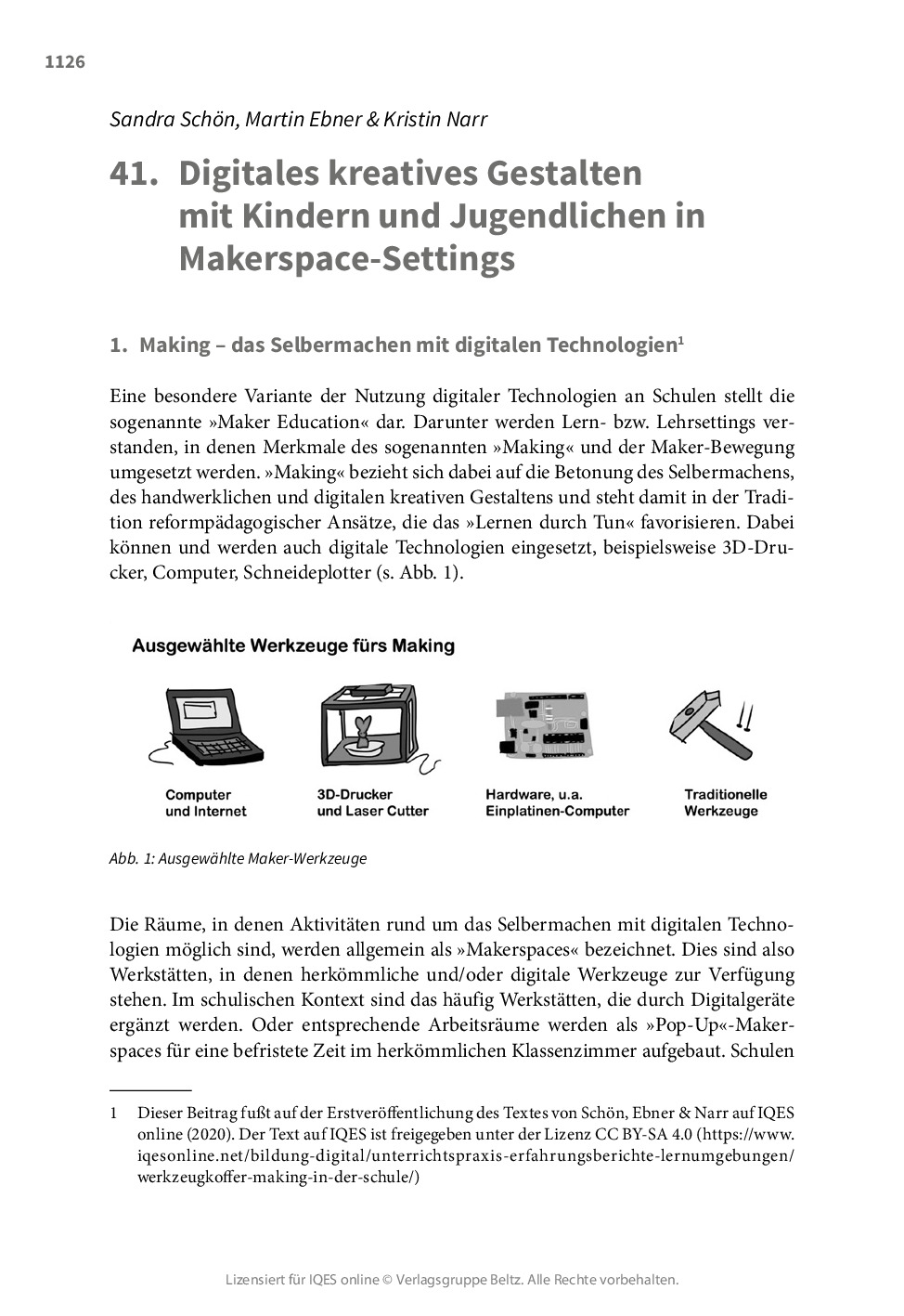 Eine besondere Variante der Nutzung digitaler Technologien an Schulen stellt die sogenannte »Maker Education« dar. Darunter werden Lern- bzw. Lehrsettings verstanden, in denen Merkmale des sogenannten »Making« und der Maker-Bewegung umgesetzt werden. »Making« bezieht sich dabei auf die Betonung des Selbermachens, des handwerklichen und digitalen kreativen Gestaltens und steht damit in der Tradition reformpädagogischer Ansätze, die das »Lernen durch Tun« favorisieren. In diesem Beitrag beschreiben die Autor*innen die Hintergründe und didaktischen Prinzipien der Maker Education und ausgewählte Werkzeuge. Im weiteren Text geben sie einen Überblick auf methodisch-didaktische Varianten. Der Beitrag schließt mit Handlungsempfehlungen für die Umsetzung von Maker Education in der Schule.