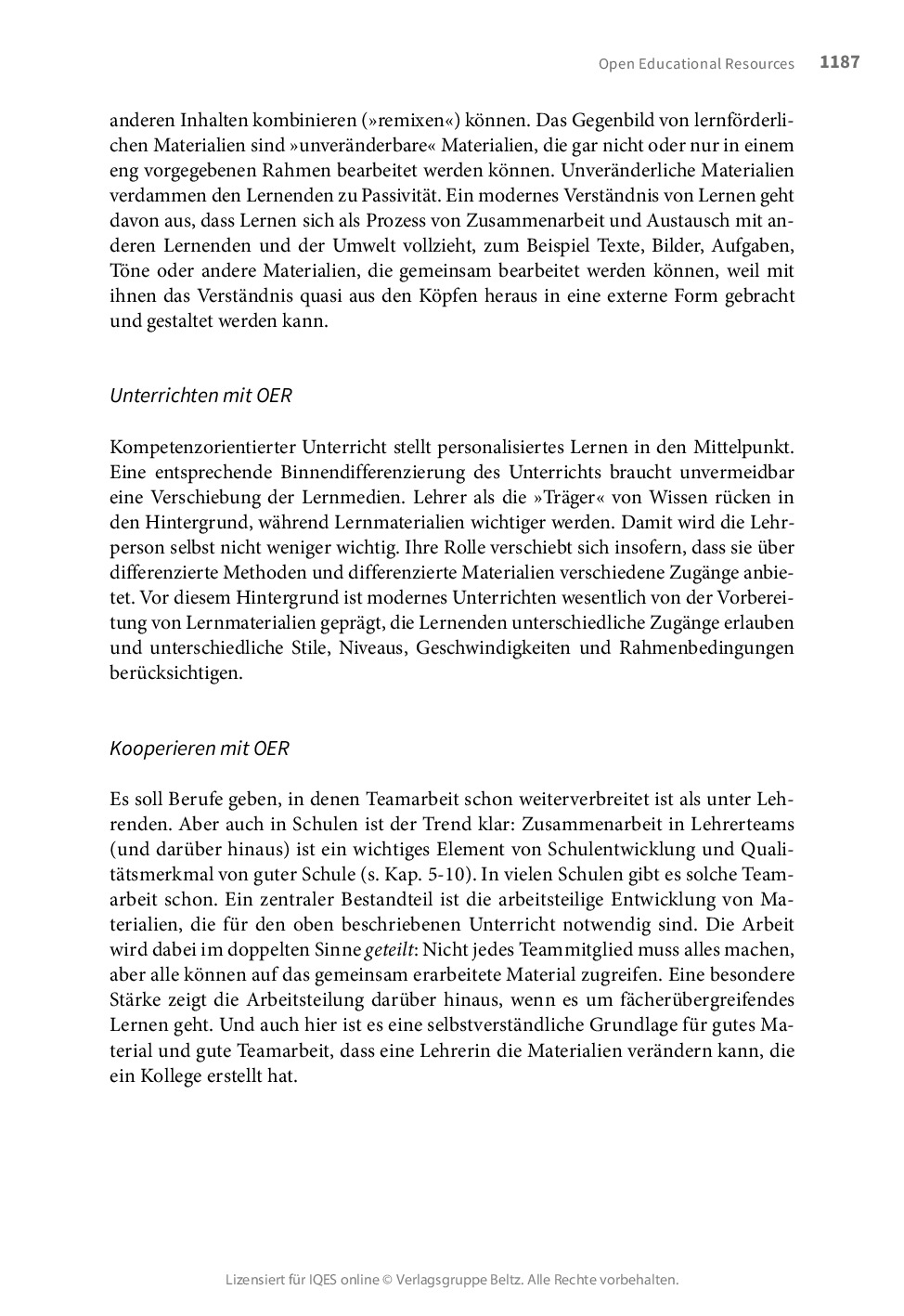 Open Educational Resources (OER) sind frei lizenzierte Bildungsmaterialien. Sie können von unterschiedlichen Akteuren erstellt werden. Häufig sind dies Lehrpersonen in den verschiedenen Bildungsbereichen, aber auch Stiftungen, Firmen, Organisationen und nicht zuletzt auch Lernende können OER veröffentlichen. Freie Lizenzen sind das Rückgrat von offenen und freien Inhalten. In diesem Beitrag beantworten Sonja Borski, Jöran Muuß-Merholz und Nele Hirsch, Pionier*innen der OER-Community, die Fragen: Wozu braucht wer Open Educational Resources (OER)? Was steht hinter der Idee offener Bildungsressourcen? Welche Nutzungsrechte gibt es? Wie hilft mir das kleine Einmaleins der Creative Commons-Lizenzen beim Suchen und Finden, beim Einsetzen und Remixen von Unterrichtsmaterialien? Wie können OER zu Medienkompetenz und zeitgemäßem Unterricht beitragen?
