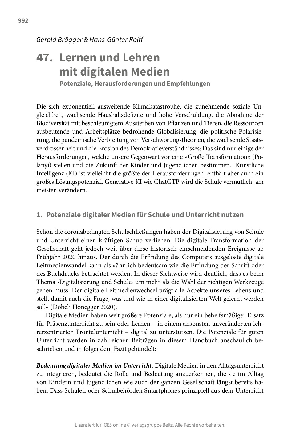 Gerold Brägger und Hans-Günter Rolff betonen die Notwendigkeit, digitale Medien in den Unterricht zu integrieren, um die realen, digital geprägten Lebenswelten der Schüler:innen anzusprechen und zu reflektieren. Digitale Medien bieten nicht nur Zugang zu einer fast unbegrenzten Menge an Informationen, sondern ermöglichen auch eine Differenzierung des Lernens, die individuelle Lernwege und Selbstständigkeit fördert. Besonders hervorgehoben wird die Bedeutung von künstlicher Intelligenz (KI) in der Bildung, die, obwohl sie große Chancen bietet, auch kritisch hinsichtlich ethischer Aspekte betrachtet werden muss. Die Autoren argumentieren, dass der erfolgreiche Einsatz digitaler Medien eine gründliche pädagogische Begleitung und die Anpassung von Lehrplänen und Prüfungsmethoden erfordert, um eine zeitgemäße Bildung zu gewährleisten. Sie bündeln ihr Fazit in folgenden Forderungen: (1) Potenziale digitaler Medien für Schule und Unterricht nutzen; (2) Wachsender Newsabstinenz und Polarisierung durch die Sozialen Medien begegnen; (3) Die disruptiven Folgen generativer Machine-Learning-Systeme refletieren; (4) Sich über zeitgemäße Bildung verständigen – Kompetenz- und Leistungsbegriff erweitern; (5) Digital orientierte Lernkultur fördern – Personalisiertes Lernen mit Kooperativem Lernen verbinden; (6) Kapazität für Schulentwicklung schaffen – Schulleitung und Teamarbeit stärken; (6) Kompetenzorientierte Unterrichtsentwicklung im Zeitalter der digitalen Transformation fördern; (7) Kompetenzorientierte Unterrichtsentwicklung im Zeitalter der digitalen Transformation fördern; (8) Technische Infrastruktur für eine zeitgemäße Bildung bereitstellen; (9) Schüler:innen aus bildungsfernen Schichten stärker fördern – Bildungsungleichheiten mindern; (10) Blended Learning-Ansätze (weiter-)entwickeln; (11) Herausforderungen aktiv begegnen.