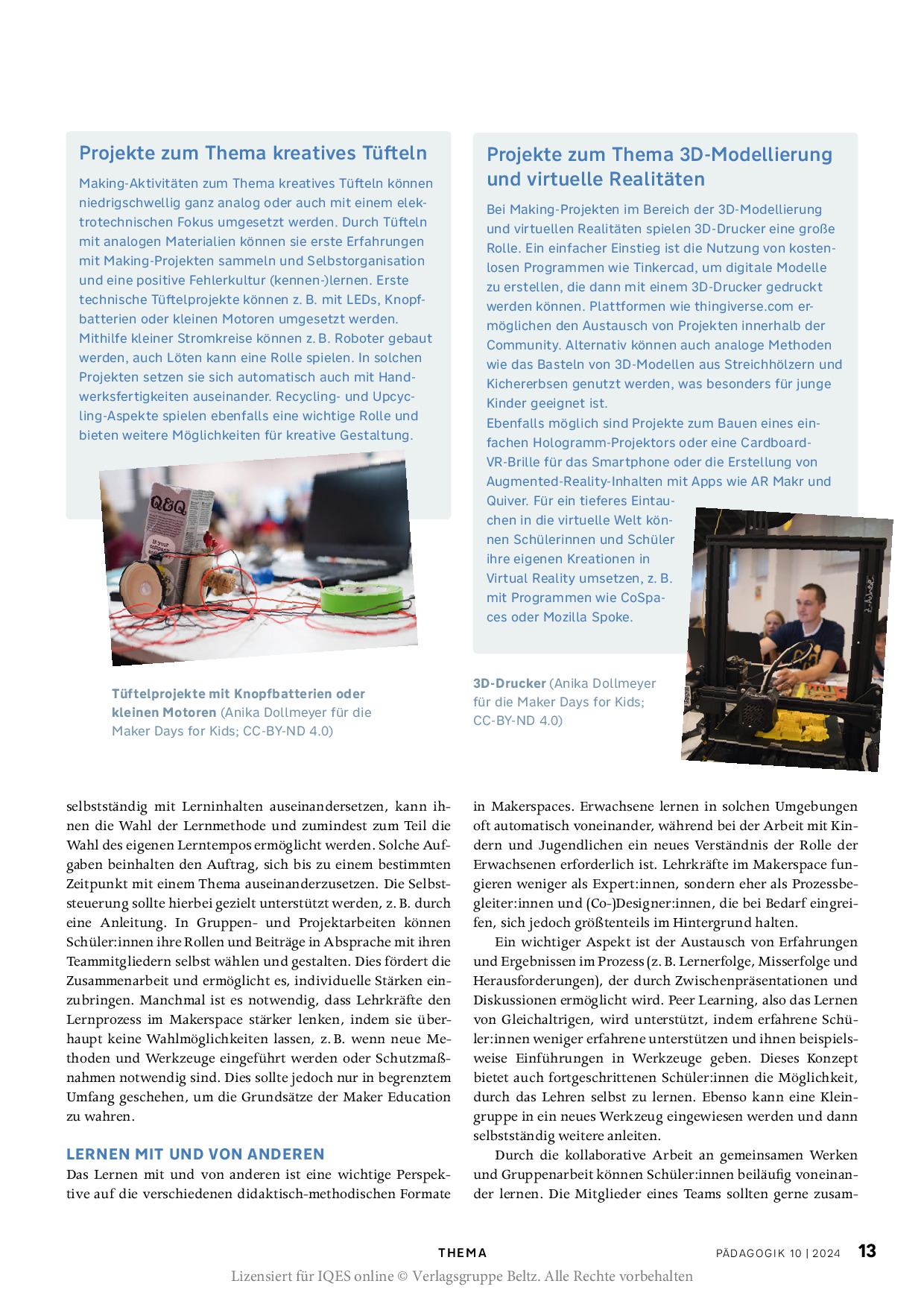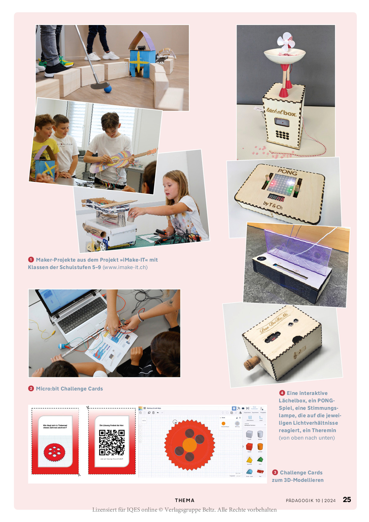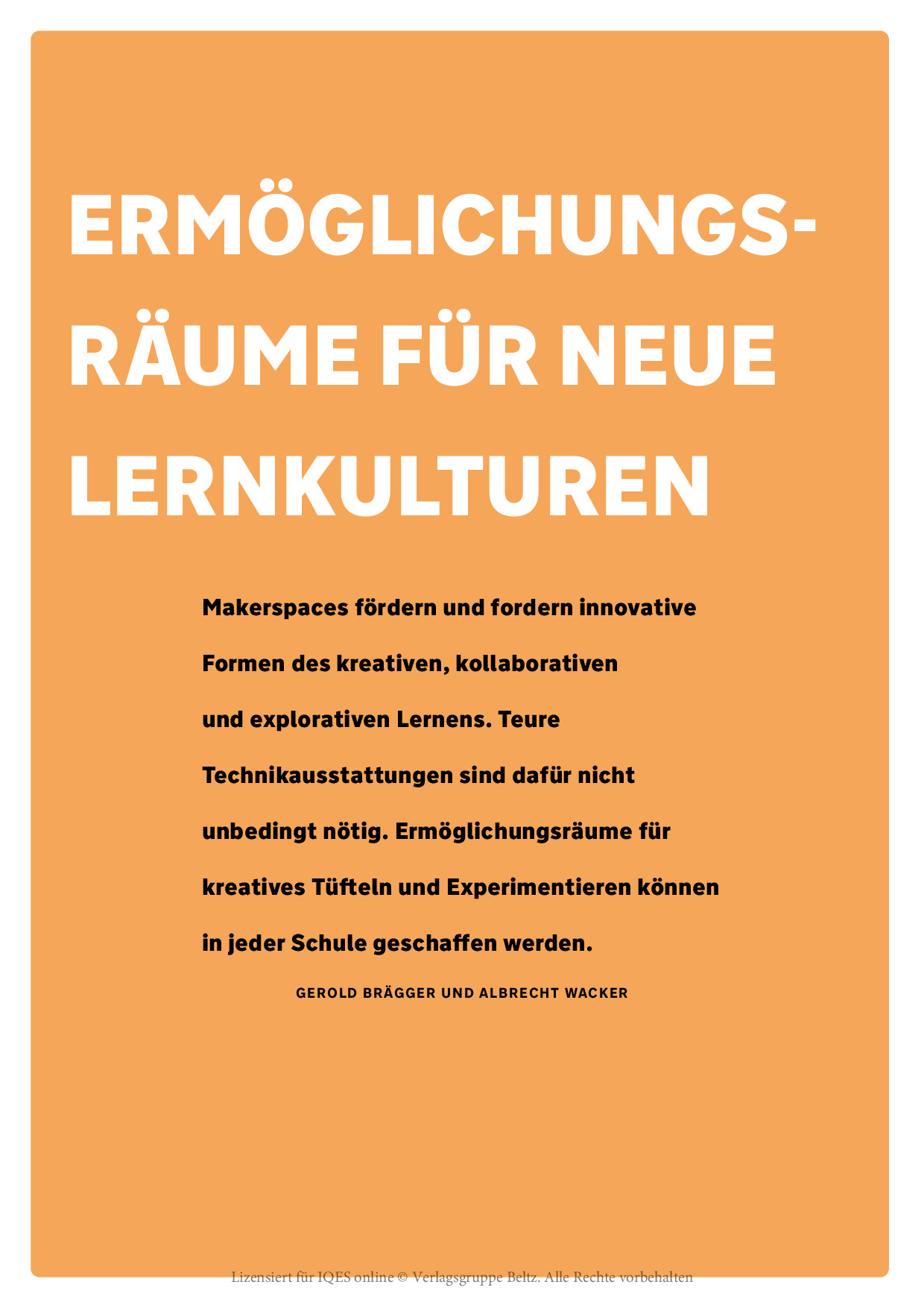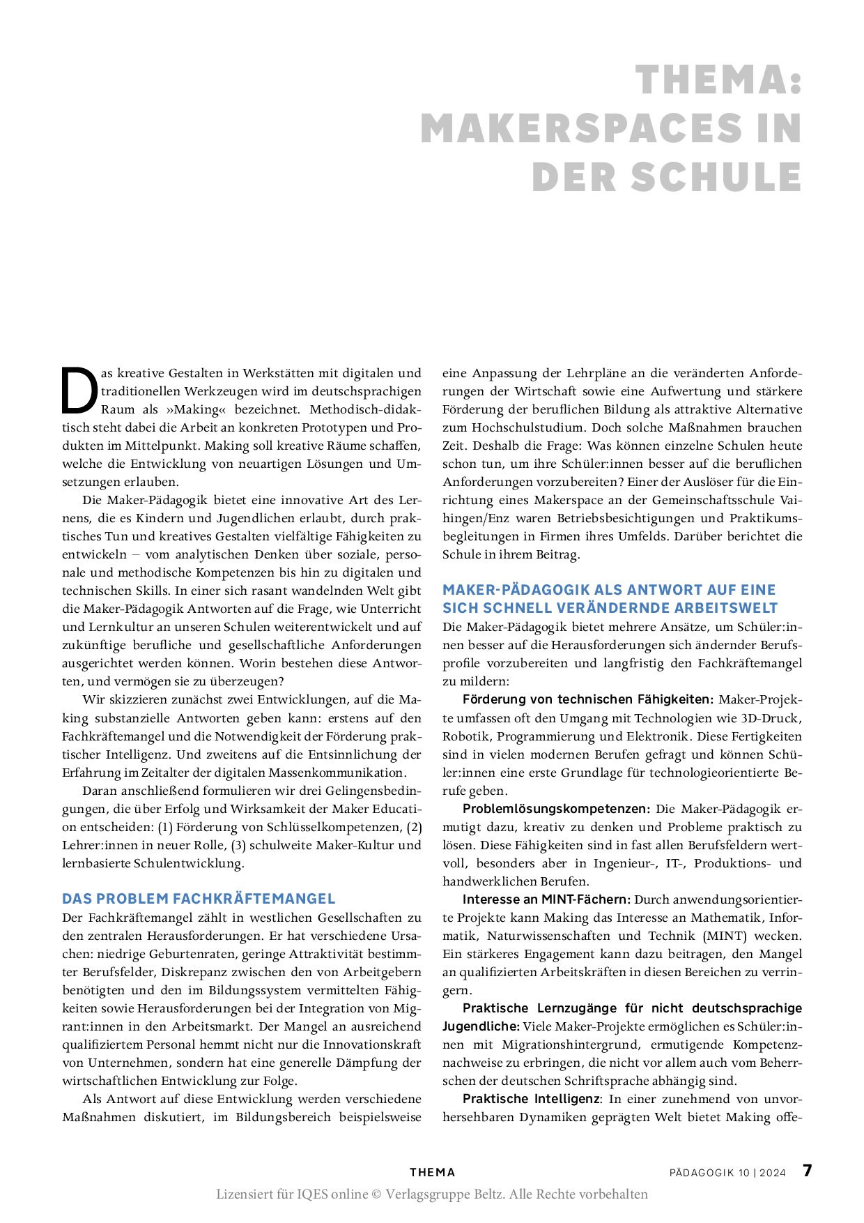 Dieser PÄDAGOGIK-Schwerpunkt ist einem der dynamischsten Trends im Bildungsbereich gewidmet: der Maker Education. Das Heft bietet Einblicke in Didaktik und Praxis der Maker-Pädagogik und zeigt auf, wie Makerspaces erfolgreich schulweit eingeführt werden können. Unsere Expertinnen und Experten beleuchten innovative Methoden wie Challenge Cards und hilfreiche Ressourcen, um Schüler:innen Räume für kreatives technisches Gestalten und exploratives Lernen zu bieten.