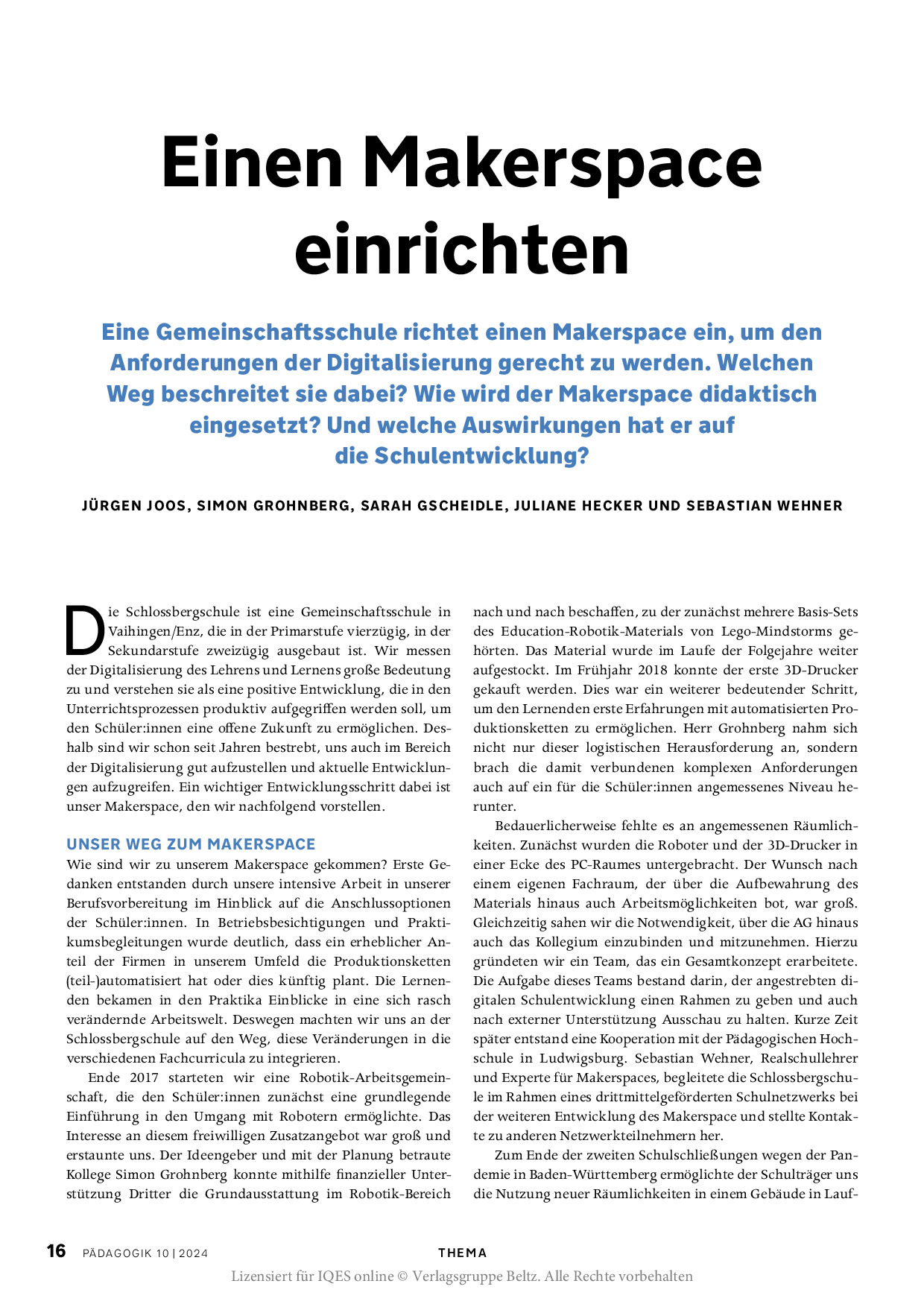 Eine Gemeinschaftsschule richtet einen Makerspace ein, um den Anforderungen der Digitalisierung gerecht zu werden. Welchen Weg beschreitet sie dabei? Wie wird der Makerspace didaktisch eingesetzt? Und welche Auswirkungen hat er auf die Schulentwicklung?