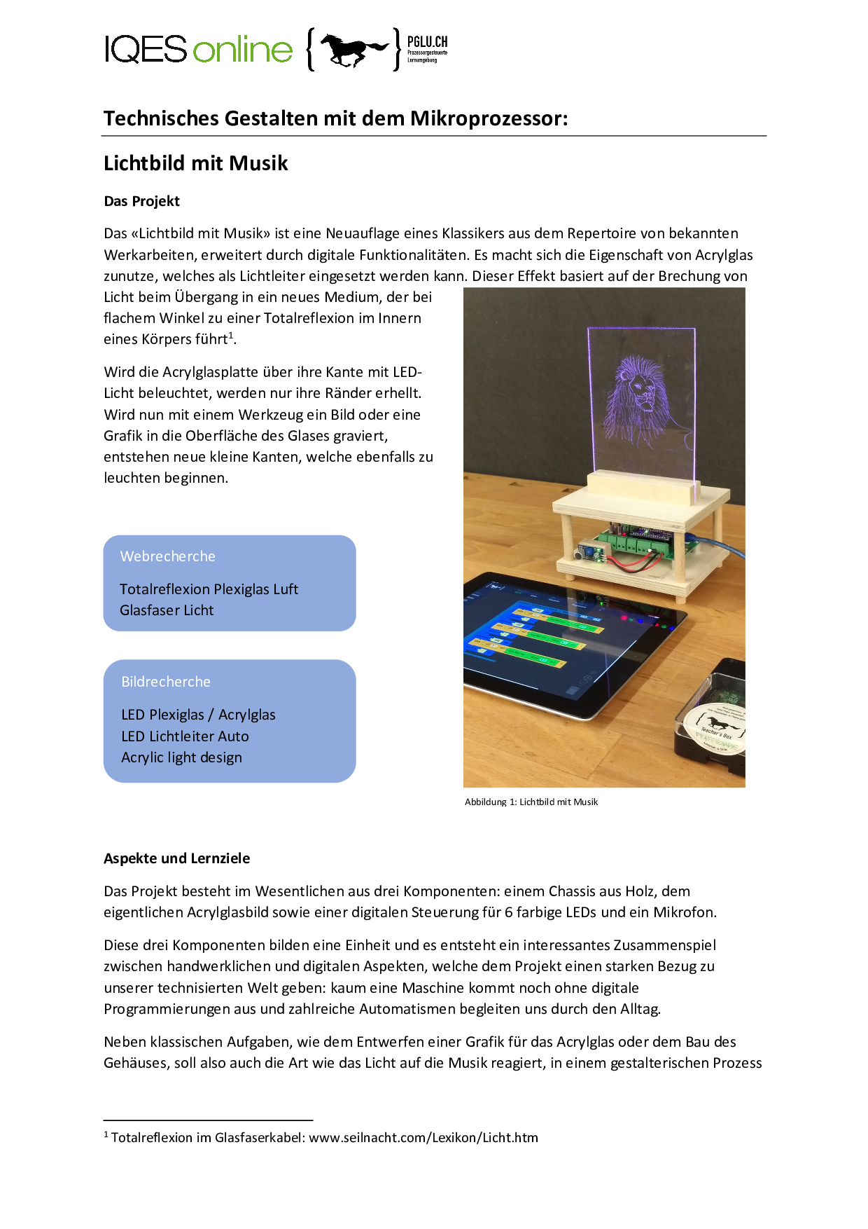Hier wird eine Unterrichtseinheit für eine moderne Werkarbeit im Umfang von circa 15 Doppellektionen zur Verfügung gestellt, bei der ein Lichtbild in eine Acrylglas-Platte gezeichnet wird. Das Projekt Lichtbild mit Musik ist die Neuauflage eines Klassikers aus dem Repertoire von bekannten Werkarbeiten, erweitert durch digitale Funktionalitäten.
