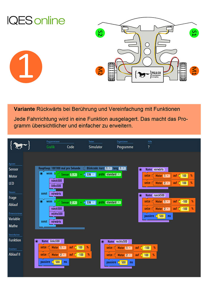 In dieser klassischen Robotik-Aufgabe mit zwei Motoren und zwei Sensoren soll ein einfaches Fahrzeug gebaut werden, welches sich in einem Raum mit Hindernissen selbständig zurechtfinden kann. Sie eignet sich für Lerngruppen ab dem 6. Schuljahr und kann in den unterschiedlichsten Schwierigkeitsgraden durchgeführt werden. Die einfachste Grundaufgabe «Fahre durch den Raum und weiche selbständig den Hindernissen aus» lässt sich mit einfachen Mitteln umsetzen. Erweiterungen und Variationen mit Bezügen zur Autowelt lassen eine Gestaltung ganz nach den eigenen Bedürfnissen zu.