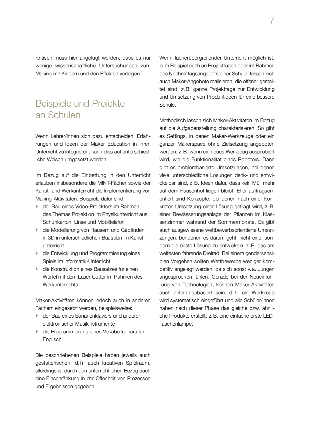 Eine erfahrene Lehrperson zeigt, wie eine Making-Kultur an der eigenen Schule aufgebaut werden kann. Schulleitungen, Steuergruppen oder Lehrpersonen, welche sich schrittweise auf den Weg zu einer innovativen Schulentwicklung dieser Art begeben, finden in einem Making-Stufenmodell Orientierung. Der Leitfaden bietet Handlungsempfehlungen für die Förderung von Schlüsselkompetenzen und Skills für das Lernen in (Maker- und Medien-)Projekten. Er skizziert exemplarische Making-Curricula für alle Schulstufen und bringt frische Ideen für eine Lernkultur, die durch erlebte Selbstwirksamkeit Kinder und Jugendlichen auf ihre Zukunft vorbereitet.