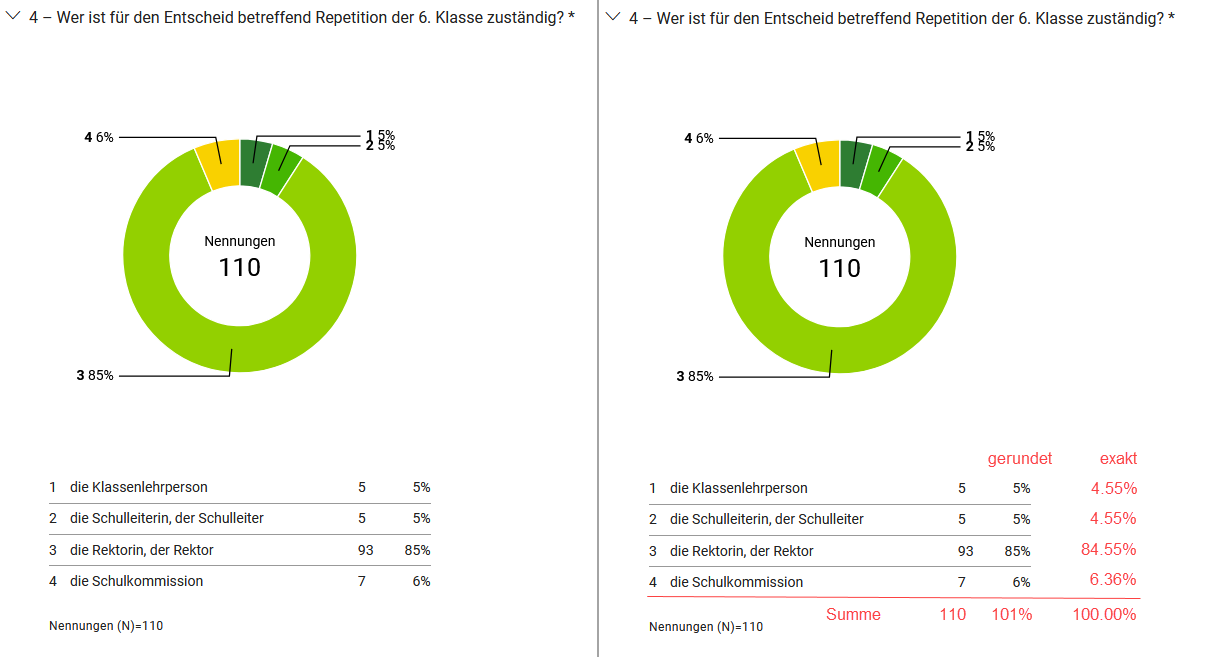 Damit der Bericht gut gelesen werden kann, wird der prozentuale Anteil der Antworten auf ganze Zahlen gerundet. Die Summe dieser gerundeten Zahlen ergibt in diesem Beispiel 101%. Rundet man auf zwei Dezimalstellen, beträgt die Summe 100%.