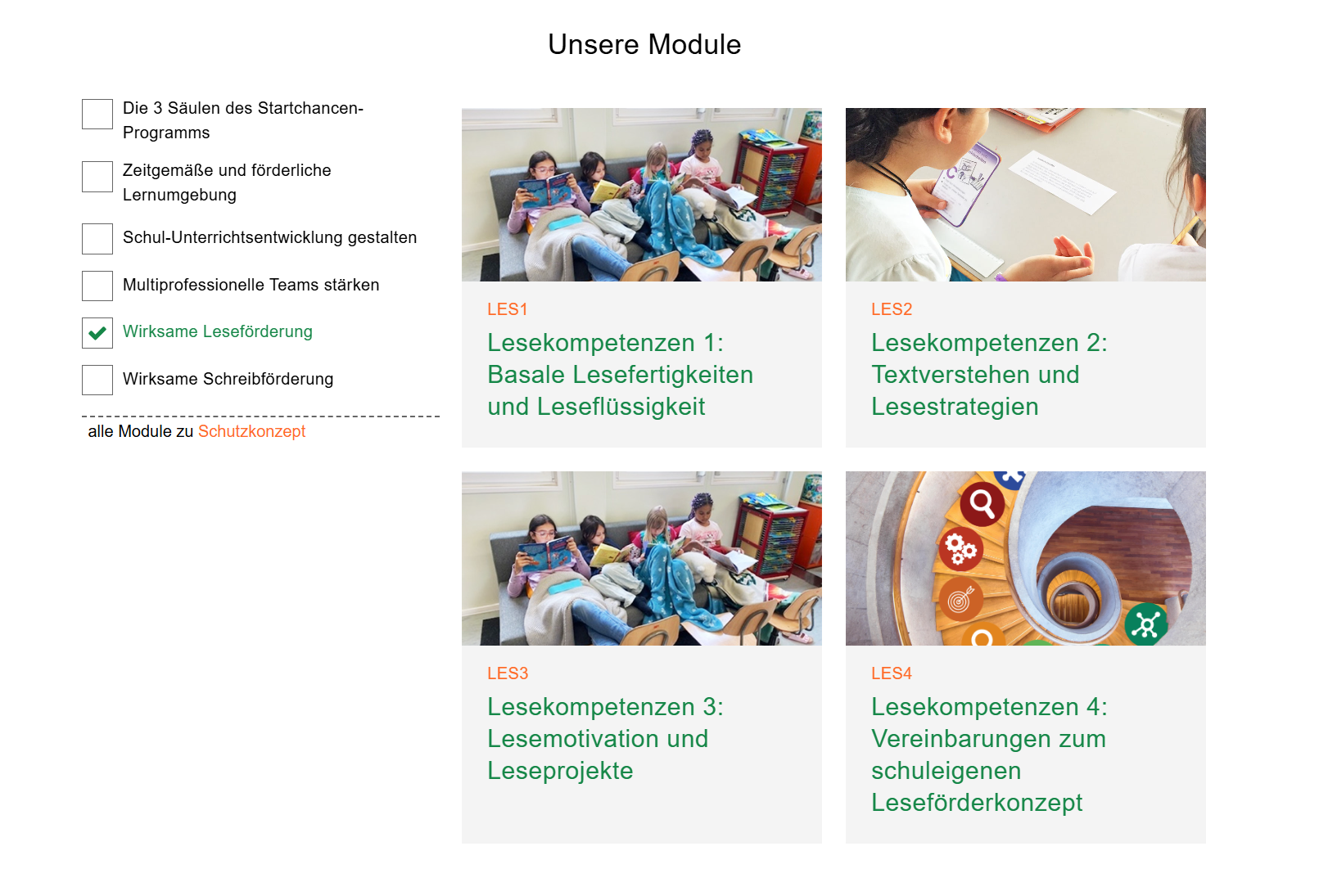 Die Weiterbildungsmodule fokussieren die Förderung der Sprachkompetenzen sowie praxisnahe Fortbildungen zur schulweiten Lese- und Schreibförderung.