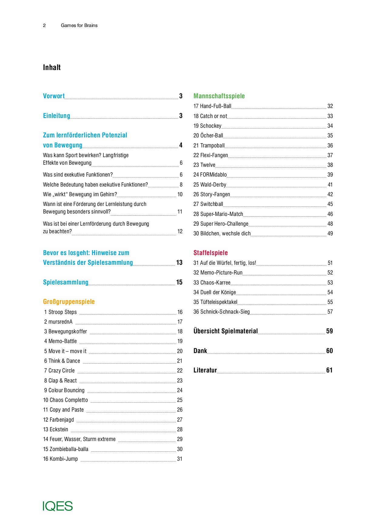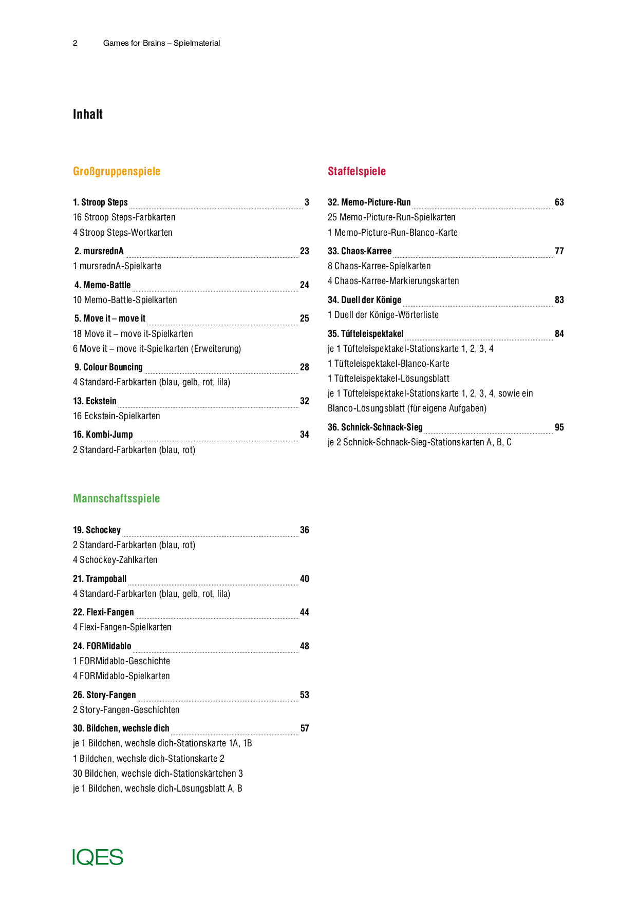 1 Stroop Steps • 2 mursrednA • 3 Bewegungskoffer • 4 Memo-Battle • 5 Move it – move it • 6 Think & Dance • 7 Crazy Circle • 8 Clap & React • 9 Colour Bouncing • 10 Chaos Completto • 11 Copy and Paste • 12 Farbenjagd • 13 Eckstein • 14 Feuer, Wasser, Sturm extreme • 15 Zombieballa-balla • 16 Kombi-Jump