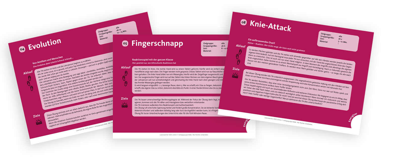 Die ersten 15 Karten gehören zur Kategorie »Energizer« und haben einen aktivierenden Charakter. Die vorgestellten Aktivitäten bringen den Kreislauf in Schwung und lockern die Stimmung auf. Im ebenfalls auf IQES veröffentlichten Kartenset Energizer & Co finden Sie weitere Energizer- Methoden. Die auf dieser Seite zur Verfügung stehenden Methoden bringen erlebnisorientierte Anteile mit sich und stellen eine gute Brücke zur zweiten Kategorie, den erlebnispädagogische Methoden, dar.
