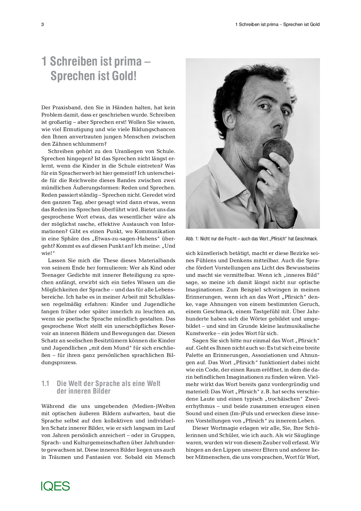 »Sagen Sie sich bitte nur einmal das Wort ›Pfirsich‹ auf. Geht es Ihnen nicht auch so: Es tut sich eine breite Palette an Erinnerungen, Assoziationen und Ahnungen auf. Das Wort ›Pfirsich‹ funktioniert dabei nicht wie ein Code, der einen Raum eröffnet, in dem die darin befindlichen Imaginationen zu finden wären. Vielmehr wirkt das Wort bereits ganz vordergründig und materiell: Das Wort ›Pfirsich‹ z. B. hat sechs verschiedene Laute und einen typisch ›trochäischen‹ Zweierrhythmus – und beide zusammen erzeugen einen Sound und einen (Im-)Puls und erwecken diese inneren Vorstellungen von ›Pfirsich‹ zu innerem Leben. Dieser Wortmagie erlagen wir alle, Sie, Ihre Schülerinnen und Schüler, wie ich auch. Als wir Säuglinge waren, wurden wir von diesem Zauber voll erfasst.«