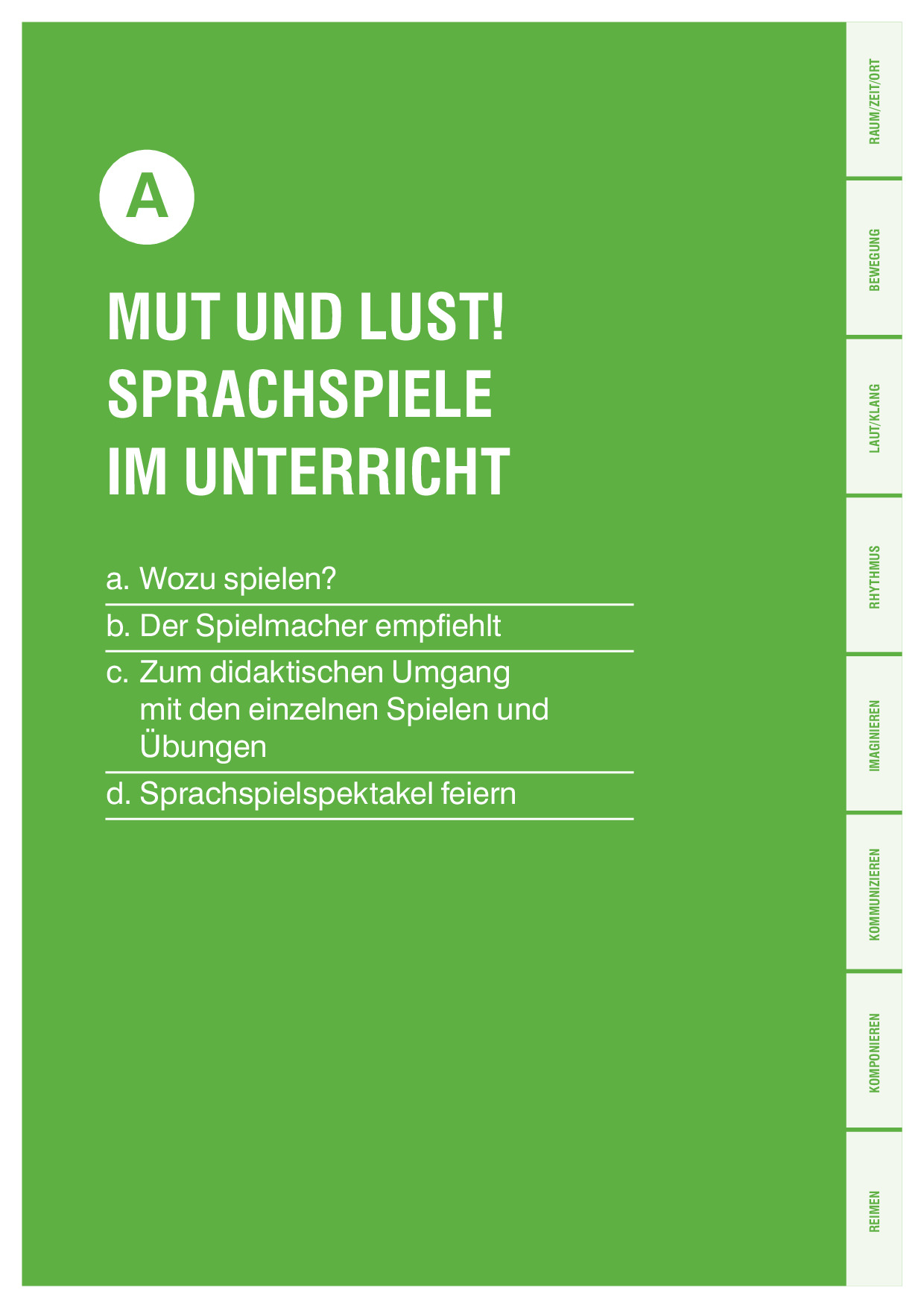 Der erste Hauptteil »Mut und Lust! – Sprachspiele« zeichnet sich durch seine besonders niedrigschwelligen und dennoch wirkungsvollen Zugänge zur Sprache aus.