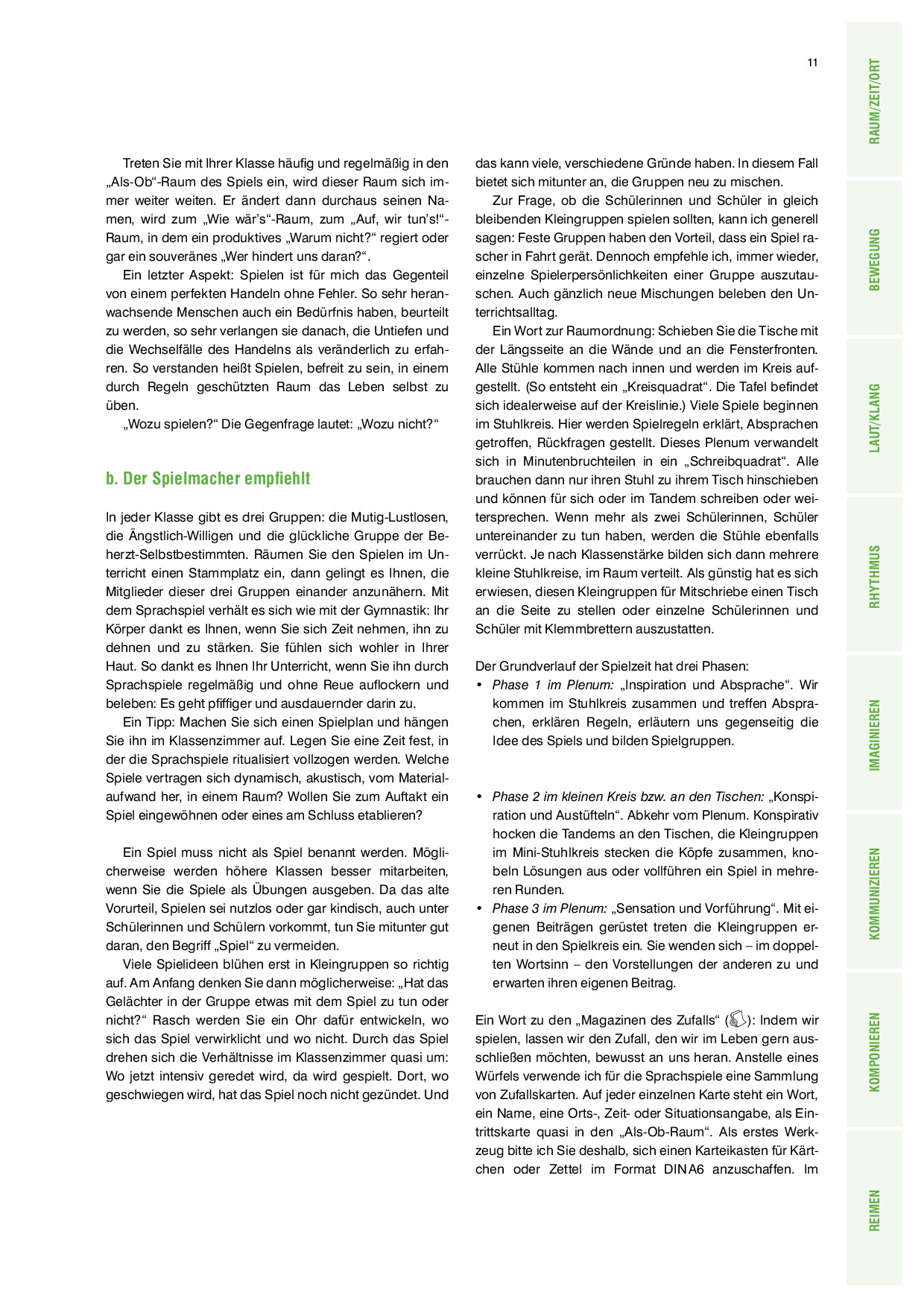 Die Spiele können sowohl spontan für 5–10 Minuten eingesetzt werden, um den Unterricht aufzulockern, als auch in längeren Einheiten zusammengefasst werden. Die Übungen bauen nicht zwingend aufeinander auf, sondern können flexibel nach Bedarf ausgewählt werden.