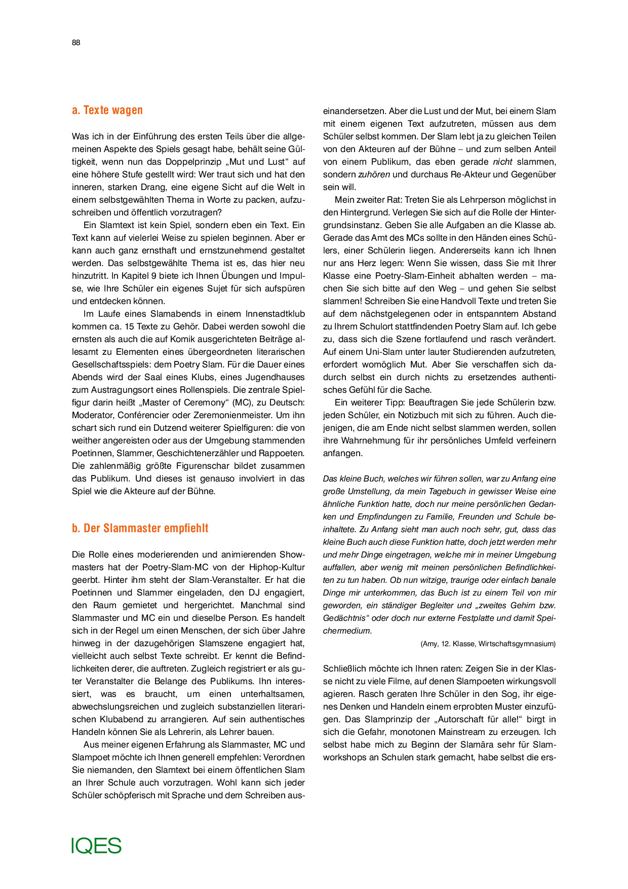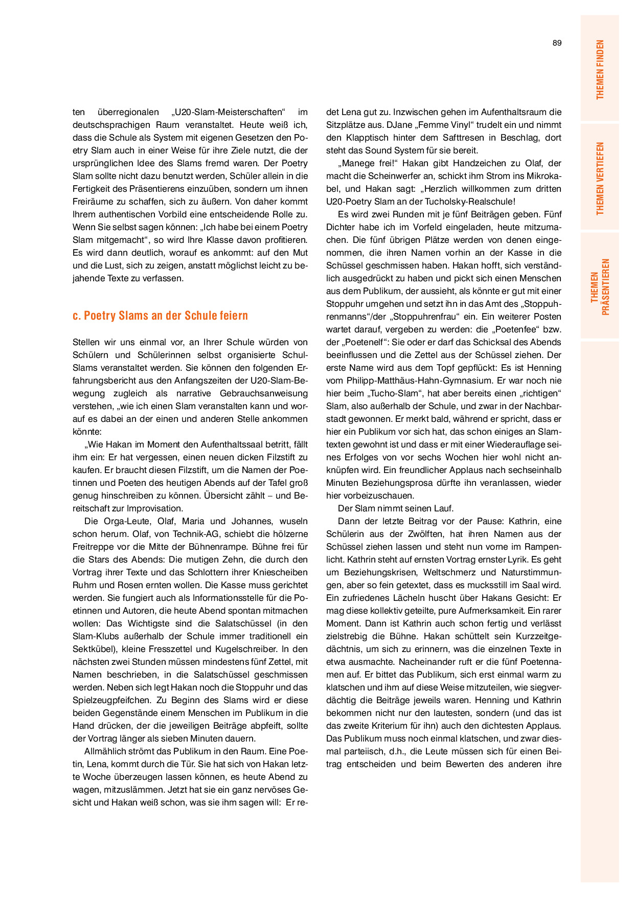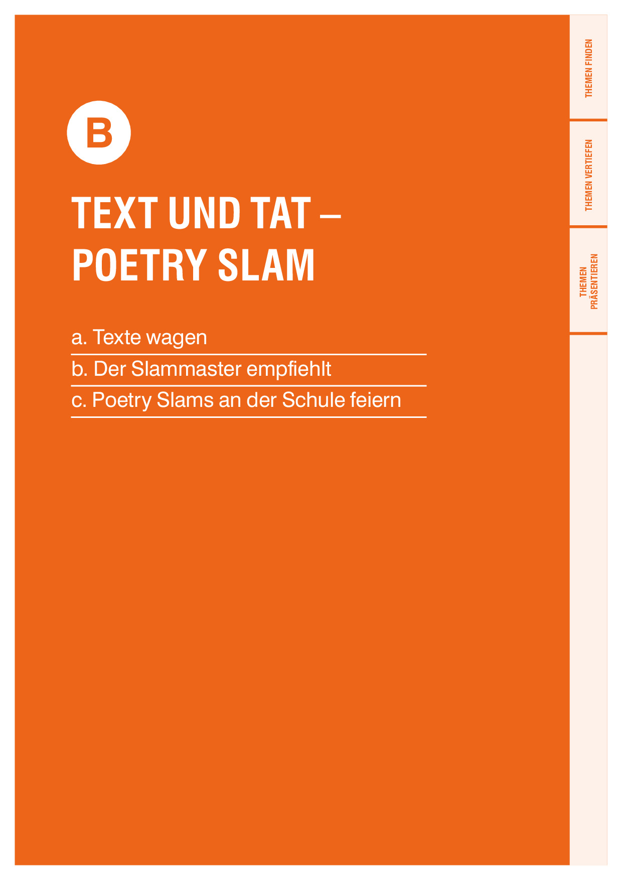 Der zweite Hauptteil führt in die Welt des Poetry Slams ein – einer modernen Form des literarischen Wettbewerbs, die besonders für Jugendliche attraktiv ist.