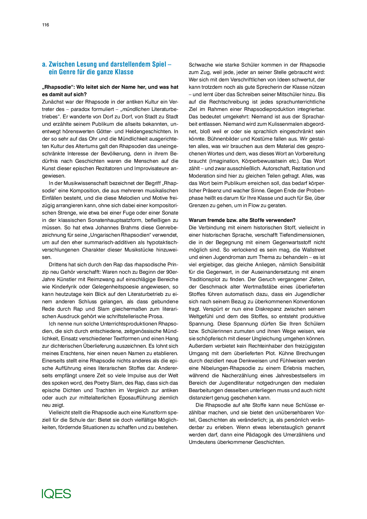 Der Begriff »Rhapsodie« hat seinen Ursprung in der antiken Kultur, wo der Rhapsodie ein Vertreter des »mündlichen Literaturbetriebes« war. Er wanderte von Ort zu Ort und erzählte seinem Publikum die allseits bekannten Götter- und Heldengeschichten. Heute bezeichnet die Rhapsodie eine Unterrichtsform, bei der Schülerinnen und Schüler einen literarischen Stoff kollektiv und kreativ aufarbeiten und vortragen. Durch die Einflüsse aus der Welt des Spoken Word, des Poetry Slam und des Rap zeigt sich die Rhapsodie in einer zeitgemäßen Form, die den Schülerinnen und Schülern ermöglicht, klassische Stoffe mit eigener Stimme zu interpretieren und zu präsentieren.