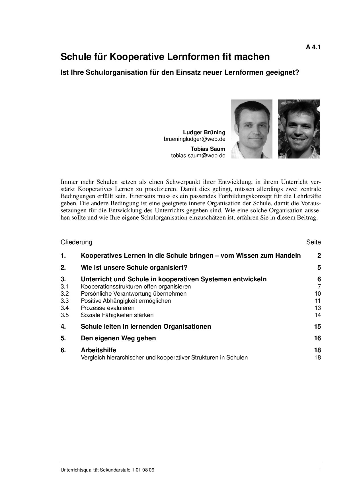 In diesem Beitrag geht es um die Umsetzung von Kooperativen Lernen in der eigenen Schule. Zentrale Bedingungen dafür sind eine geeignete innere Organisation der Schule sowie ein passendes Fortbildungskonzept für die Lehrkräfte.