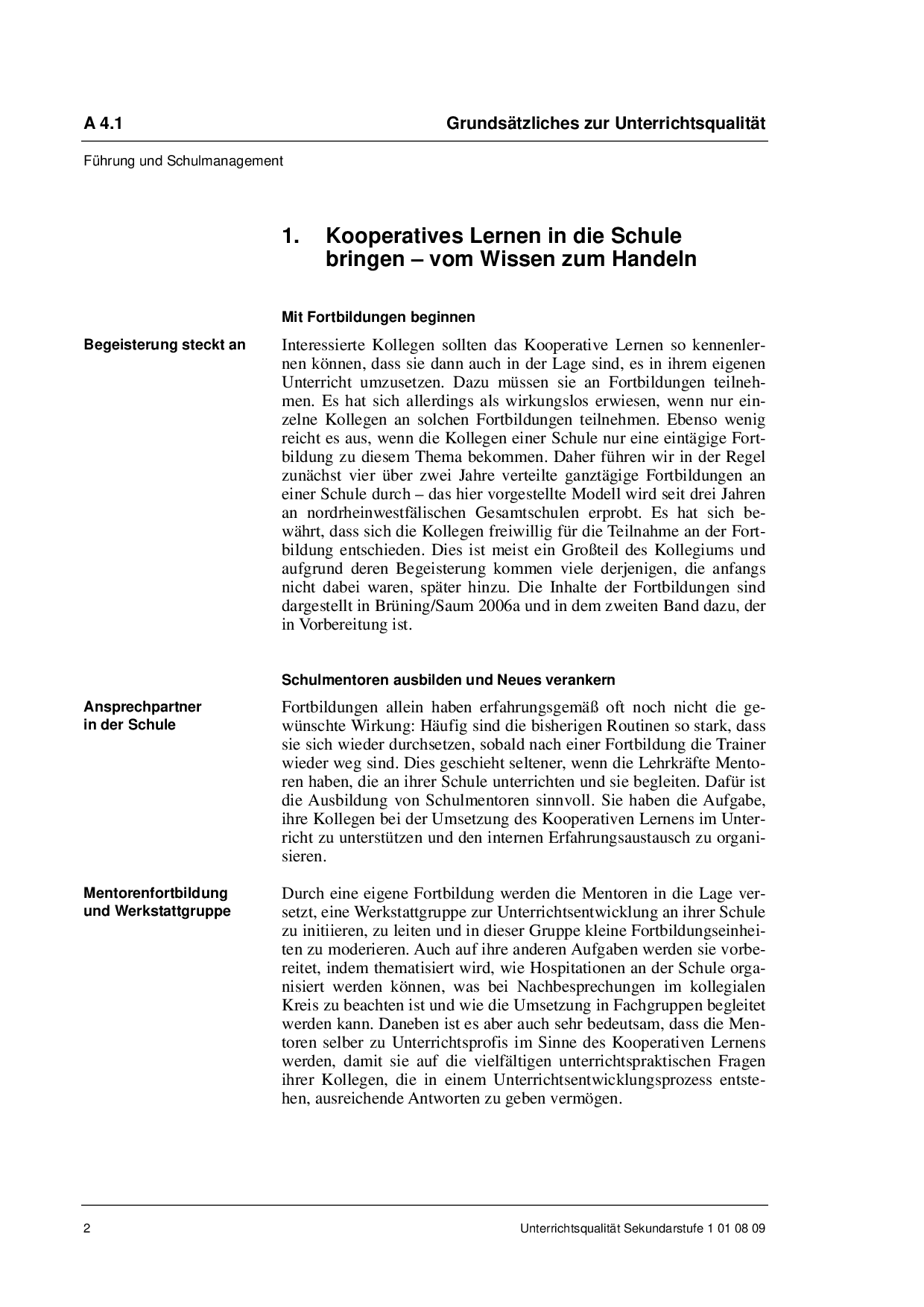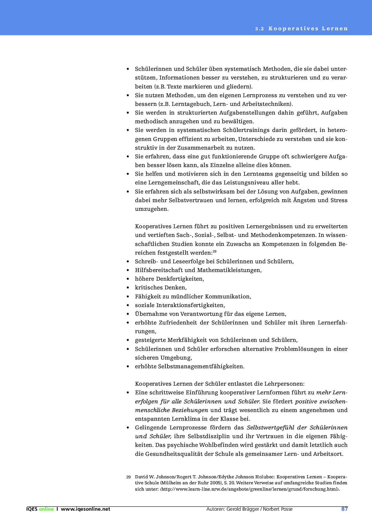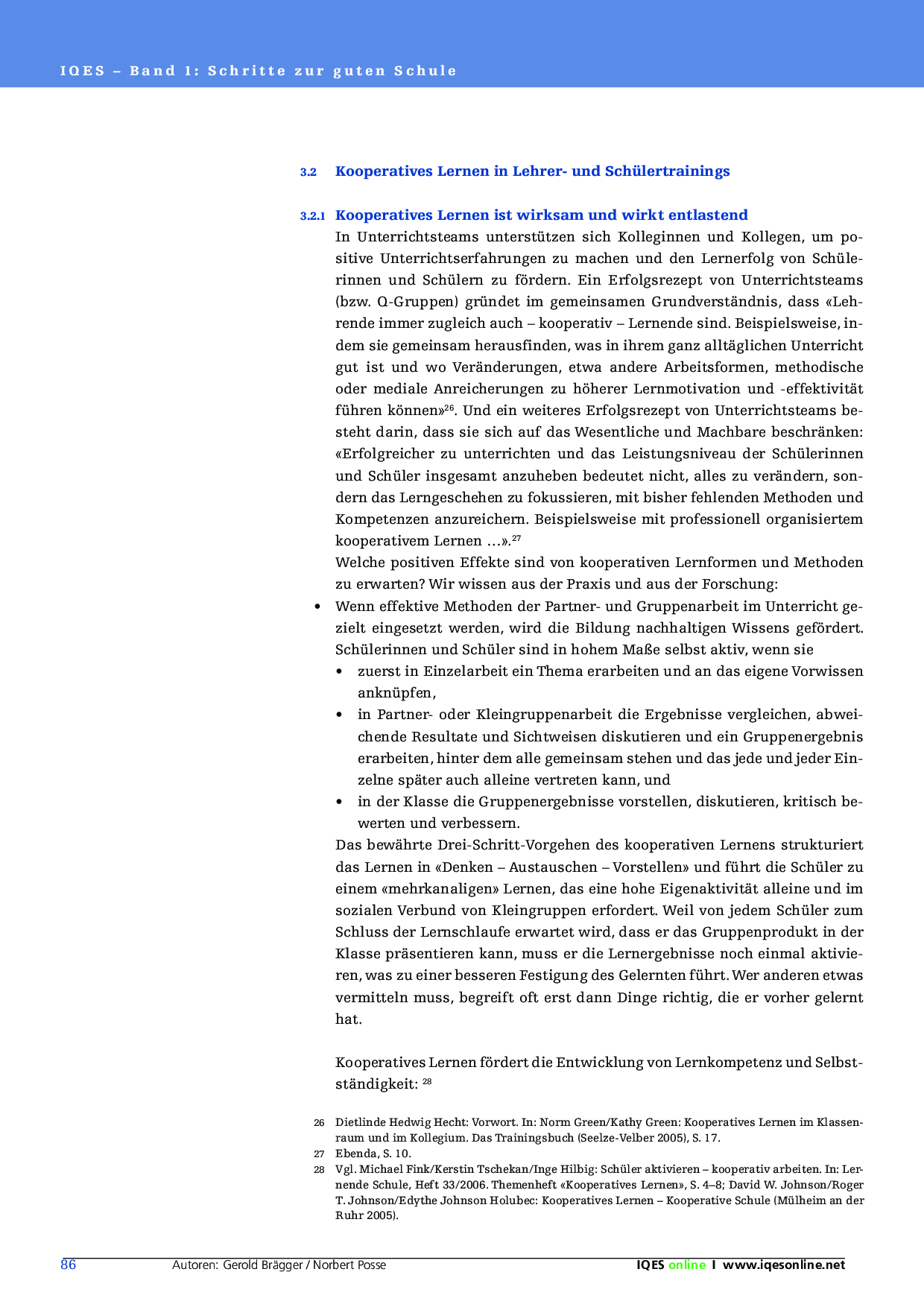 - Die Praxis vieler Lehrer/innen und zahlreiche Forschungsarbeiten belegen, dass Kooperatives Lernen die Entwicklung von Lernkompetenz und Selbstständigkeit fördert.