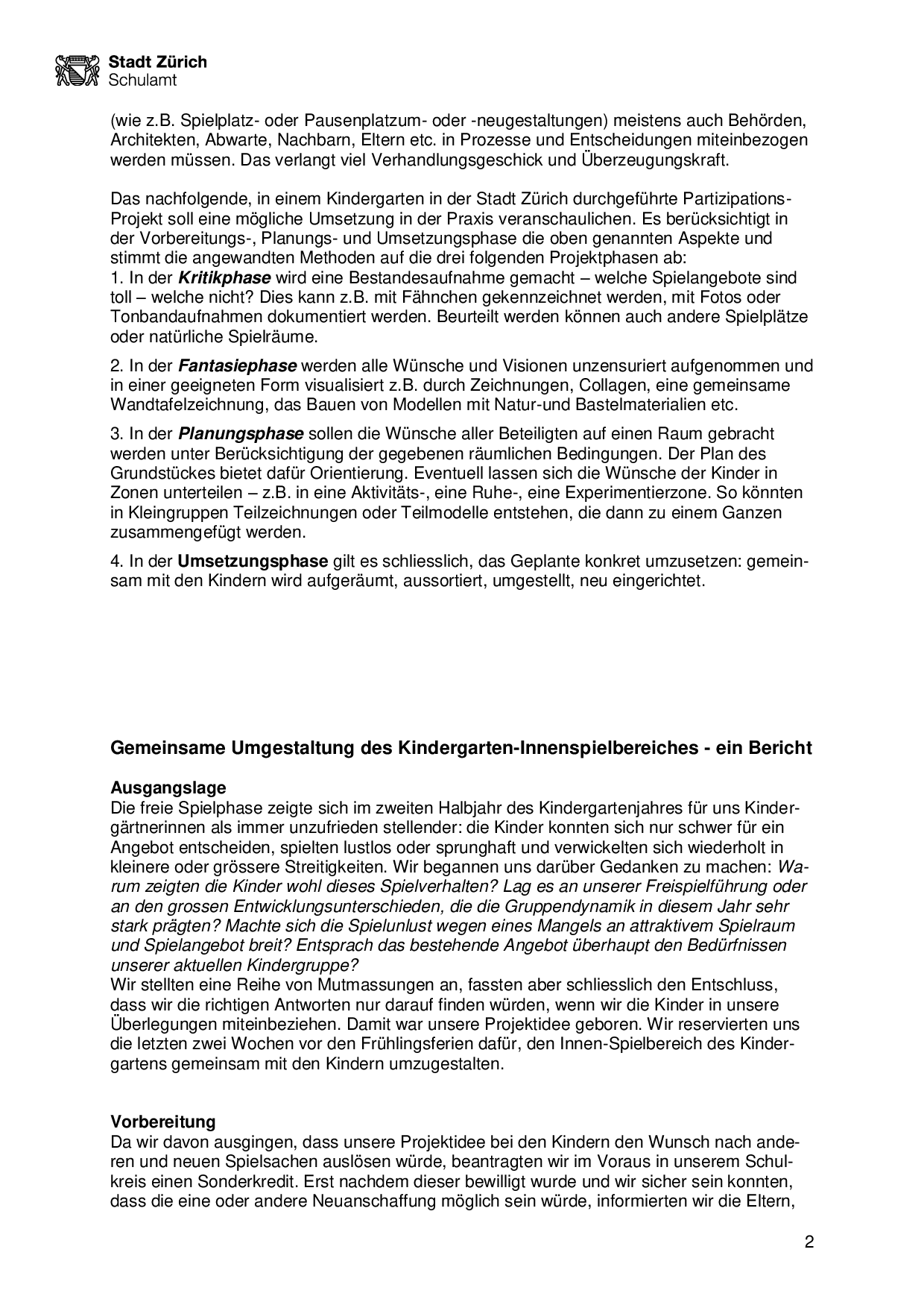 Hier finden Sie eine Projektbeschreibung mit Zeitplan für Kindergartenlehrpersonen. Es geht darum, einen Spielbereich umzugestalten und dabei die Kinder in der Planung und Umsetzung miteinzubeziehen.