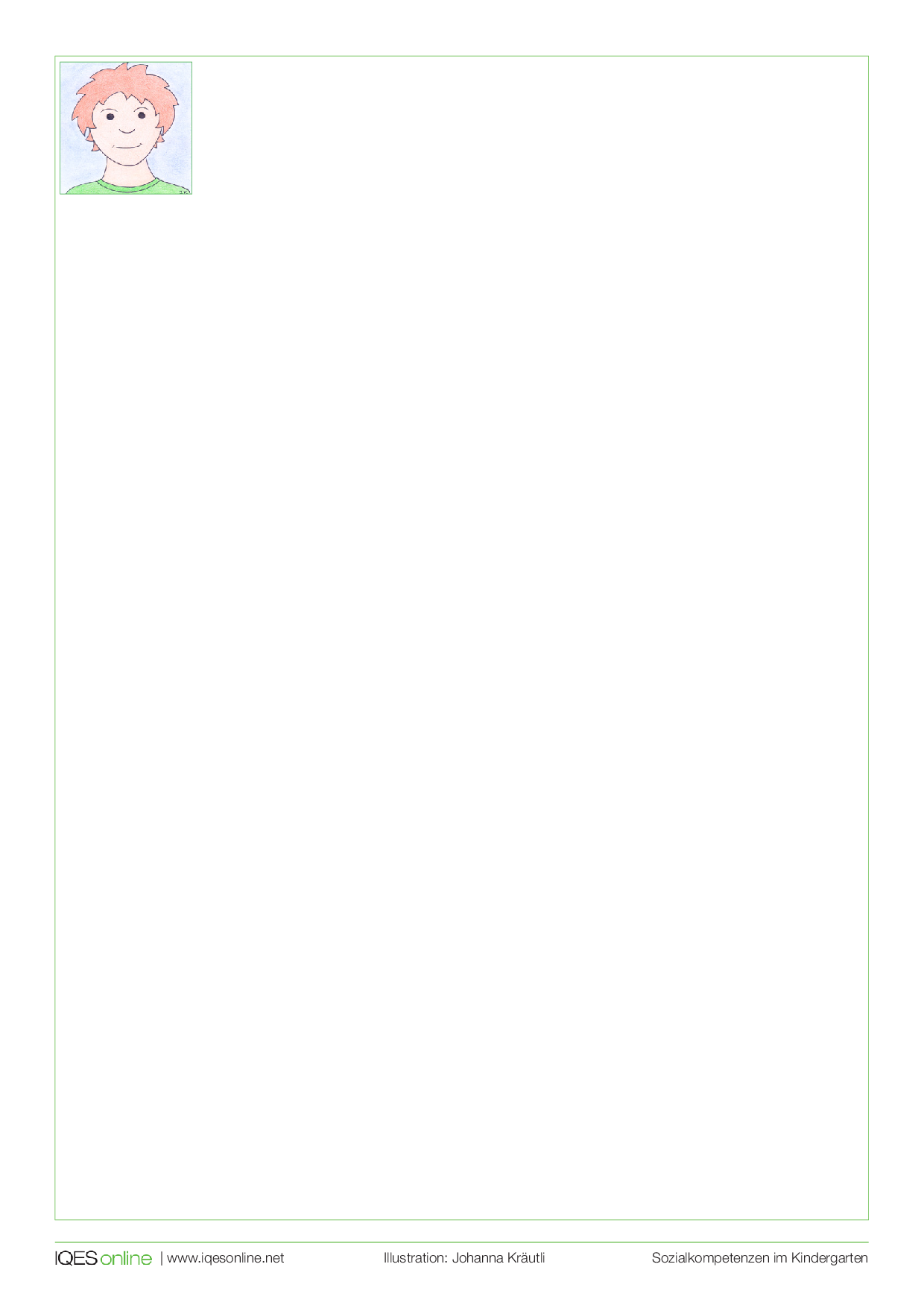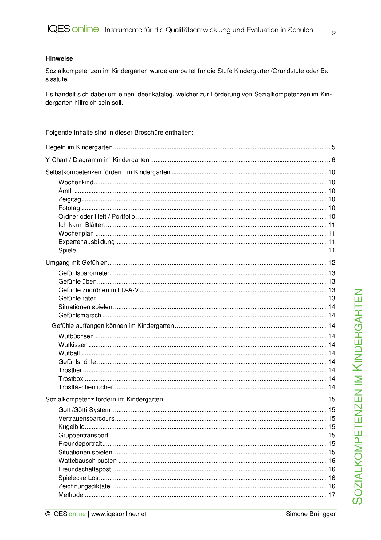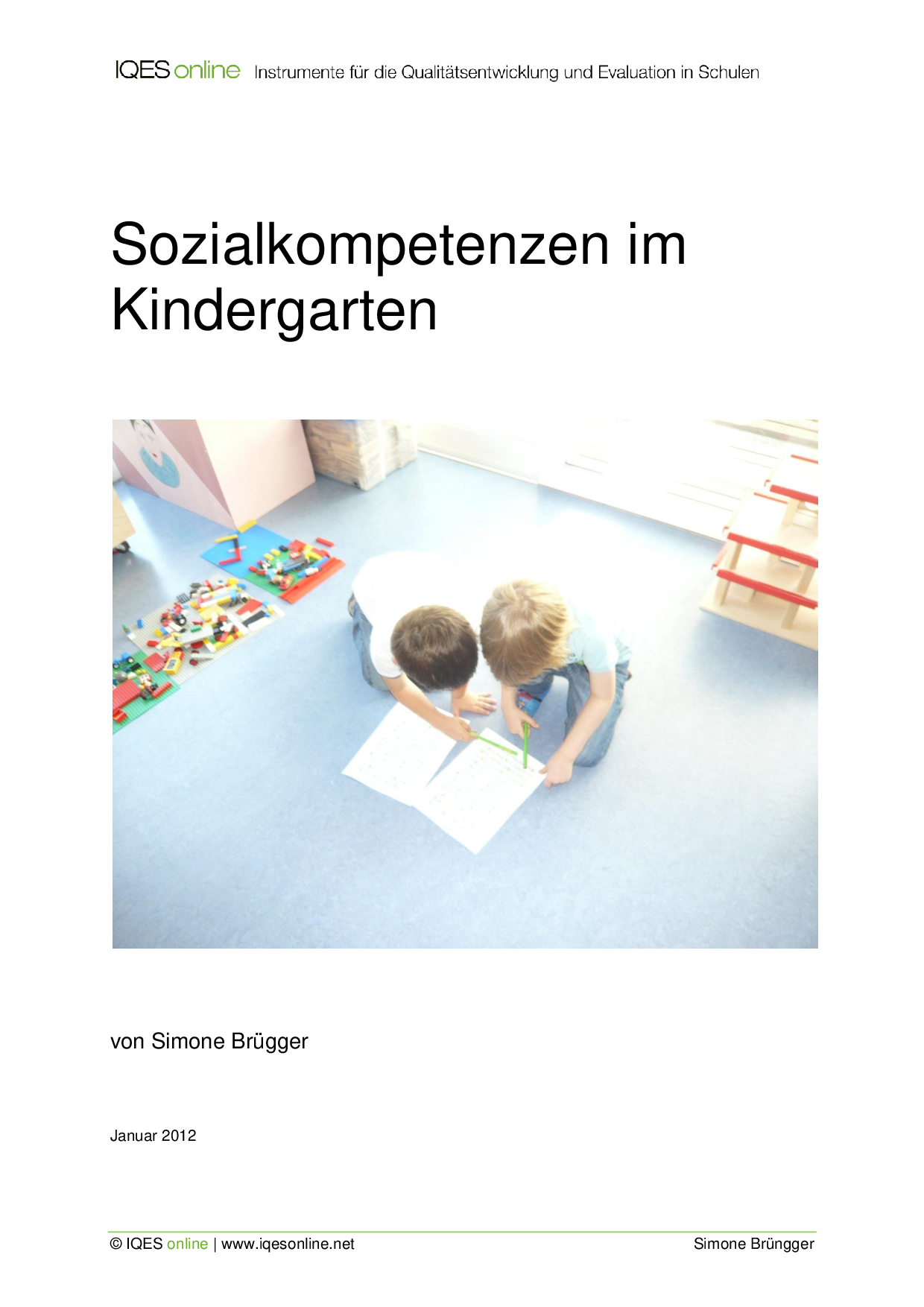Die Broschüre Sozialkompetenzen im Kindergarten wurde für die Stufe Kindergarten/Grundstufe oder Basisstufe von einer Praxisexpertin erarbeitet. Es handelt sich dabei um einen Ideenkatalog, welcher zur Förderung von Sozialkompetenzen im Kindergarten hilfreich sein soll.