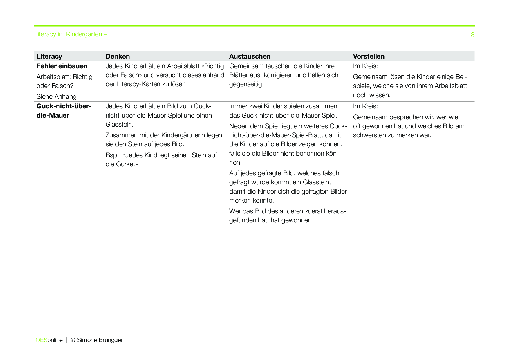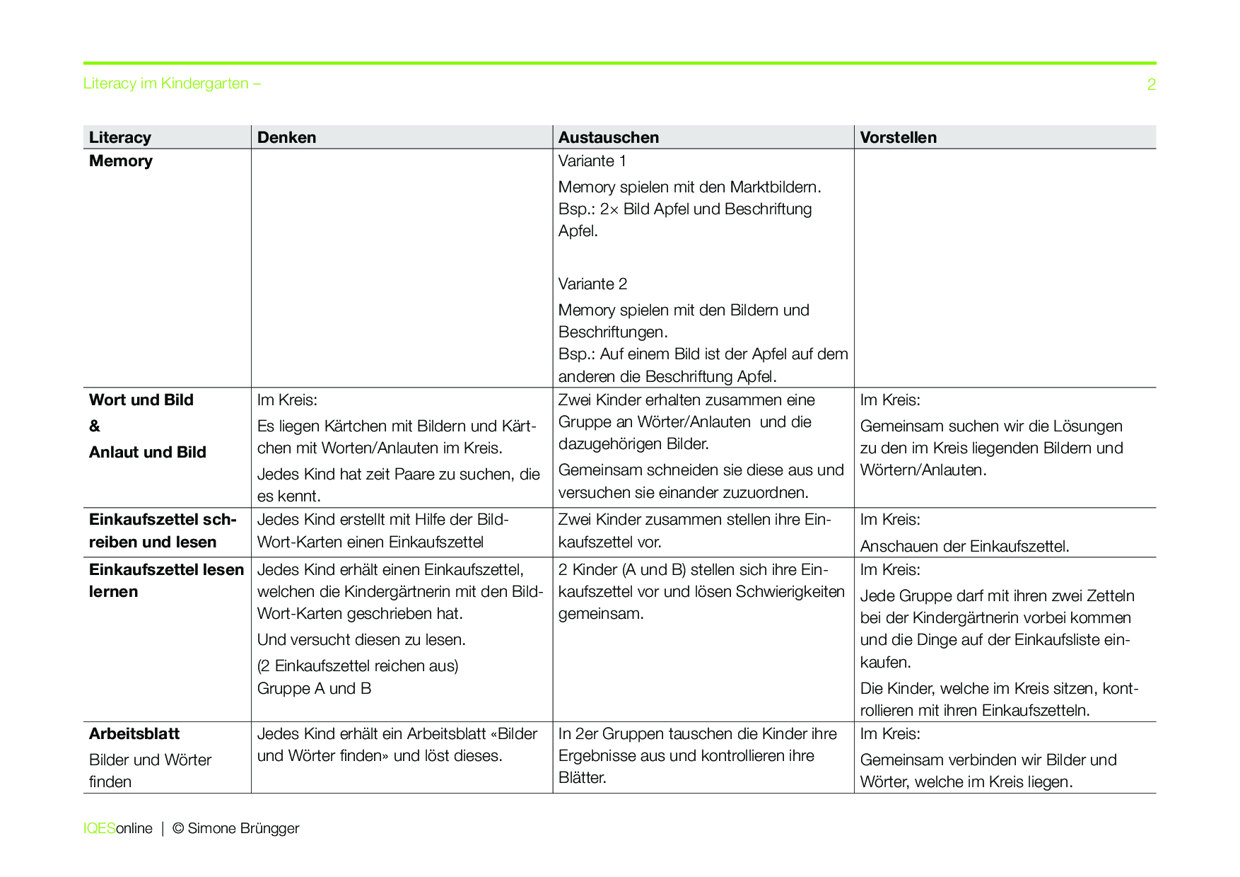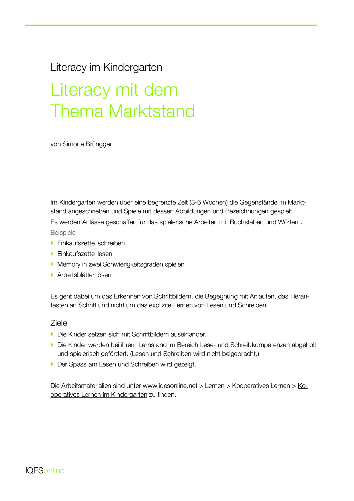Literacy im Kindergarten ist ein Ideenkatalog von erprobten Lernmethoden des kooperativen Lernens zur Förderung der Sprach- und Lesekompetenzen, welche im Kindergarten angewandt werden können. In diesem Dokument werden Unterrichtsideen für die Annäherung an Schriftbilder im Kindergarten vorgestellt. Es geht dabei um das Erkennen von Schriftbildern, die Begegnung mit Anlauten, das Herantasten an Schrift und nicht um das explizite Lernen von Lesen und Schreiben.