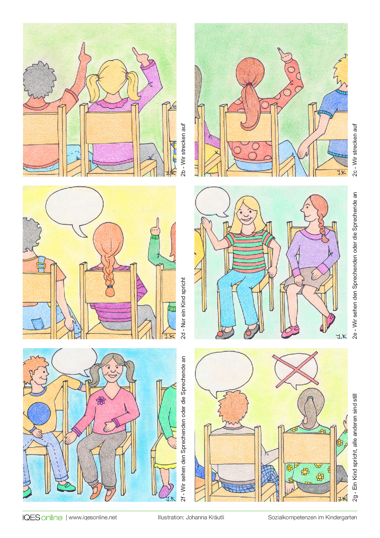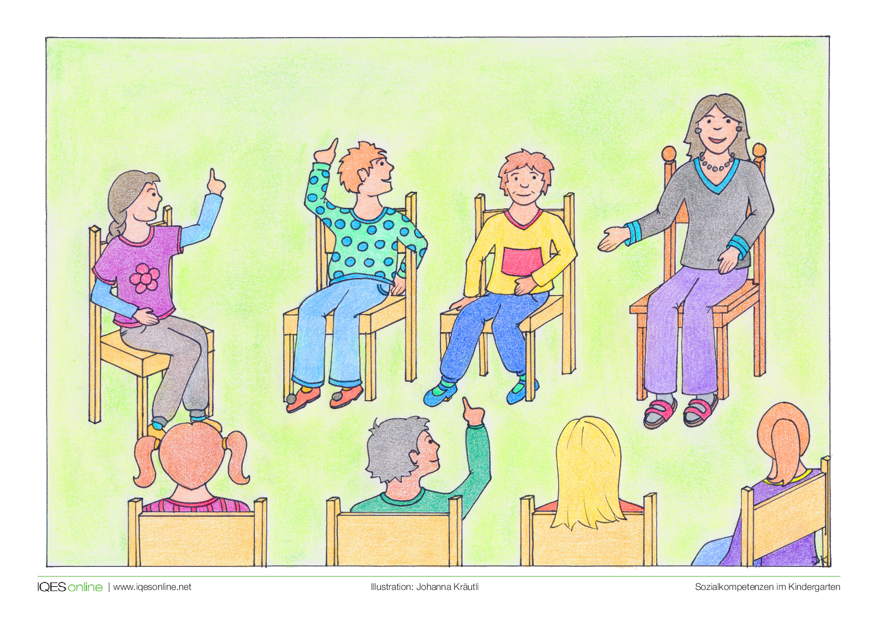 Dieses Dokument enthält Illustrationen zu Sozialkompetenz im Kindergarten. Das Regelbild vermittelt die Praxis der Sprecherlaubnis durch das Erheben der Hand.