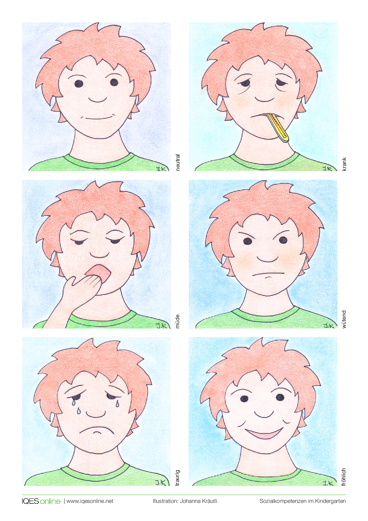 Diese Illustrationen können als Zeichnungsvorlage dienen. Sie bilden jeweils einen Jungen mit unterschiedlichen Gefühlszuständen ab. Mit diesen Vorlagen können Kinder im Kindergarten ihren individuellen Ausdruck von Gefühlen üben.