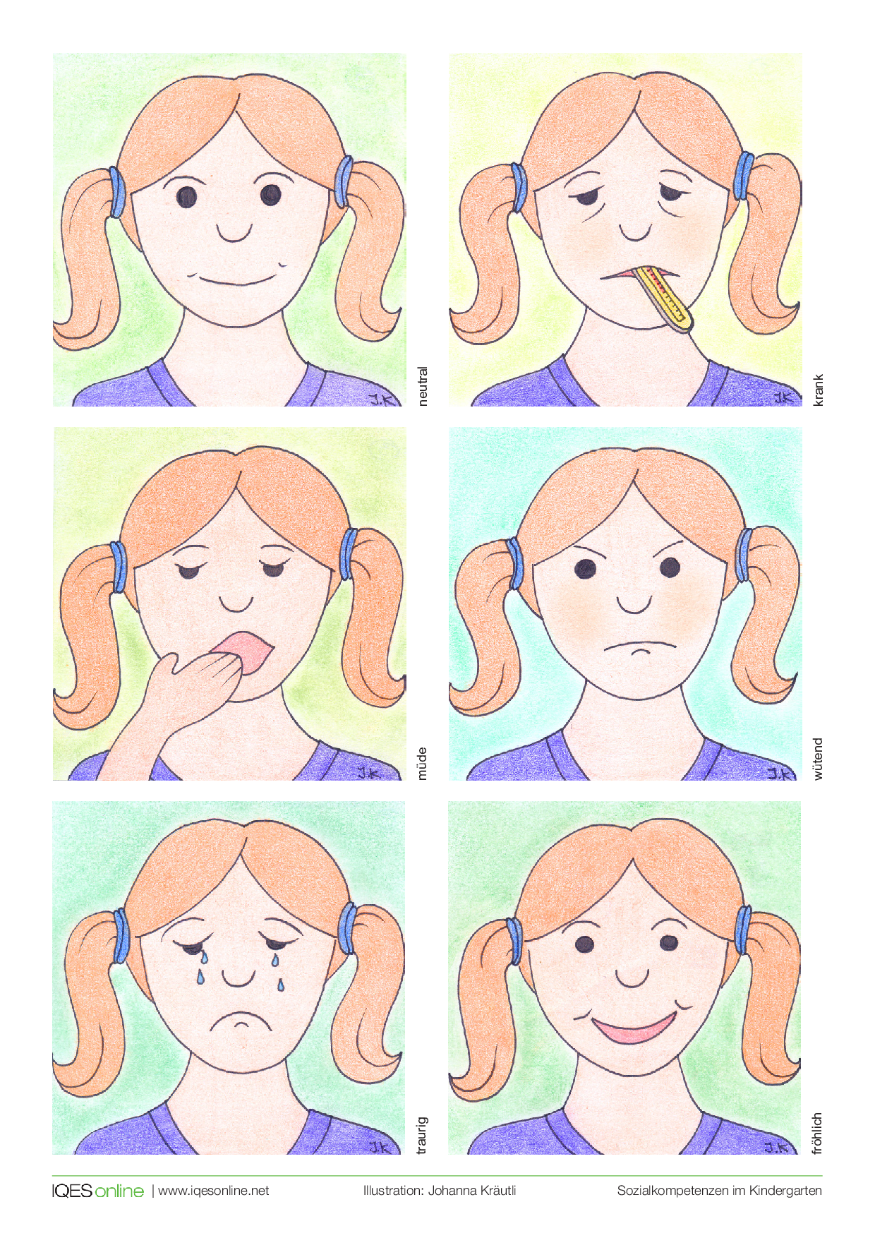 Die in diesem Dokument vorhandenen Illustrationen zeigen sieben Gefühlsbilder von Mädchen. Damit können unterschiedliche Sozialkompetenzen gefördert werden. Geeignet sind diese Bilder für die Anwendung im Kindergarten.
