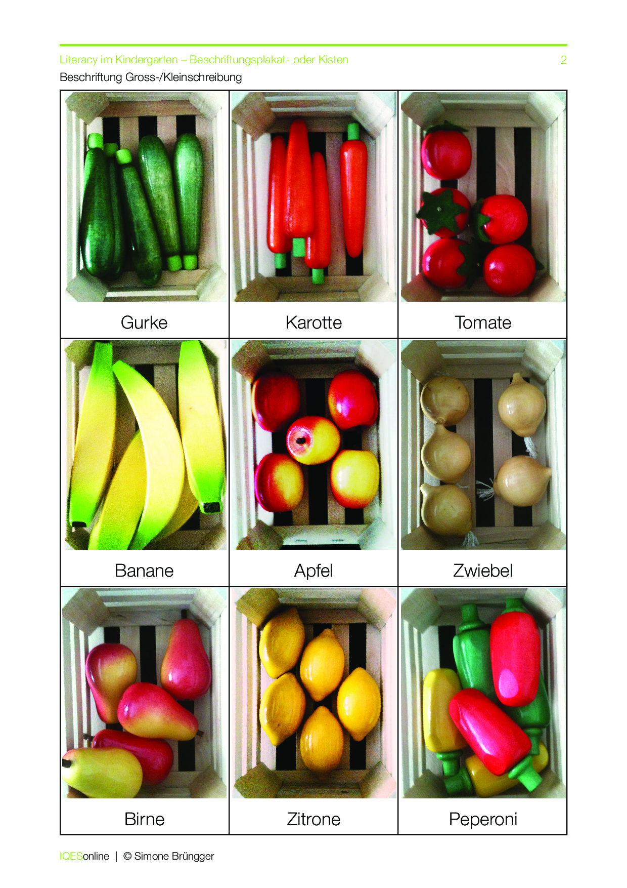 Diese 30-seitige Broschüre dient der Förderung von Literacy im Kindergarten. Es werden verschiedene Gegenstände, wie Früchte oder Gemüse, bildlich und mit geschriebenem dargstellt.