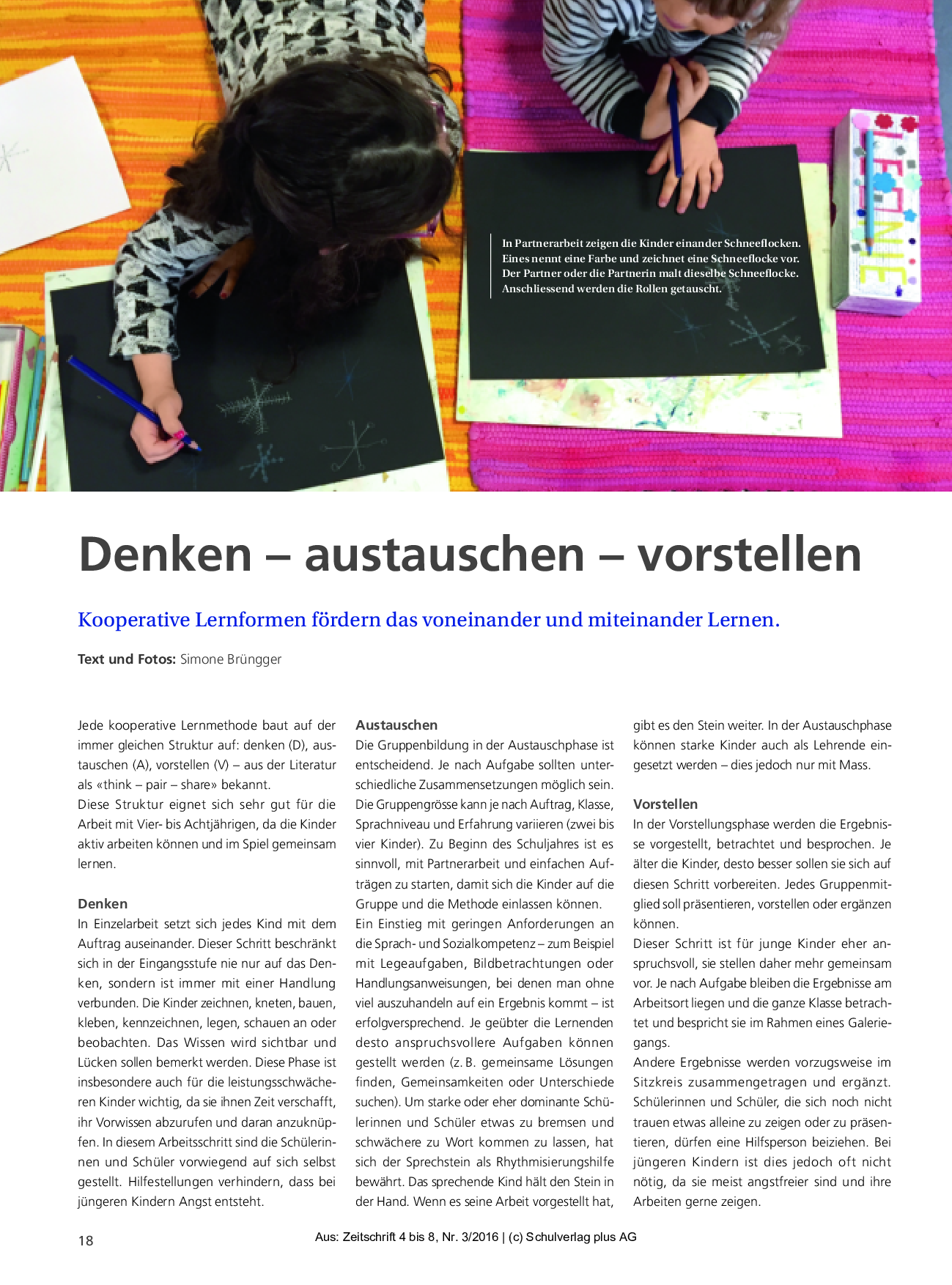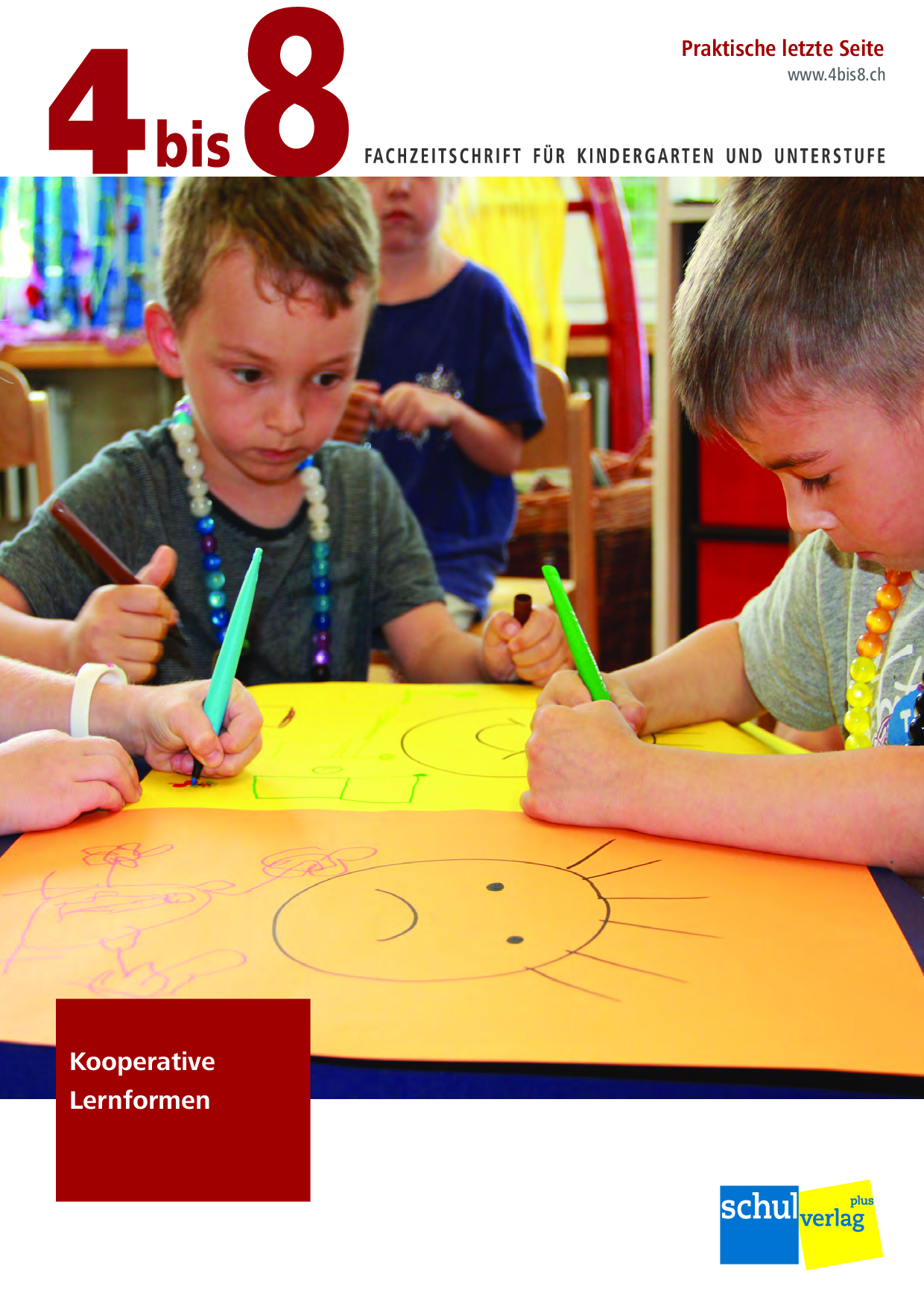 Zum kooperativen Lernen auf der Kindergartenstufe gibt es kaum Literatur. Die Zeitschrift «4 bis 8» stellt kooperative Lernformen vor, die sich sowohl im Kindergarten wie auch auf der Unterstufe umsetzen lassen. Neben einer Kurzbeschreibung der Methode erhalten Sie Hinweise zu den benötigen Materialien, einen Vorschlag zur Gruppenbildung sowie Anregungen, wie die Kinder ihre Arbeit reflektieren können. Die Arbeit in drei Phasen des kooperativen Lernens (think – pair – share) werden anhand eines konkreten Themas illustriert und beschrieben. Zusätzlich finden Sie Varianten, Vorschläge zur Differenzierung sowie Anregungen zu weiteren Themen.