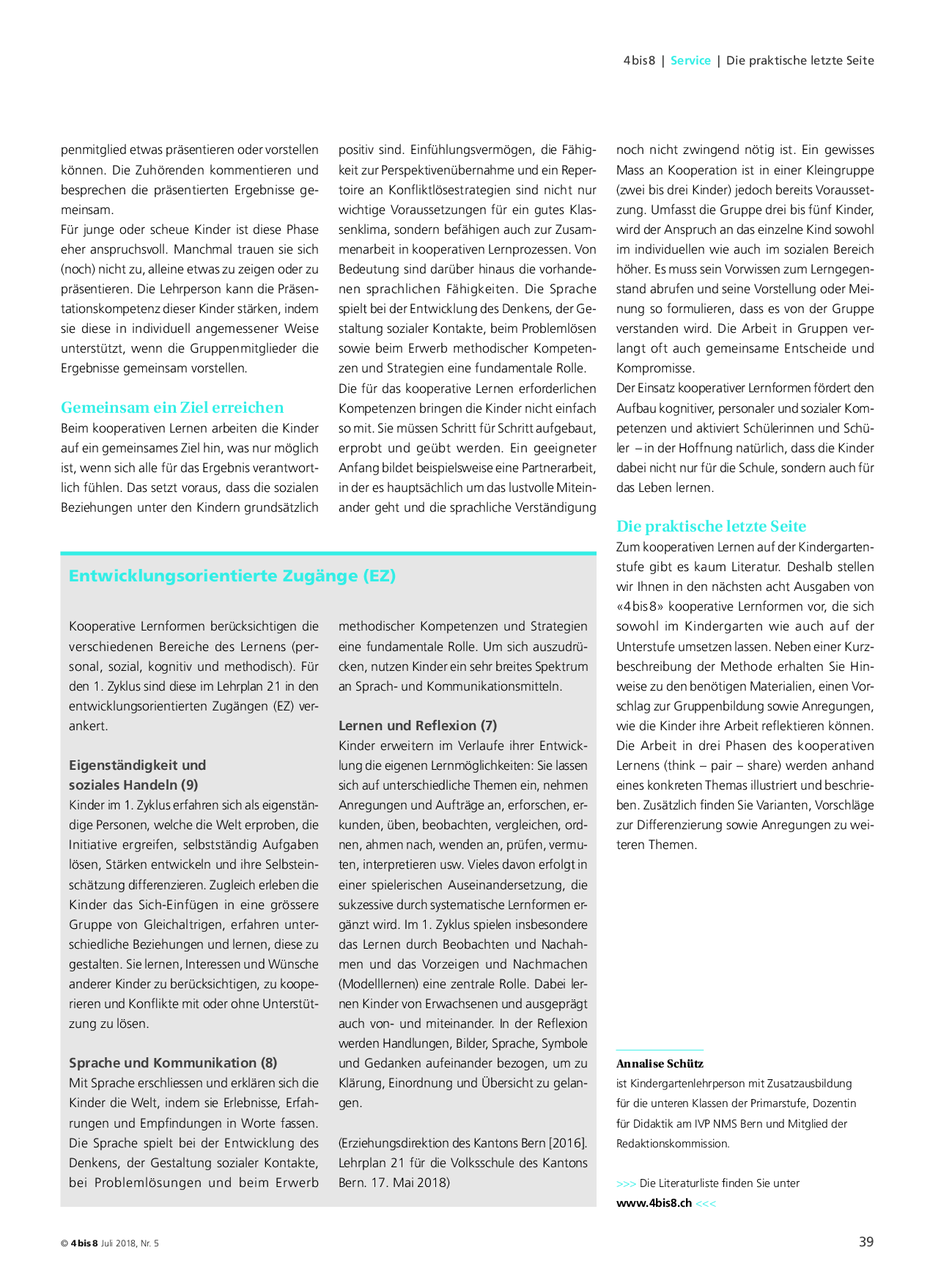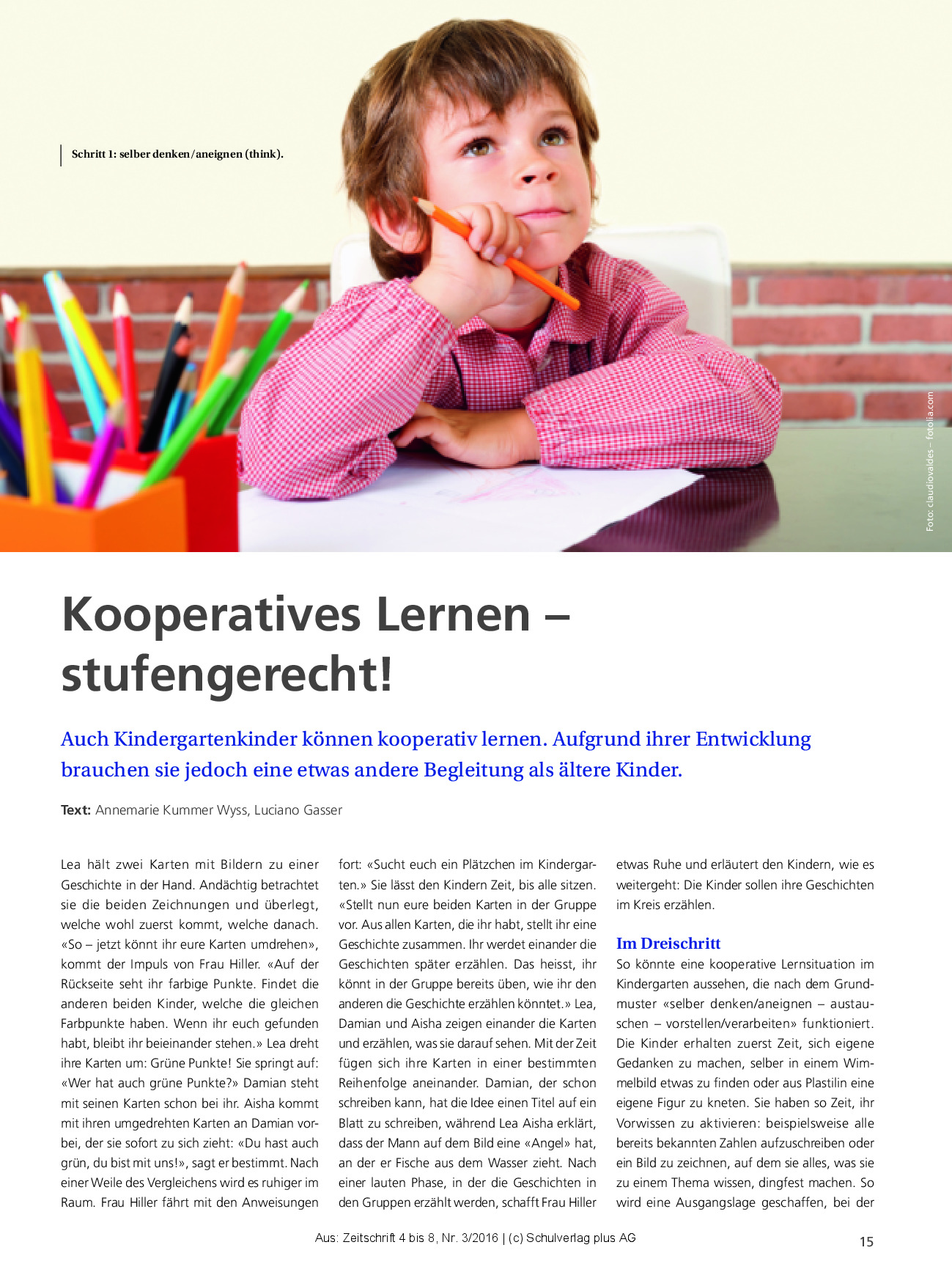 Kooperatives Lernen ist keine neue Form von Gruppenarbeit, sondern ein Gesamtkonzept, das eine hohe Aktivität der Lernenden ermöglicht und sowohl das inhaltliche als auch das individuelle und soziale Lernen fördert. Auch Kindergartenkinder können stark von kooperativen Lernformen profitieren. Aufgrund ihrer Entwicklung brauchen sie jedoch angepasste methodische Settings und eine etwas andere Begleitung als ältere Kinder und. Sie finden hier Praxishilfen, Ideenkataloge und Fachartikel. Diese stammen von Praktikerinnen, die als Kindergartenlehrpersonen und als Kursleitende unterrichten.