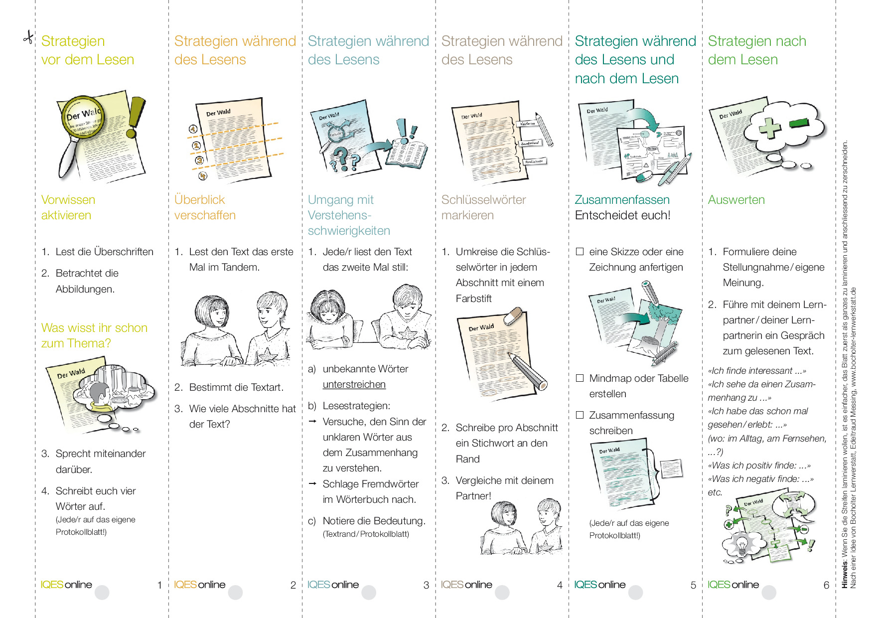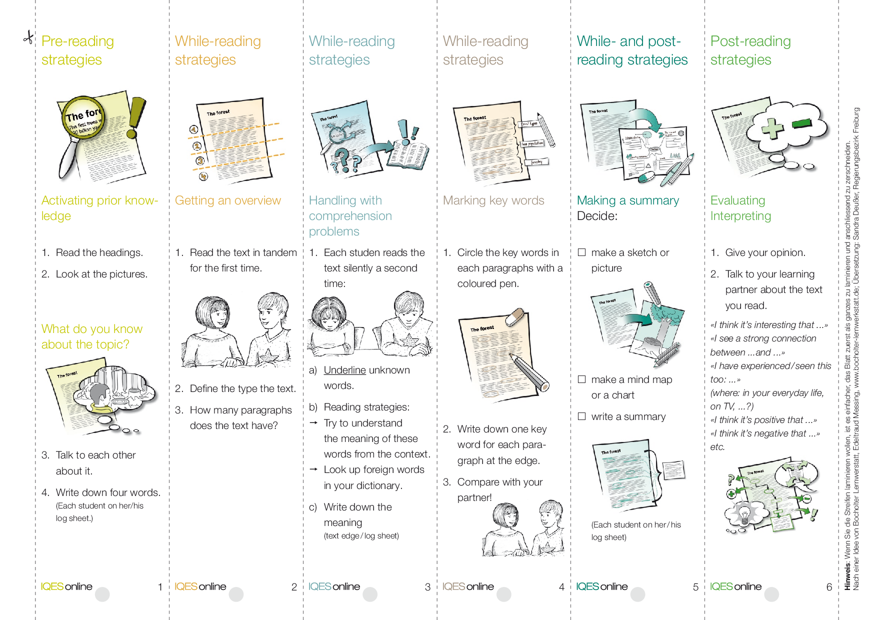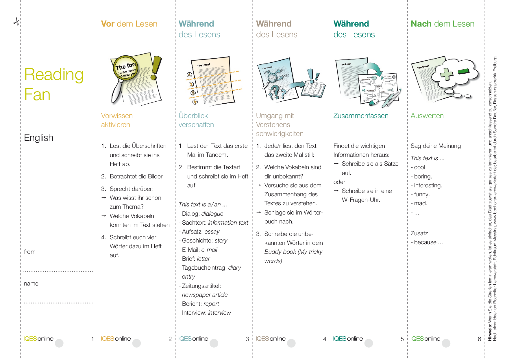 Mit diesem Instrument kann das Lesen in Zweiergruppen geübt werden. Auf der Kopievorlage sind erweiterte Lesestrategien in Englisch aufgeführt, die vor, während und nach dem Lesen angewandt werden können.