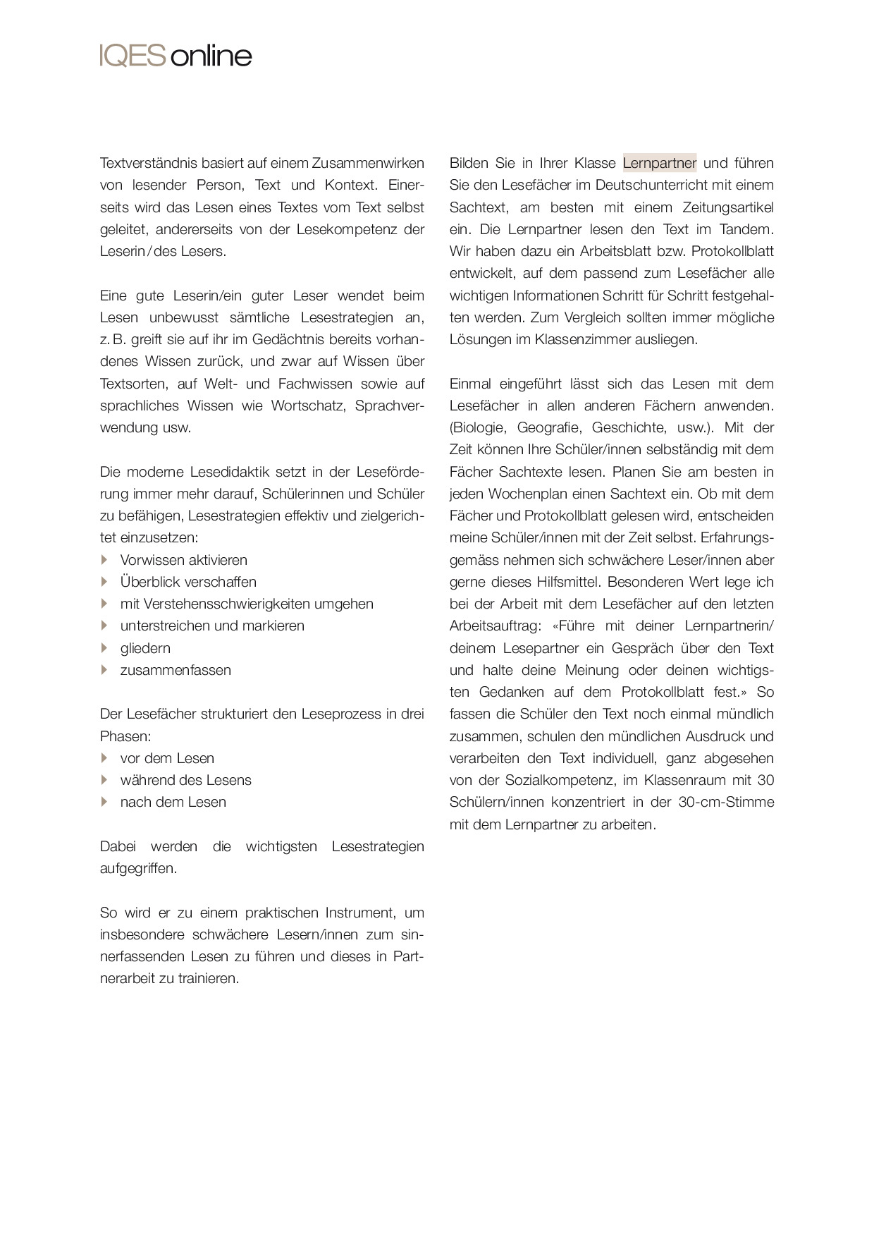 Bilden Sie in Ihrer Klasse Lernpartnerinnen und Lernpartner und führen Sie den Lesefächer im Deutschunterricht mit einem Zeitungsartikel ein. Die Lernpartner lesen den Text im Tandem.