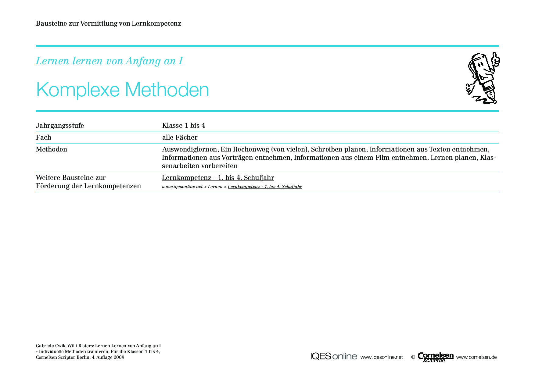In diesem Dokument werden verschiedene fächerübergreifende Lernmethoden für die 1. bis 4. Klassenstufe vorgestellt. Einige der Themen: Auswendiglernen, Schreiben planen, Informationen aus Texten entnehmen, Informationen aus Vorträgen entnehmen, Lernen planen, Klassenarbeiten vorbereiten.