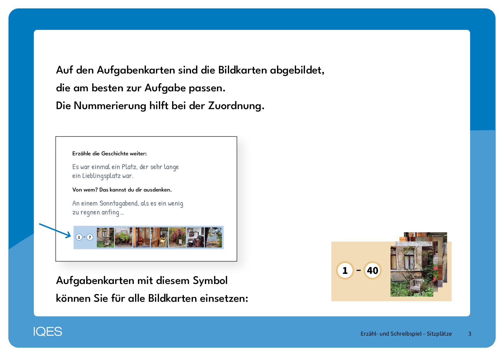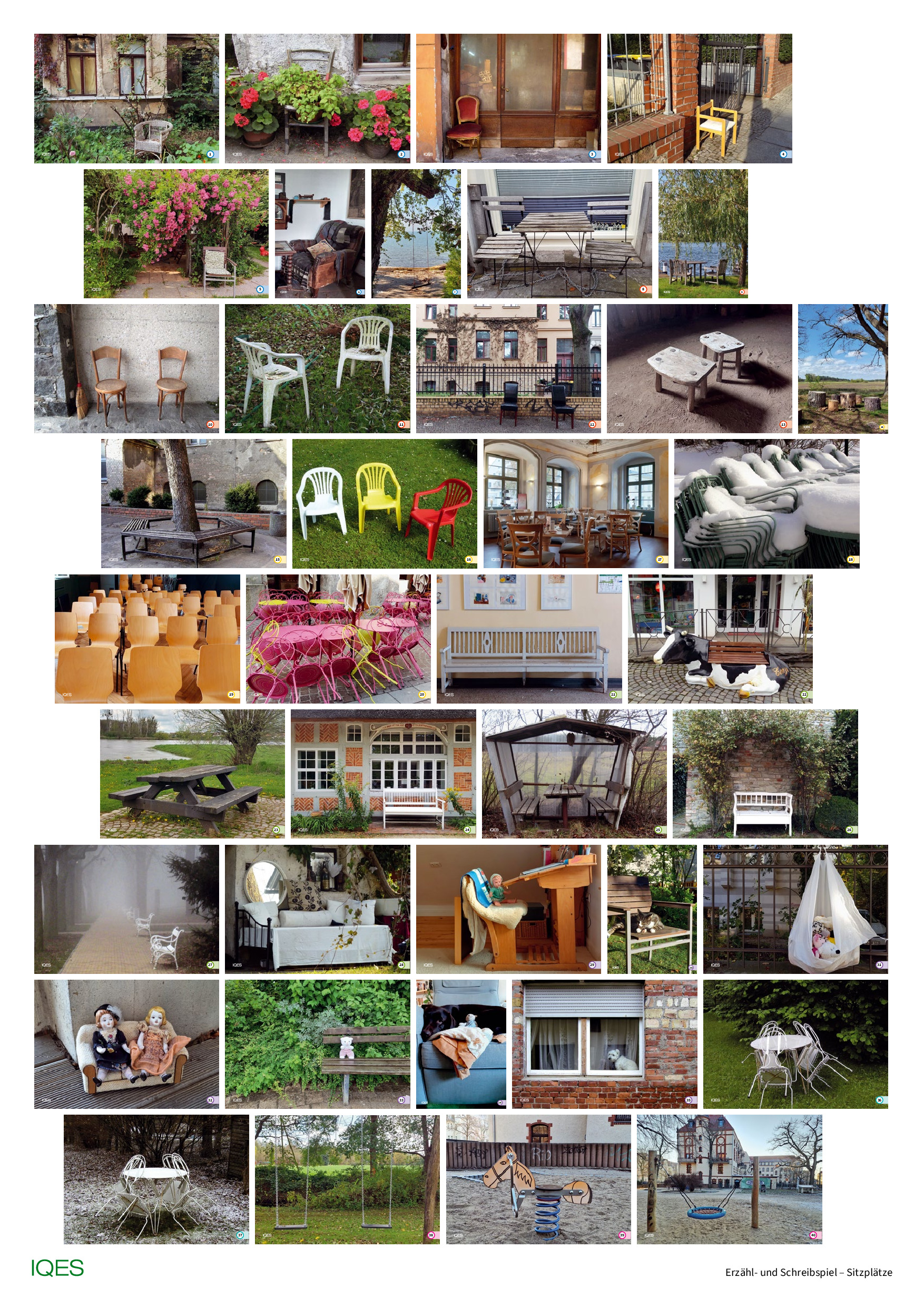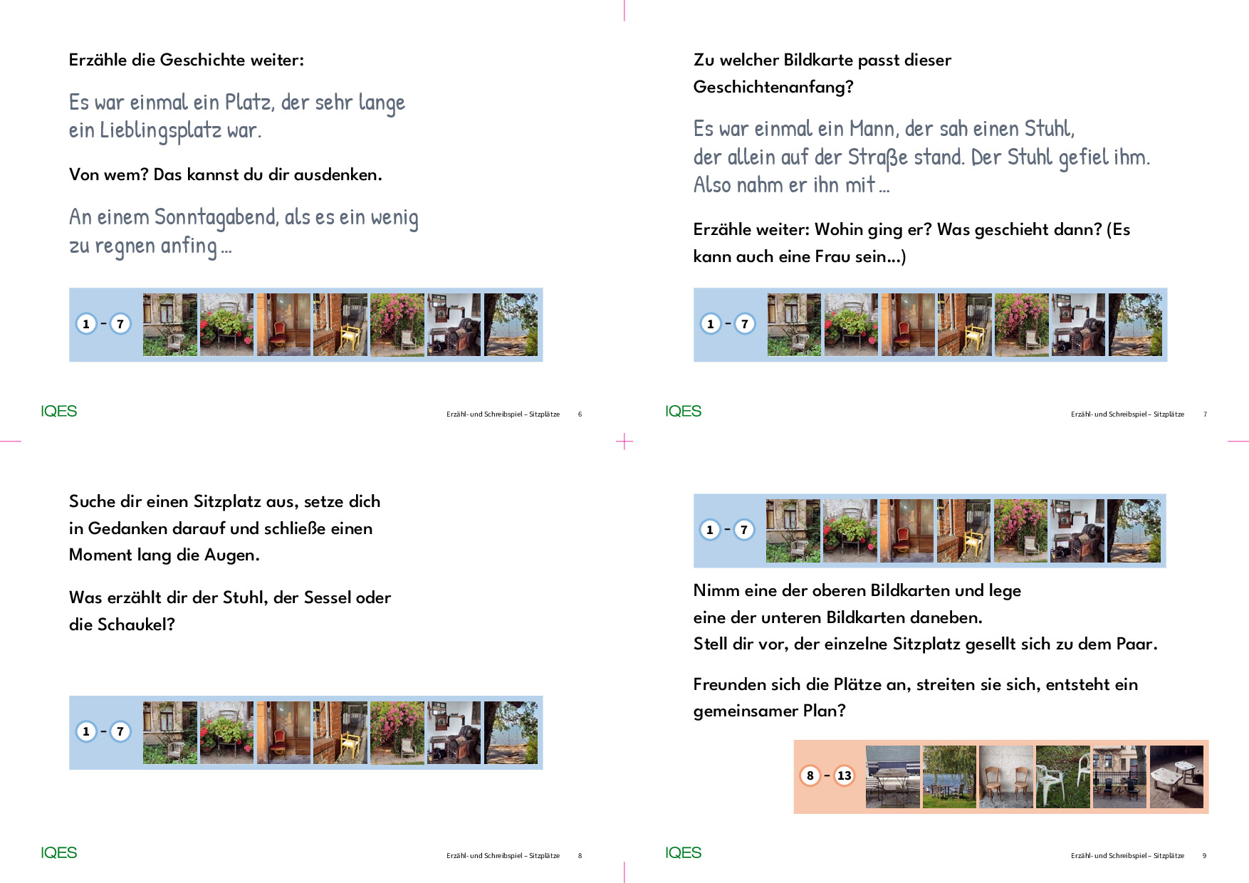 Das Bildkarten-Set bietet differenzierte Erzähl- und Schreibimpulse für das kreative Schreiben. An jedem Sitzplatz beginnen und enden Geschichten, die die Kinder erzählen, aufschreiben und in selbstgestalteten Büchern aufbewahren können. Alle Bildkarten zeigen verschiedene Sitzplätze. Die Spielenden können den Sitzplatz in ihren Geschichten personifizieren. Dann spricht der Stuhl/Sitzplatz selbst, er erlebt und erleidet etwas, er ist lebendig geworden. Es gibt aber auch die Möglichkeit des realistischen Erzählens. Dann konstruieren die Schreibenden eine Situation, ein Geschehen aus ihrer Vorstellung und versetzen sich in die dargestellte Situation hinein.