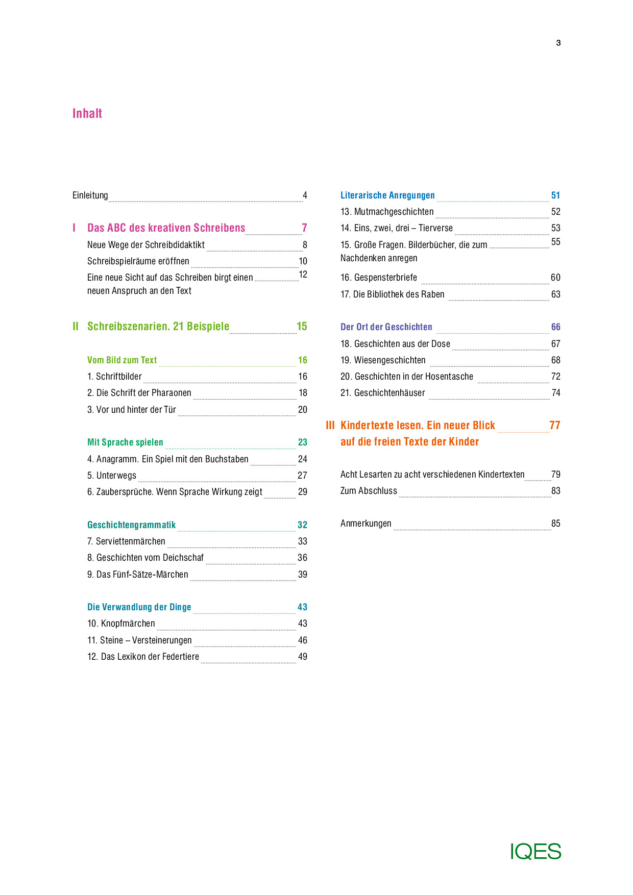 Die im Praxisbuch vorgestellten insgesamt 21 Schreibszenarien bieten Schreibideen, die manchmal schon in einer Doppelstunde realisiert werden können. Vom Spiel mit der Sprache über Schriftbilder, Baumuster für 5-Sätze-Geschichten und geeignete literarische Anregungen bis hin zum Aufspüren des Ortes, an dem die Geschichten aufgeweckt werden können, reicht das Repertoire der Schreibszenarien.