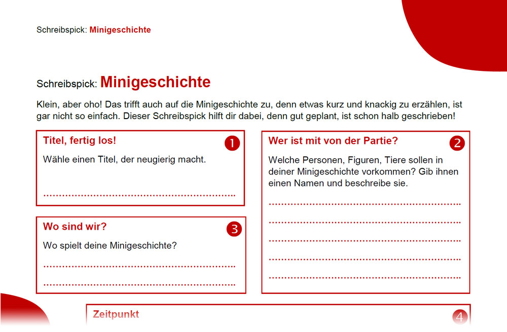 Minigeschichten bieten eine gute Gelegenheit, das Geschichtenschreiben zu üben und zu zeigen, dass die Qualität einer Geshcichte nicht von ihrer Länge abhängt. Eine Geschichte in wenigen Sätzen zu erzählen und den Schreibspick dafür als Planungshilfe einzusetzen, ermöglicht es auch schreibschwächeren Schülerinnen und Schülern, sichtbare (Schreib-)Erfolge zu erzielen.