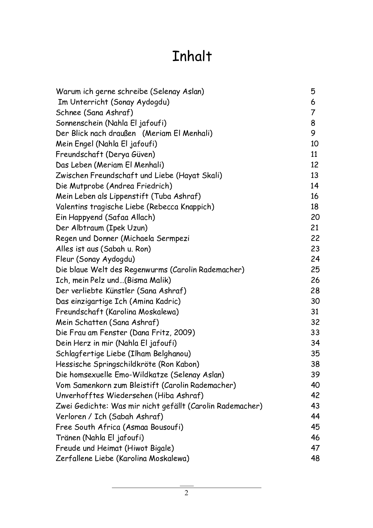 Die Alexander-von-Humboldt-Schule in Rüsselsheim führt regelmässig Schreibwerkstätten durch, bei der die Schülerinnen und Schüler angeleitet werden, kreative Texte zu erstellen. Hier präentiert die Schule eine Textauswahl der Schreibwerkstatt aus den Jahren 2009 bis 2011.