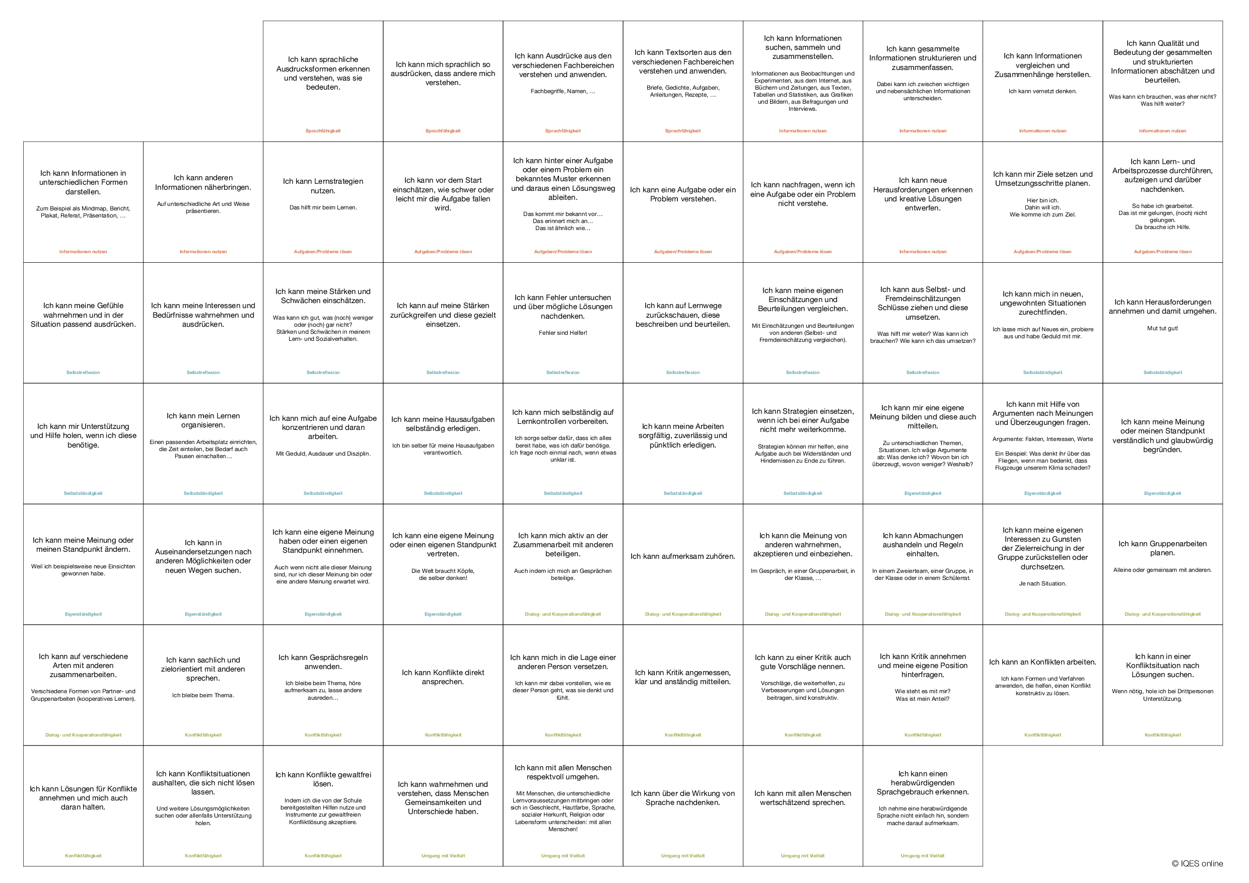 Dabei zeigen die roten Karten die personalen Kompetenzen (Selbstreflexion, Selbstständigkeit und Eigenständigkeit), die grünen die sozialen Kompetenzen (Dialog- und Kooperationsfähigkeit, Konfliktfähigkeit und Umgang mit Vielfalt) und die blauen Karten stehen für die methodischen Kompetenzen (Sprachfähigkeit, Informationen nutzen und Aufgaben/Probleme lösen).