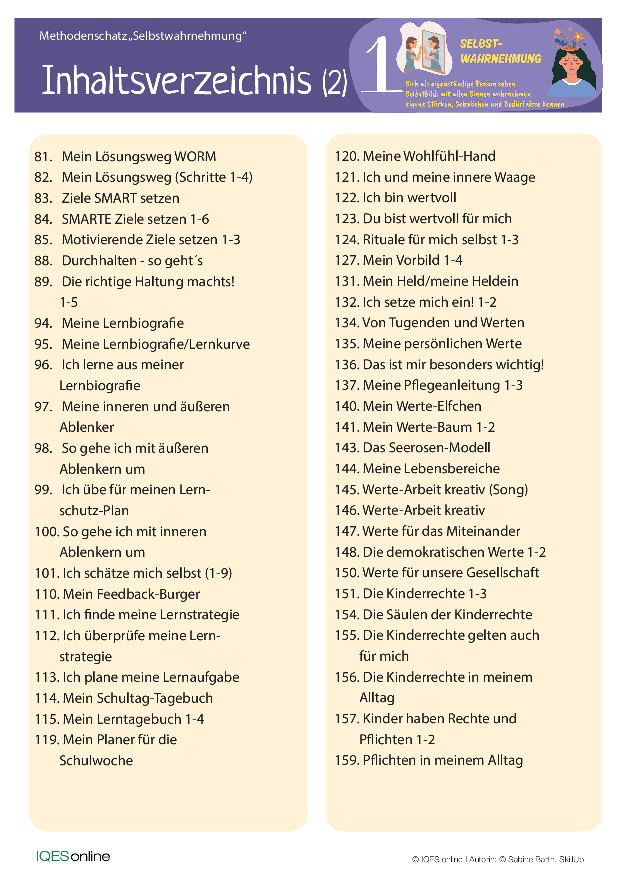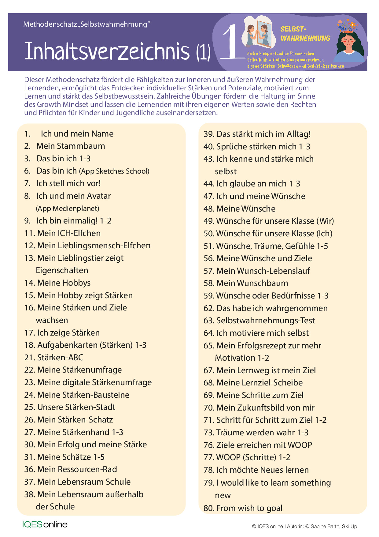 Dieser Methodenschatz fördert die Fähigkeiten zur inneren und äußeren Wahrnehmung der Lernenden, ermöglicht das Entdecken individueller Stärken und Potenziale, motiviert zum Lernen und stärkt das Selbstbewusstsein. Zahlreiche Übungen fördern die Haltung im Sinne des Growth Mindset und lassen die Lernenden mit ihren eigenen Werten sowie den Rechten und Pflichten für Kinder und Jugendliche auseinandersetzen.