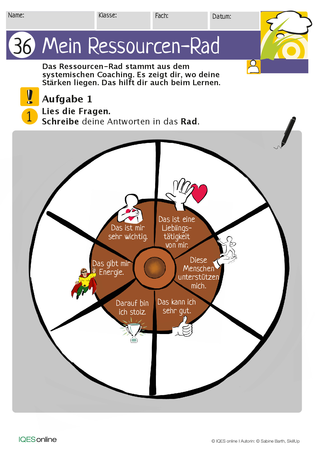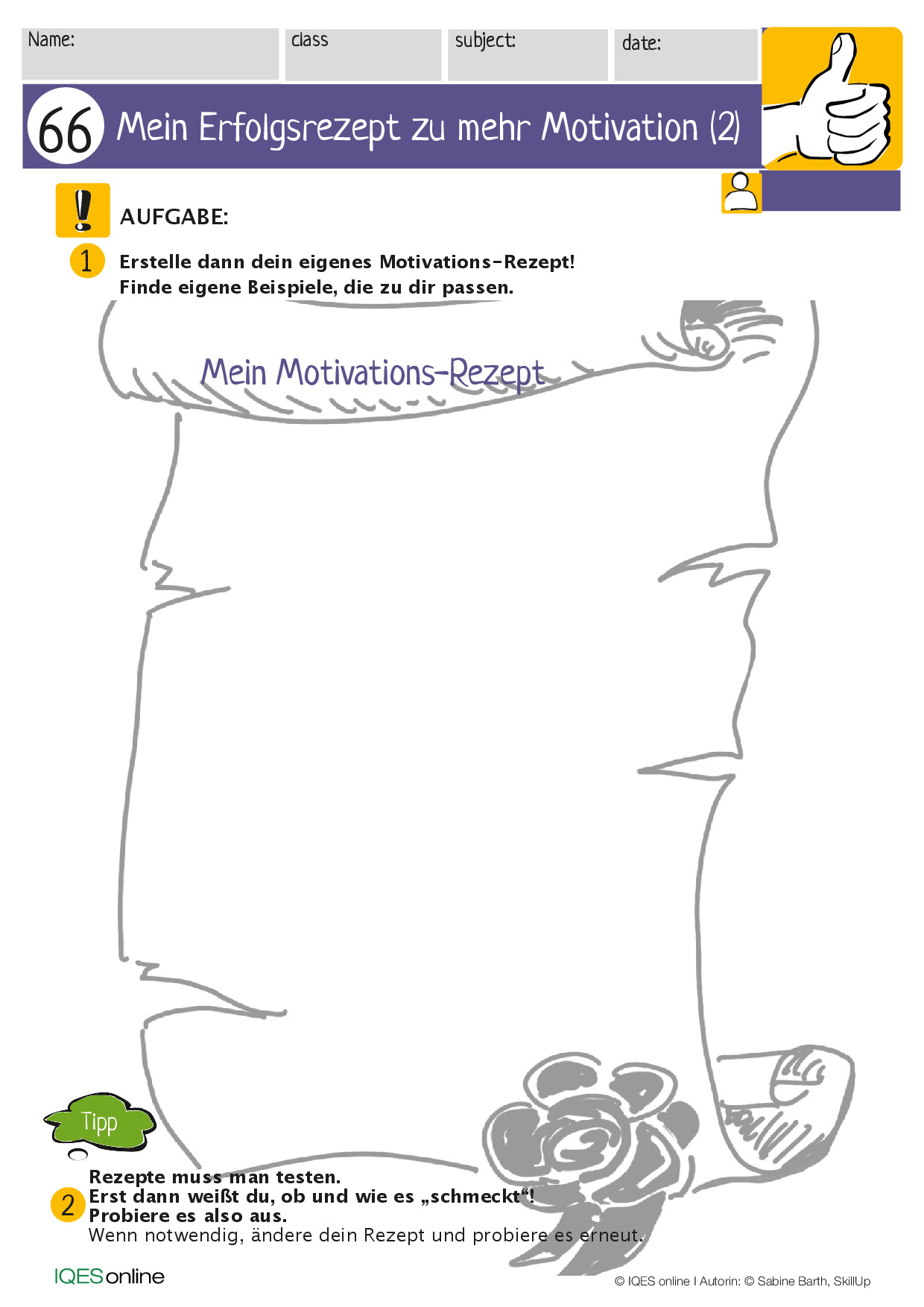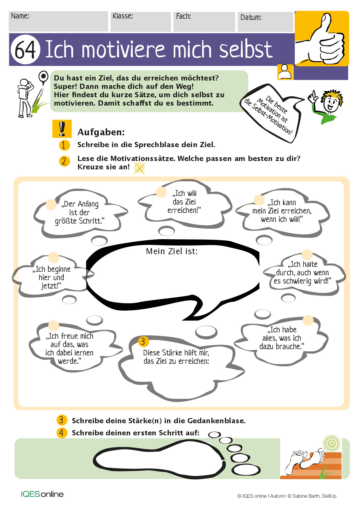 Alle weiteren Arbeitsschritte basieren daher auf der Auseinandersetzung und der Definition zur eigenen Identität. Damit die Schüler:innen überhaupt ins Tun kommen und die Energie aufbringen möchten, mit sich selbst und den weitergehenden Themenbereichen zu beschäftigen, bedarf es einer gewissen Motivation, die im günstigsten Fall intrinsisch ist (also von inneren Impulsen und dem eigenen Antrieb der Schüler:innen herrührt). Der Methodenschatz beinhaltet hierfür Materialien zur Selbstmotivation.