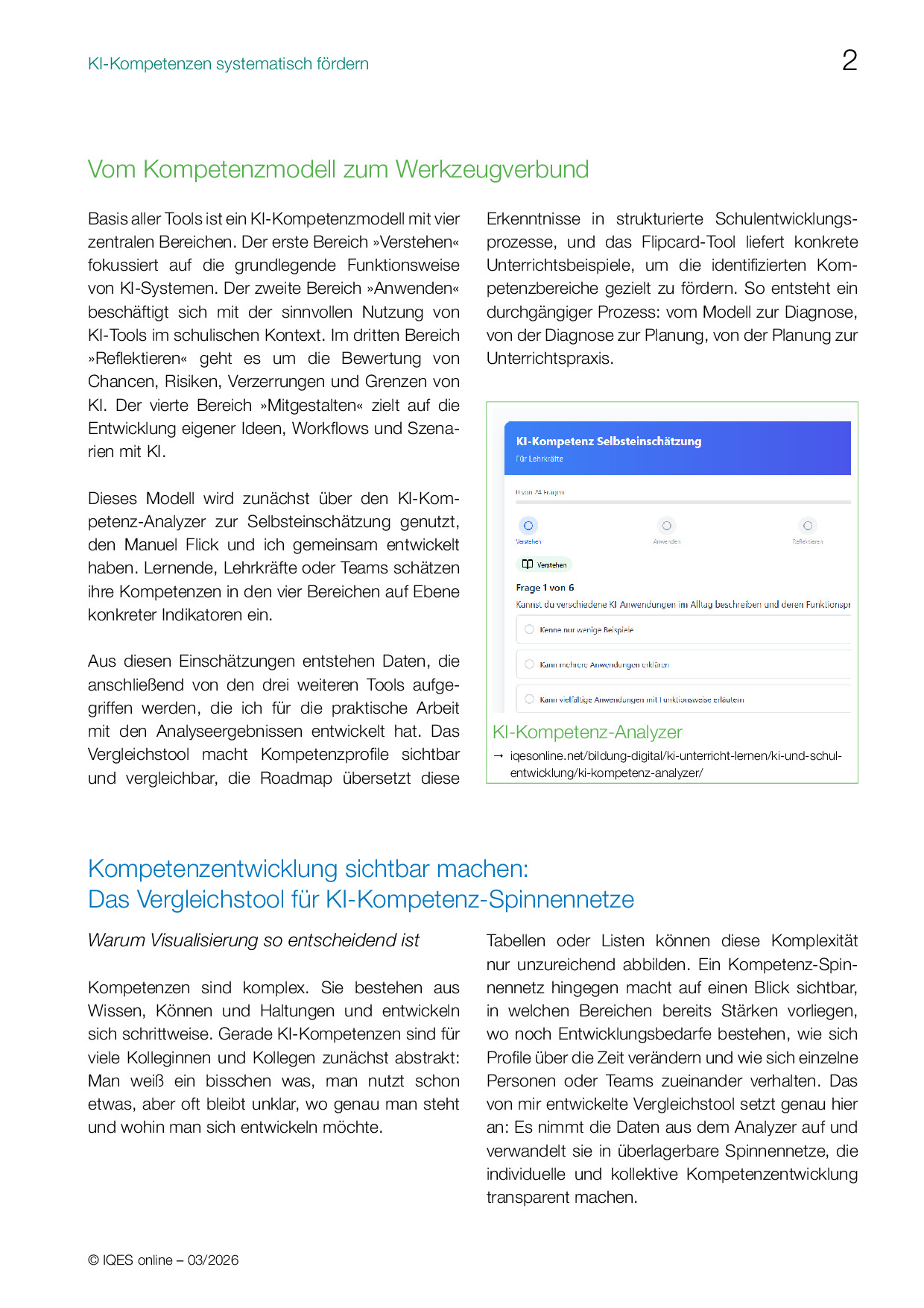 Der Beitrag zeigt, wie ein aufeinander abgestimmter Werkzeugverbund aus Kompetenzdiagnose, Visualisierung, strategischer Planung und konkreter Unterrichtspraxis einen durchgängigen Schulentwicklungsprozess ermöglicht. Anhand von KI-Kompetenz-Analyzer, Spinnennetz-Vergleich, KI-Kompetenz-Roadmap und Flipcard-Tool wird deutlich, wie individuelle Kompetenzentwicklung, Teamarbeit und institutionelle Steuerung sinnvoll miteinander verzahnt werden können – datenbasiert, praxisnah und langfristig angelegt.