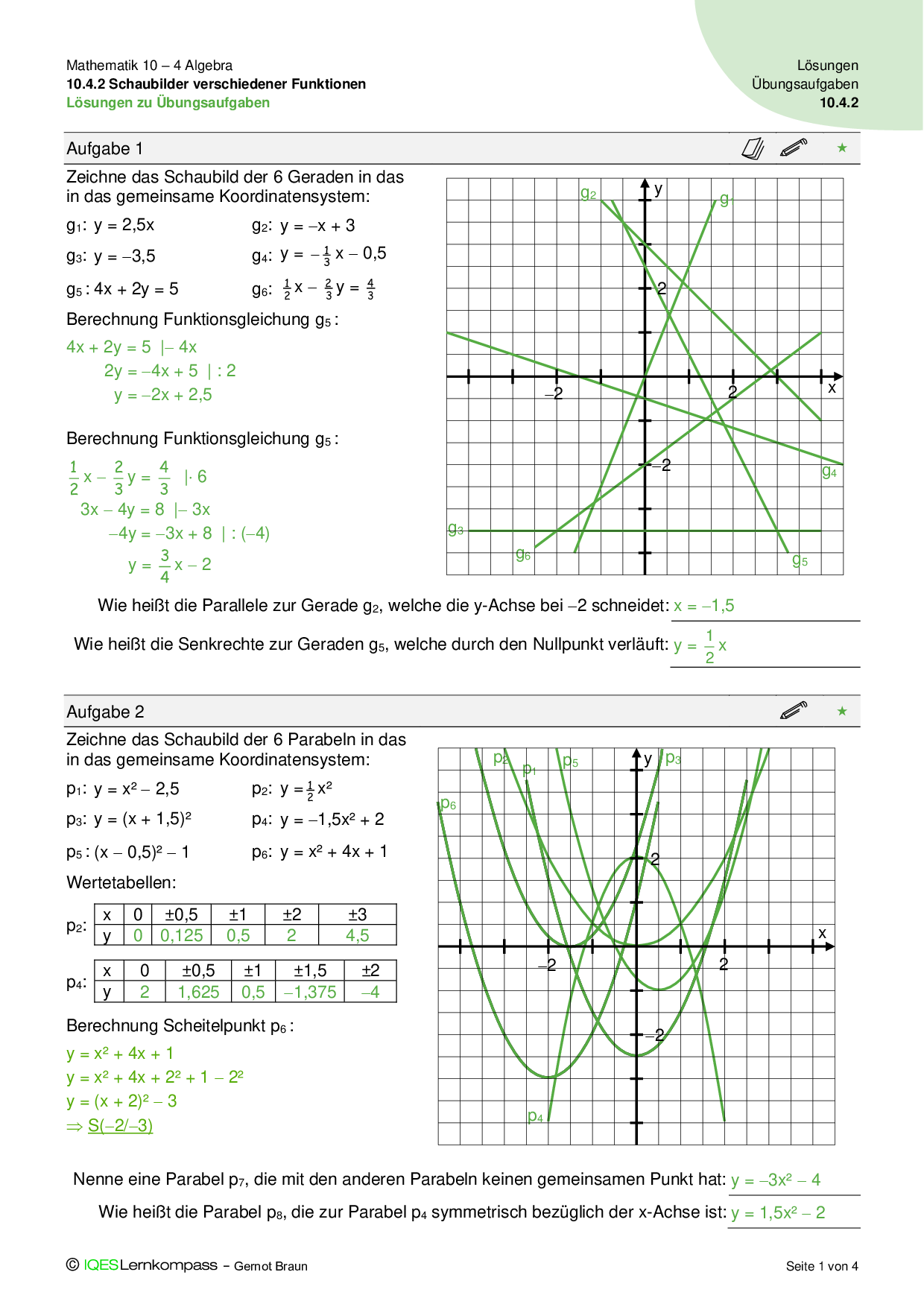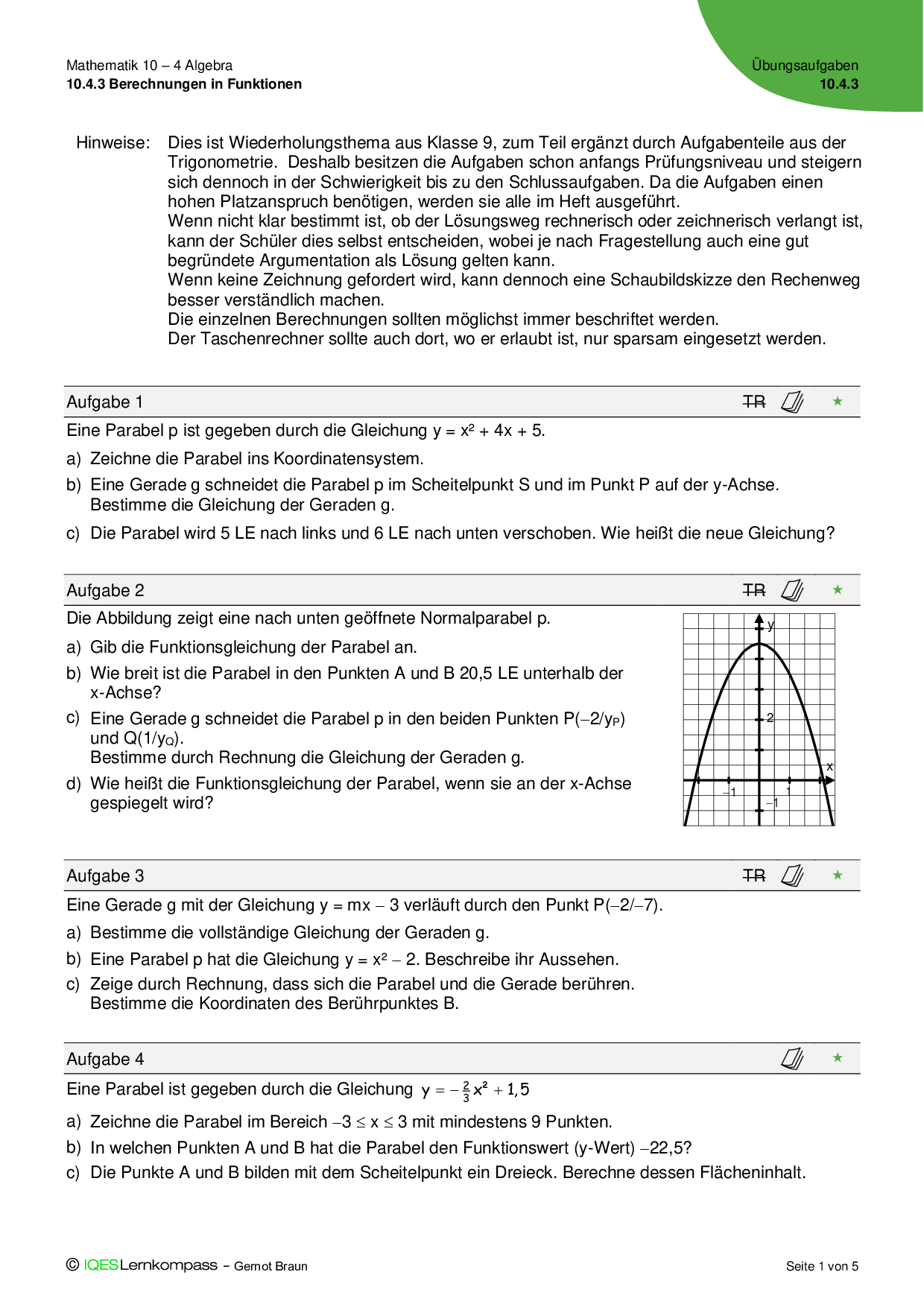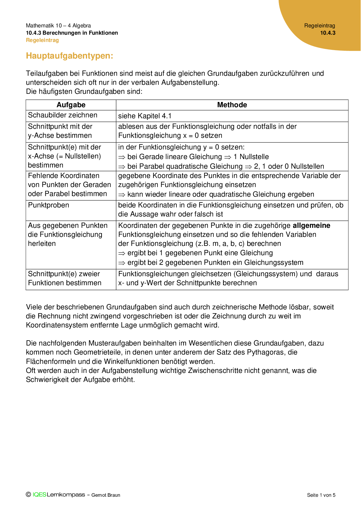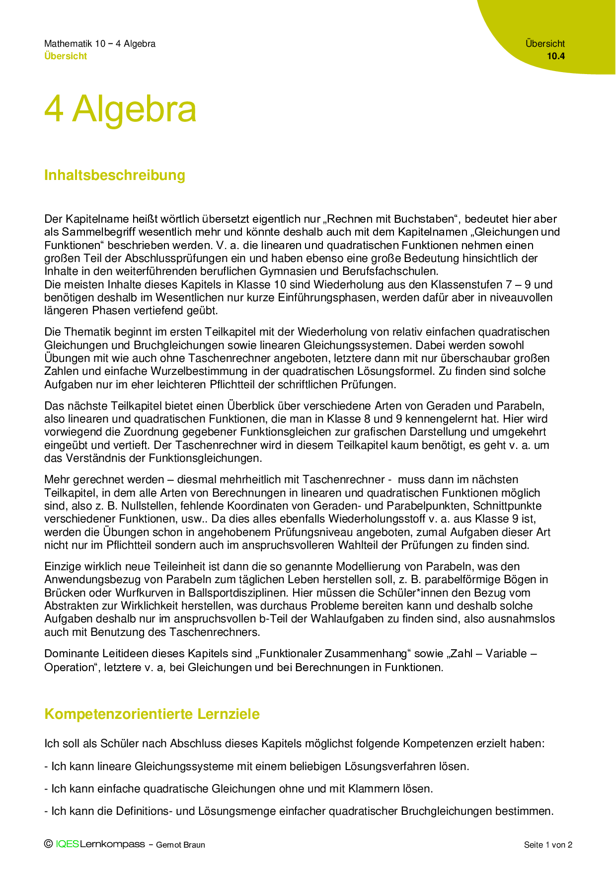 Der Kapitelname heißt wörtlich übersetzt eigentlich nur „Rechnen mit Buchstaben“, bedeutet hier aber als Sammelbegriff wesentlich mehr und könnte deshalb auch mit dem Kapitelnamen „Gleichungen und Funktionen“ beschrieben werden. V. a. die linearen und quadratischen Funktionen nehmen einen großen Teil der Abschlussprüfungen ein und haben ebenso eine große Bedeutung hinsichtlich der Inhalte in den weiterführenden beruflichen Gymnasien und Berufsfachschulen. Die meisten Inhalte dieses Kapitels in Klasse 10 sind Wiederholung aus den Klassenstufen 7 – 9 und benötigen deshalb im Wesentlichen nur kurze Einführungsphasen, werden dafür aber in niveauvollen längeren Phasen vertiefend geübt.