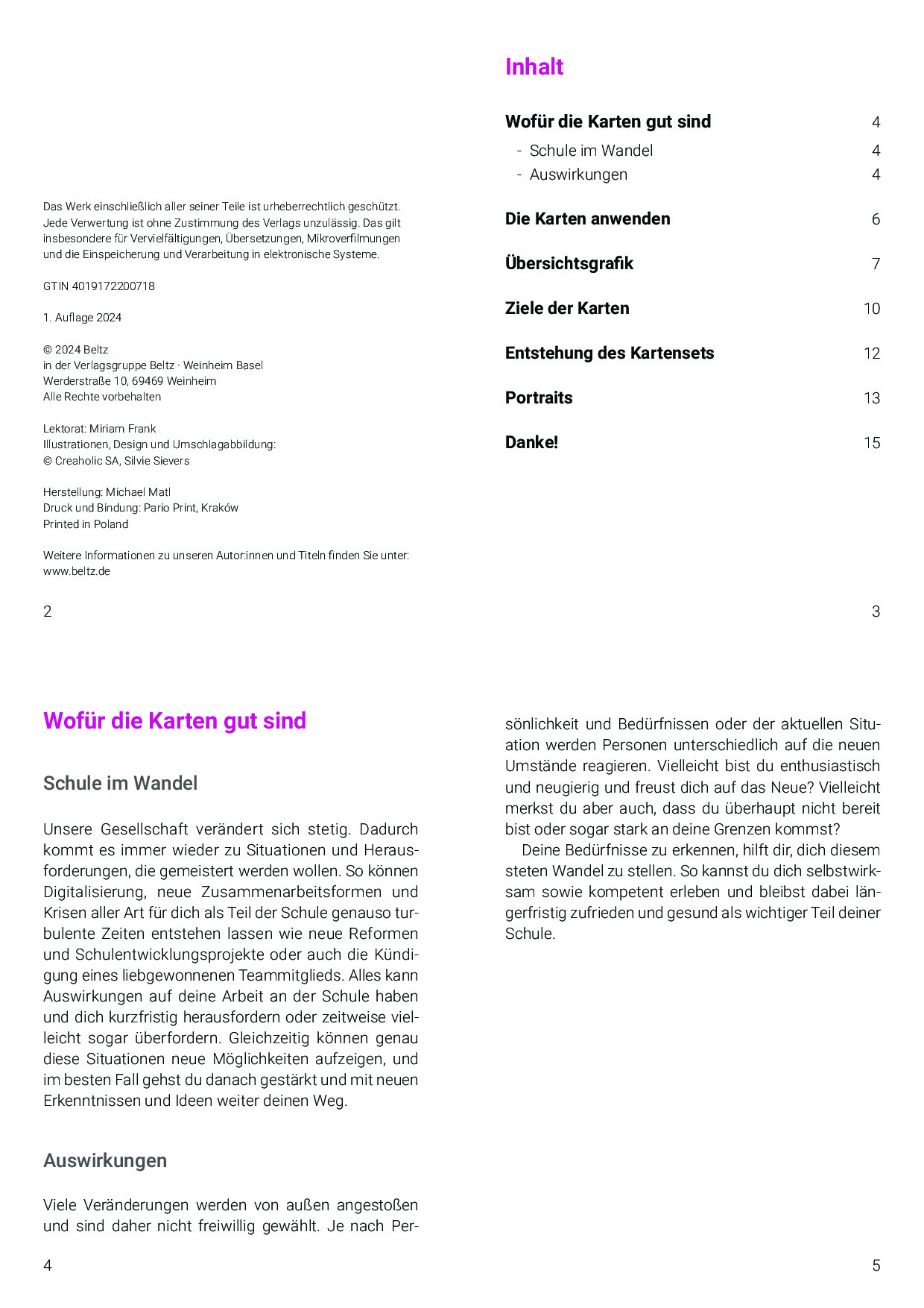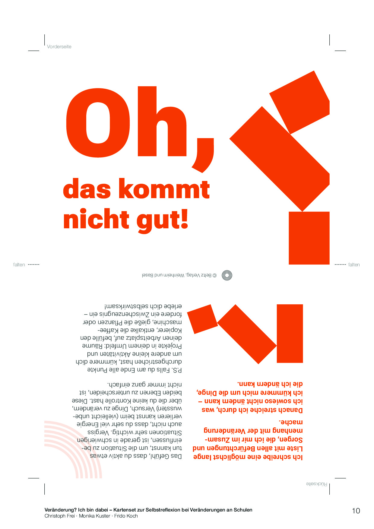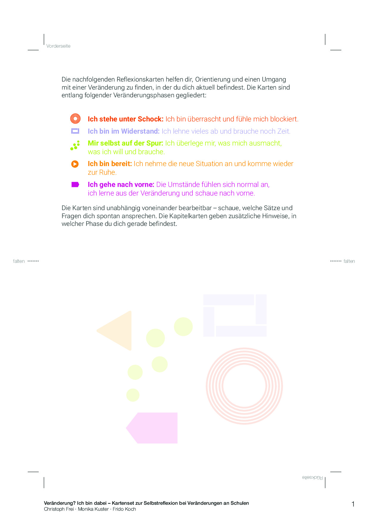 Das Kartenset unterstützt Lehrpersonen und Schulleitungen in Veränderungsprozessen. Die Impulskarten helfen, die aktuelle Situation in der Veränderung zu reflektieren und individuelle Orientierung zu finden. Sie halten konkrete Ansatzpunkte und Handlungsoptionen bereit, um selbstwirksam mit Veränderungen umzugehen. Die ansprechend gestalteten Karten leiten pointiert, mit Herz, Hand und Verstand übersichtlich durch die Phasen von Veränderungsprozessen. Sie sind direkt anwendbar und für das Selbstcoaching konzipiert, können aber auch zu zweit, in der Teamarbeit oder in Coaching und Beratung eingesetzt werden.