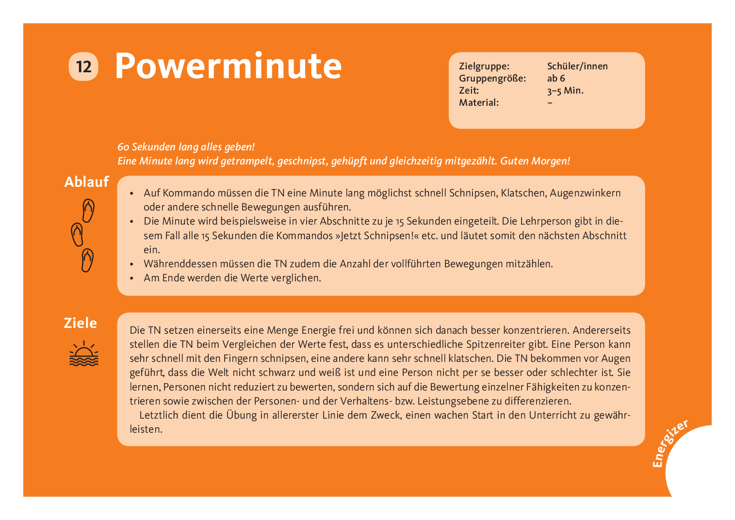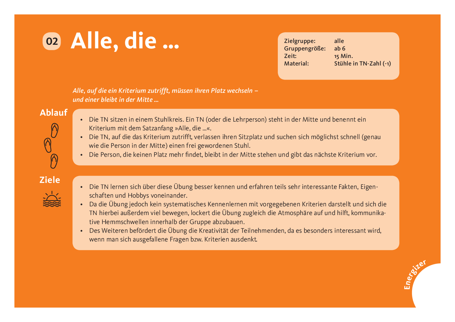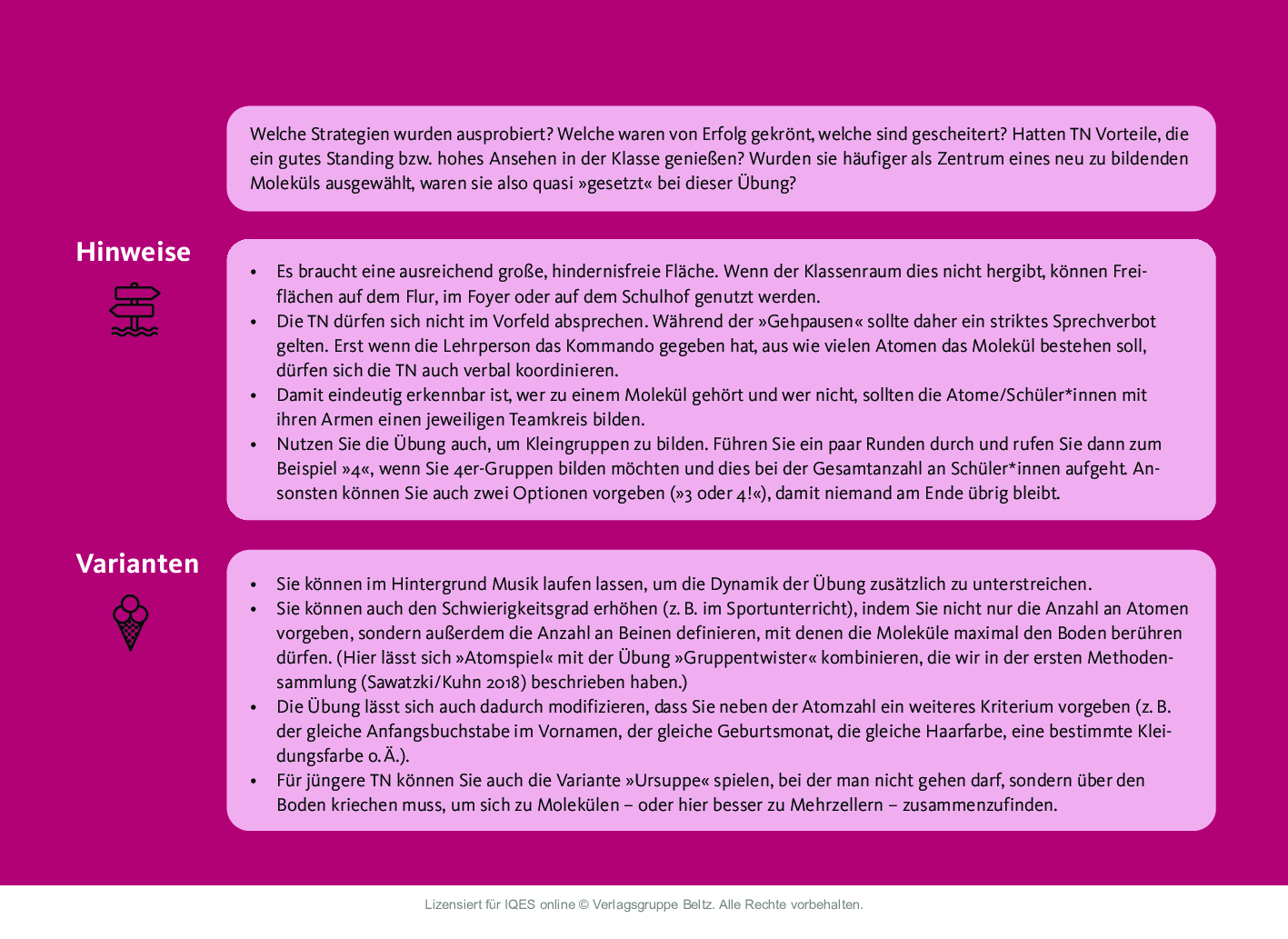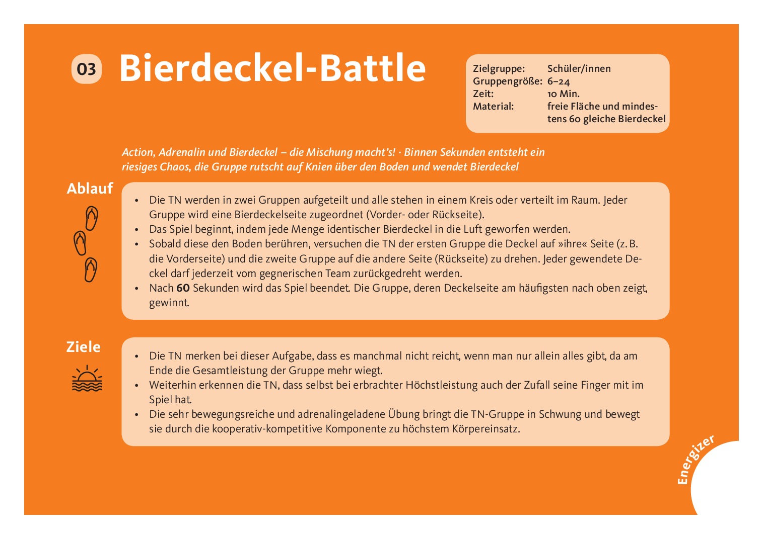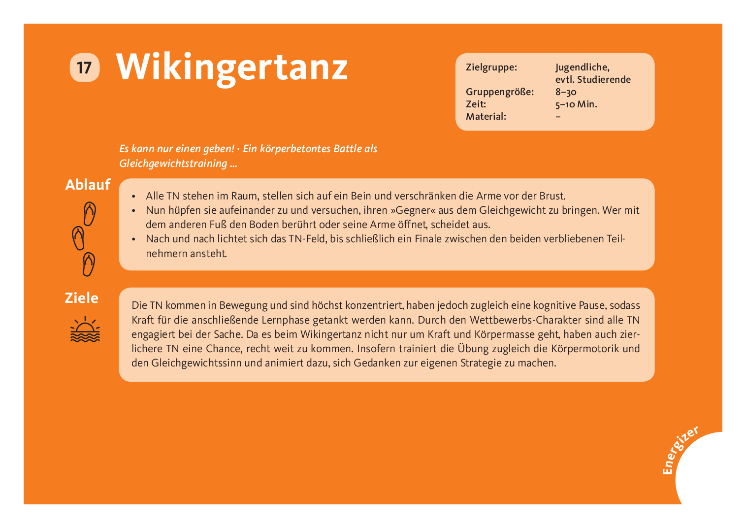 Die erfolgversprechenden Strategien bei dieser Übung sind vielfältig. Einerseits kann es geschickt sein, sich zunächst körperlich vermeintlich unterlegene Kontrahenten zu suchen und sich mit ihnen zu battlen. Andererseits ist es durchaus zielführend, wenn man Angriffe antäuscht oder Gegenangriffen ausweicht. Denn nicht nur der Bodycheck führt zum Erfolg, sondern ebenso das Zurückweichen, wenn man den richtigen Moment abpasst. Da die Übung recht schweißtreibend und aufwühlend sein kann, empfiehlt sich im Anschluss eine kurze gemeinsame Reflexionsrunde, um die TN wieder zu erden und herunterzuregulieren. Hierbei können die Gedanken und Gefühle während der Übung nachbesprochen werden oder ebenso die verschiedenen Kompetenzen, die vonnöten waren, und die diversen Strategien, die zum Einsatz gekommen sind. Idealerweise werden diese Kompetenzen und Strategien gemeinsam abstrahiert und auf andere Kontexte (etwa die Prüfungsvorbereitung) übertragen, um aus der Übung einen Mehrwert abzuleiten und sie als Metapher für fachliche Belange zu nutzen. (Auch die erfolgreiche Prüfungsvorbereitung benötigt ein gewisses Gleichgewicht aus Anspannung und Erholung, ein klares Ziel vor Augen etc.).