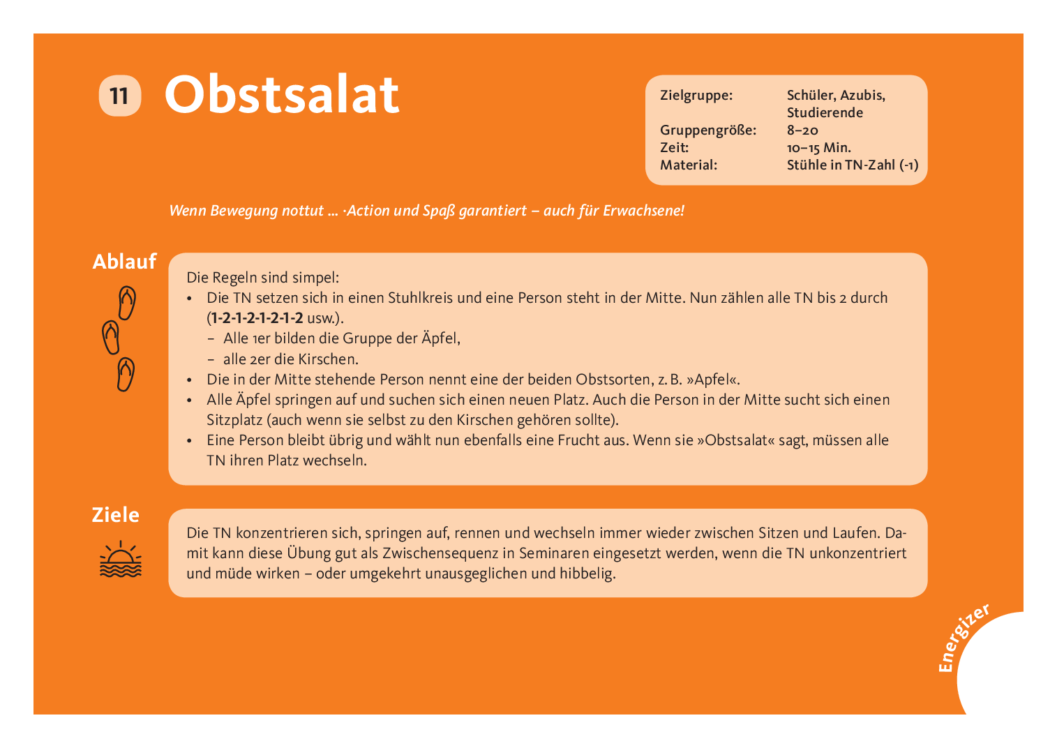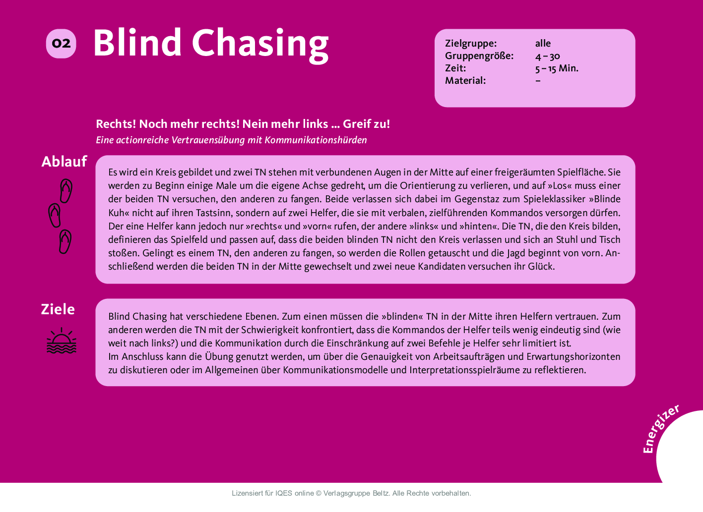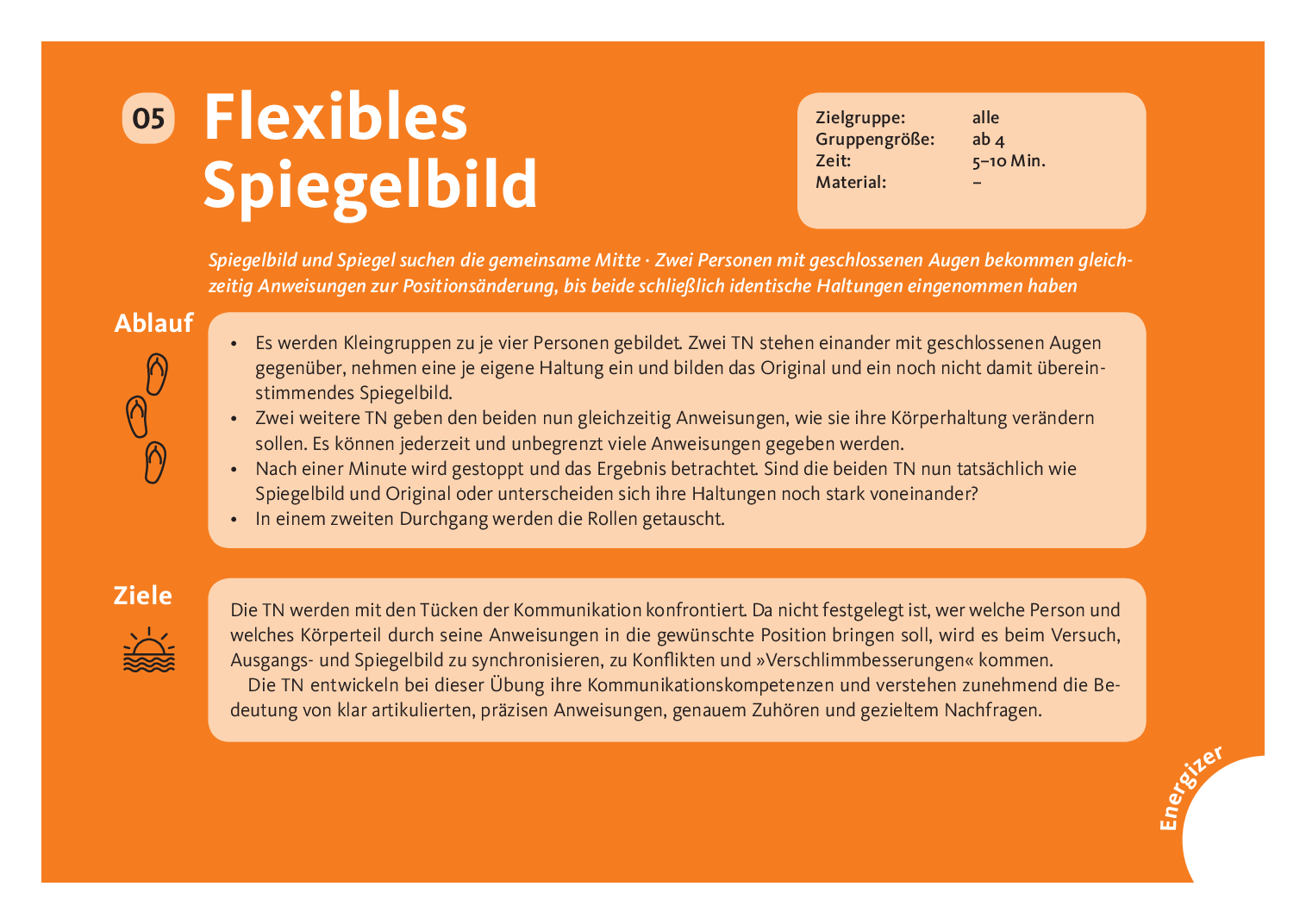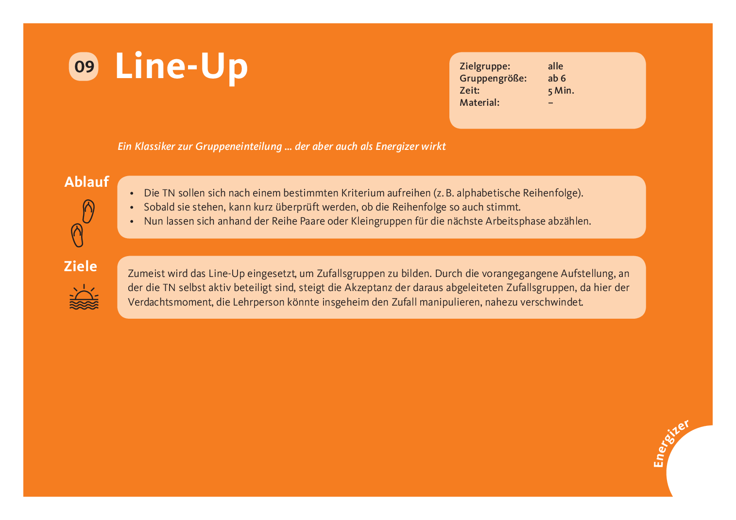 Die erfolgversprechenden Strategien bei dieser Übung sind vielfältig. Einerseits kann es geschickt sein, sich zunächst körperlich vermeintlich unterlegene Kontrahenten zu suchen und sich mit ihnen zu battlen. Andererseits ist es durchaus zielführend, wenn man Angriffe antäuscht oder Gegenangriffen ausweicht. Denn nicht nur der Bodycheck führt zum Erfolg, sondern ebenso das Zurückweichen, wenn man den richtigen Moment abpasst. Da die Übung recht schweißtreibend und aufwühlend sein kann, empfiehlt sich im Anschluss eine kurze gemeinsame Reflexionsrunde, um die TN wieder zu erden und herunterzuregulieren. Hierbei können die Gedanken und Gefühle während der Übung nachbesprochen werden oder ebenso die verschiedenen Kompetenzen, die vonnöten waren, und die diversen Strategien, die zum Einsatz gekommen sind. Idealerweise werden diese Kompetenzen und Strategien gemeinsam abstrahiert und auf andere Kontexte (etwa die Prüfungsvorbereitung) übertragen, um aus der Übung einen Mehrwert abzuleiten und sie als Metapher für fachliche Belange zu nutzen. (Auch die erfolgreiche Prüfungsvorbereitung benötigt ein gewisses Gleichgewicht aus Anspannung und Erholung, ein klares Ziel vor Augen etc.).