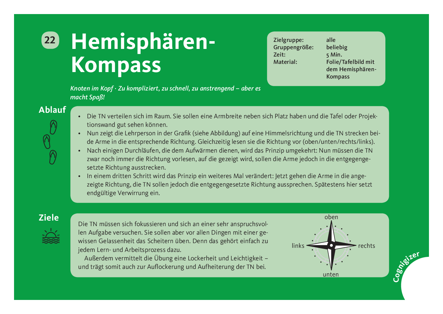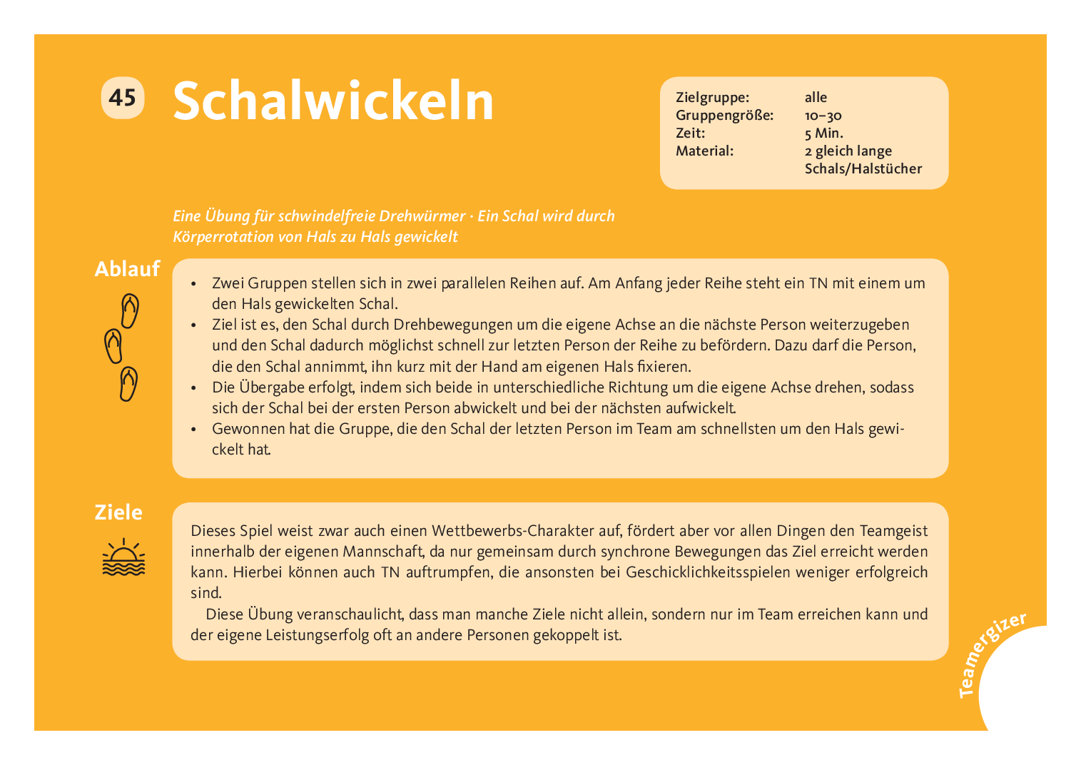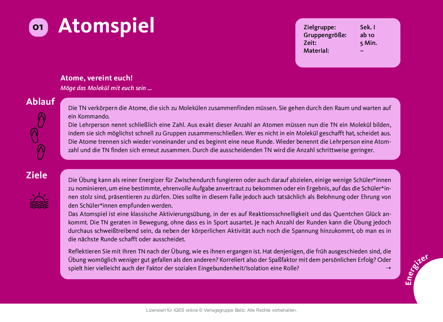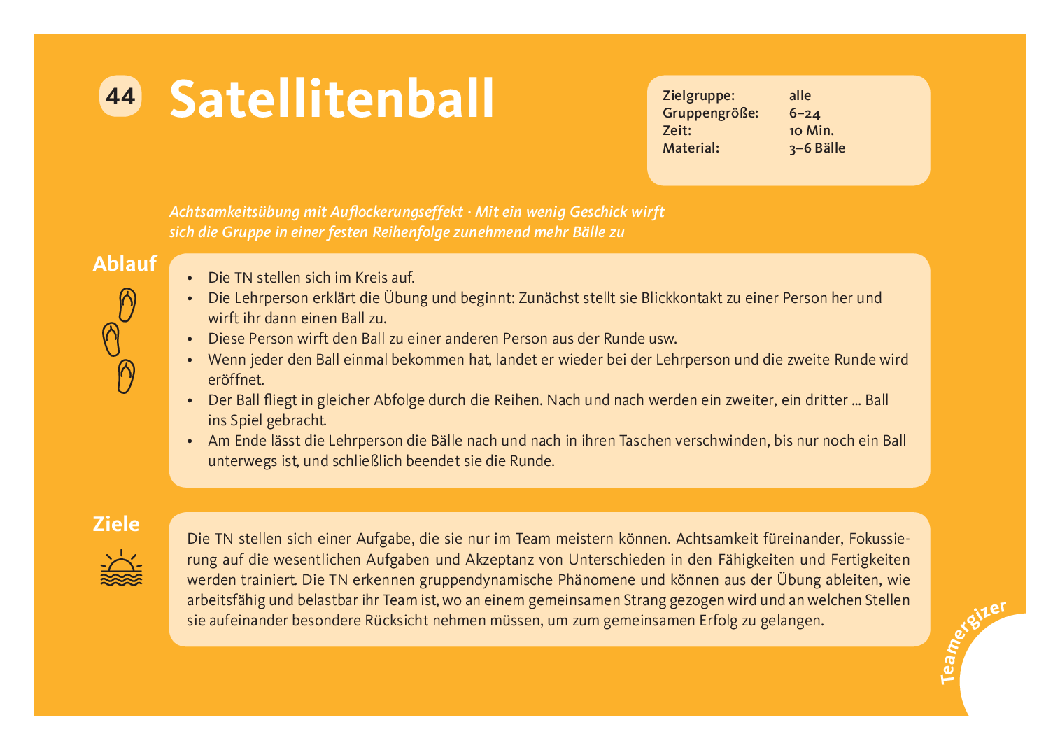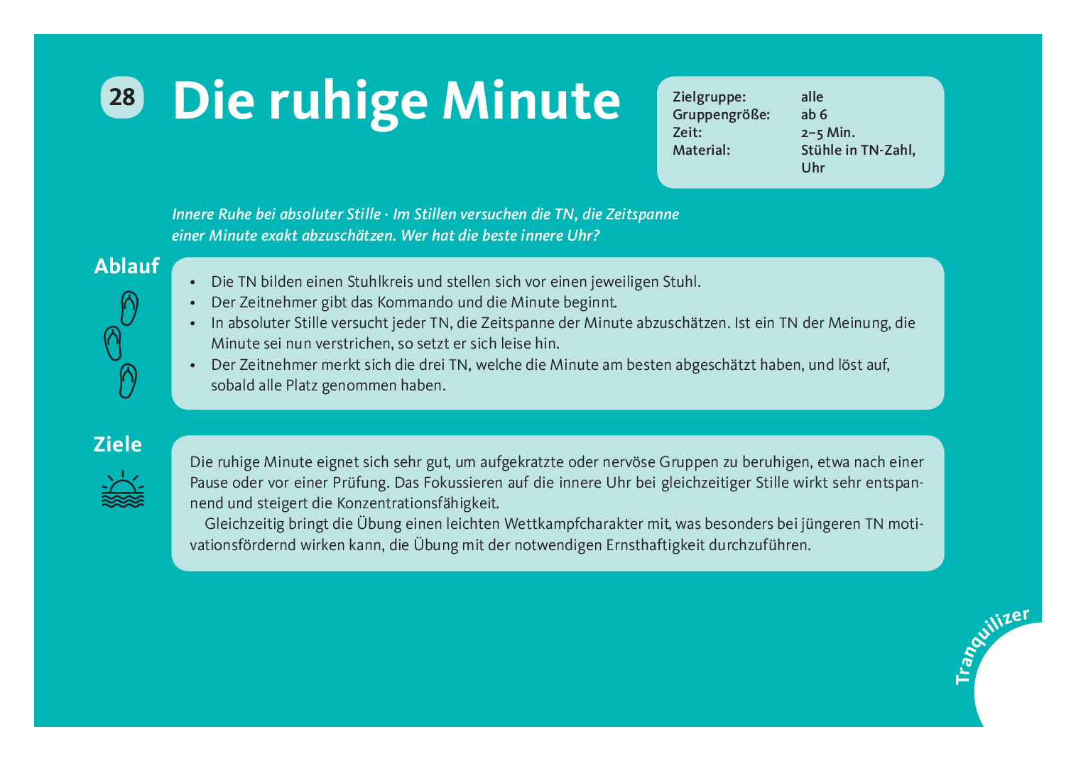 Die erfolgversprechenden Strategien bei dieser Übung sind vielfältig. Einerseits kann es geschickt sein, sich zunächst körperlich vermeintlich unterlegene Kontrahenten zu suchen und sich mit ihnen zu battlen. Andererseits ist es durchaus zielführend, wenn man Angriffe antäuscht oder Gegenangriffen ausweicht. Denn nicht nur der Bodycheck führt zum Erfolg, sondern ebenso das Zurückweichen, wenn man den richtigen Moment abpasst. Da die Übung recht schweißtreibend und aufwühlend sein kann, empfiehlt sich im Anschluss eine kurze gemeinsame Reflexionsrunde, um die TN wieder zu erden und herunterzuregulieren. Hierbei können die Gedanken und Gefühle während der Übung nachbesprochen werden oder ebenso die verschiedenen Kompetenzen, die vonnöten waren, und die diversen Strategien, die zum Einsatz gekommen sind. Idealerweise werden diese Kompetenzen und Strategien gemeinsam abstrahiert und auf andere Kontexte (etwa die Prüfungsvorbereitung) übertragen, um aus der Übung einen Mehrwert abzuleiten und sie als Metapher für fachliche Belange zu nutzen. (Auch die erfolgreiche Prüfungsvorbereitung benötigt ein gewisses Gleichgewicht aus Anspannung und Erholung, ein klares Ziel vor Augen etc.).
