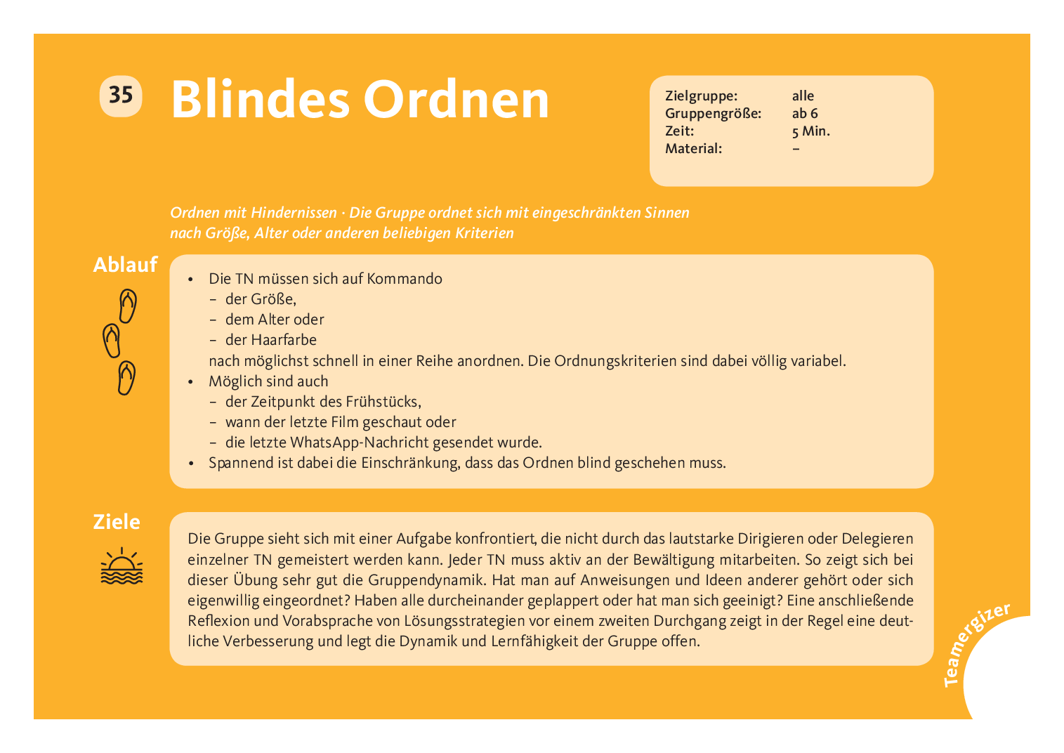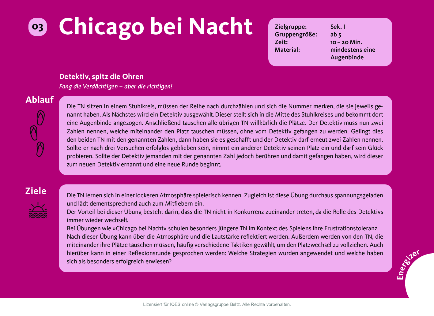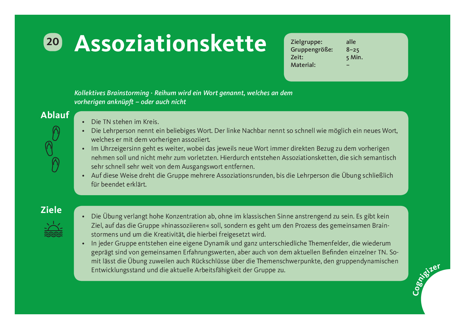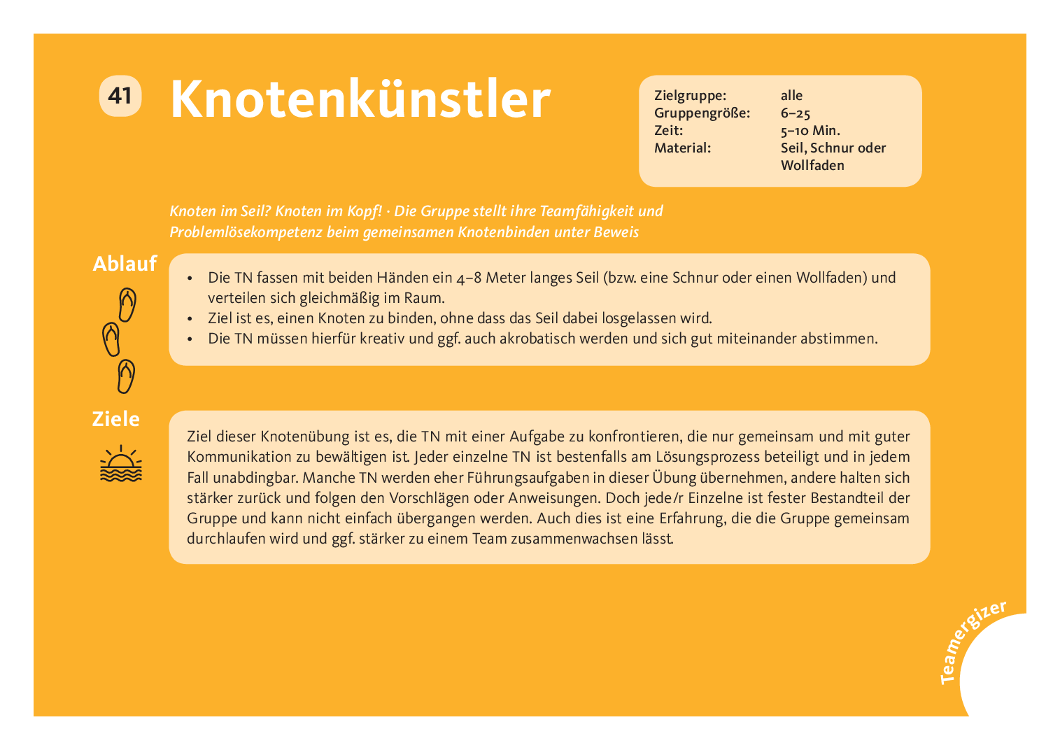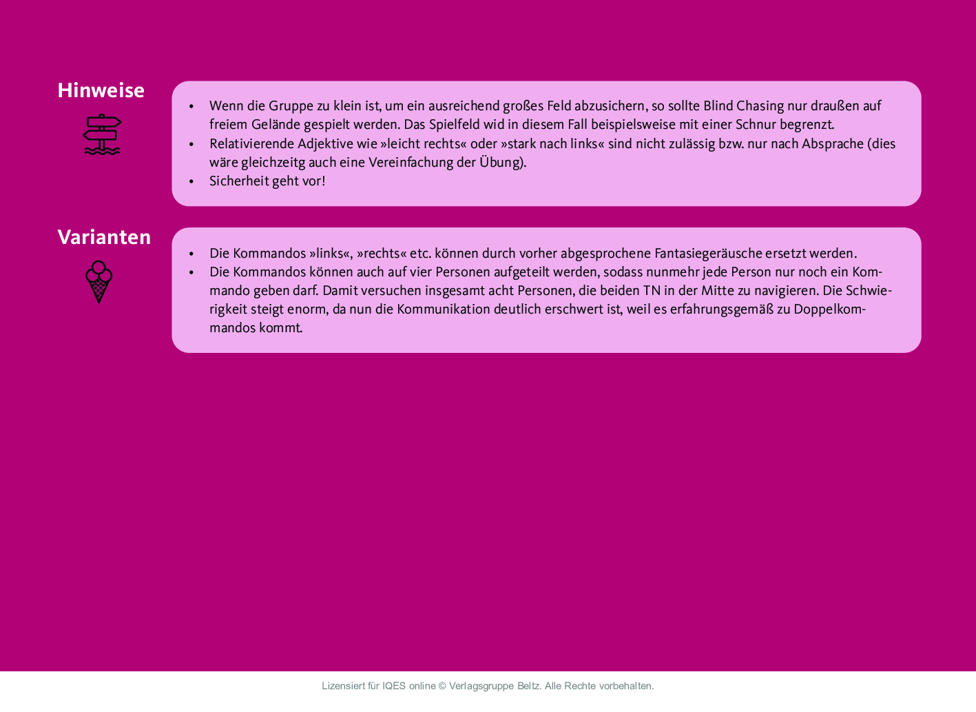 Die erfolgversprechenden Strategien bei dieser Übung sind vielfältig. Einerseits kann es geschickt sein, sich zunächst körperlich vermeintlich unterlegene Kontrahenten zu suchen und sich mit ihnen zu battlen. Andererseits ist es durchaus zielführend, wenn man Angriffe antäuscht oder Gegenangriffen ausweicht. Denn nicht nur der Bodycheck führt zum Erfolg, sondern ebenso das Zurückweichen, wenn man den richtigen Moment abpasst. Da die Übung recht schweißtreibend und aufwühlend sein kann, empfiehlt sich im Anschluss eine kurze gemeinsame Reflexionsrunde, um die TN wieder zu erden und herunterzuregulieren. Hierbei können die Gedanken und Gefühle während der Übung nachbesprochen werden oder ebenso die verschiedenen Kompetenzen, die vonnöten waren, und die diversen Strategien, die zum Einsatz gekommen sind. Idealerweise werden diese Kompetenzen und Strategien gemeinsam abstrahiert und auf andere Kontexte (etwa die Prüfungsvorbereitung) übertragen, um aus der Übung einen Mehrwert abzuleiten und sie als Metapher für fachliche Belange zu nutzen. (Auch die erfolgreiche Prüfungsvorbereitung benötigt ein gewisses Gleichgewicht aus Anspannung und Erholung, ein klares Ziel vor Augen etc.).