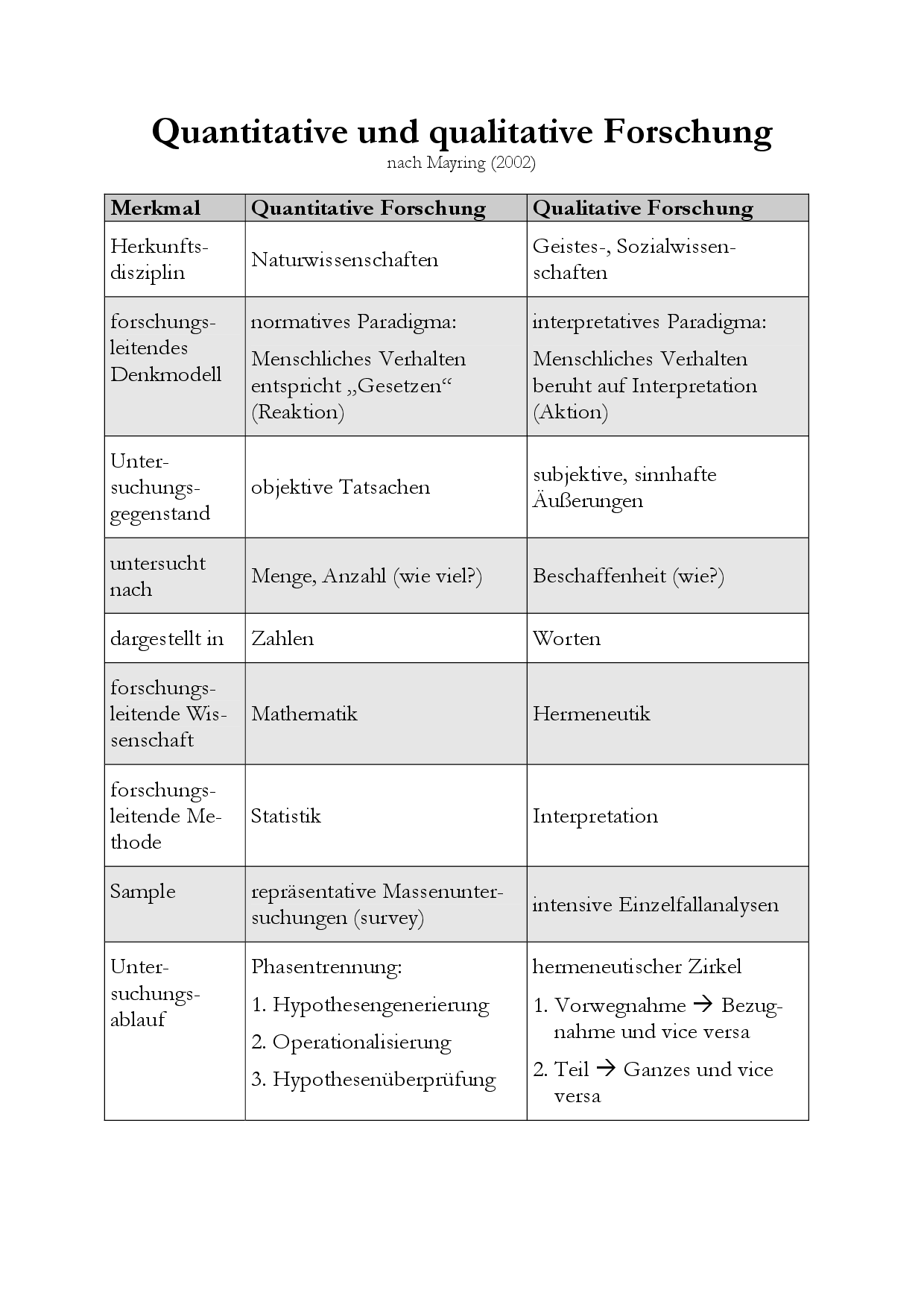 Anhand des Buch »Einführung in die qualitative Sozialforschung«, das in den ersten beiden Kapiteln in die Geschichte und Theorie qualitativen Denkens einführt, haben meine frühere Wissenschaftliche Mitarbeiterin Dr. Silja Schoett (Universität Lüneburg) und ich ein Schaubild zur Gegenüberstellung der Merkmale quantitativer und qualitativer Methoden erarbeitet, mit dem wir häufig in Seminaren der Lehramtsausbildung gearbeitet haben. Dieses Schaubild soll hier als vertiefendes Material zugänglich gemacht werden; es stützt sich auf die 5. Auflage des Buches von 2002.